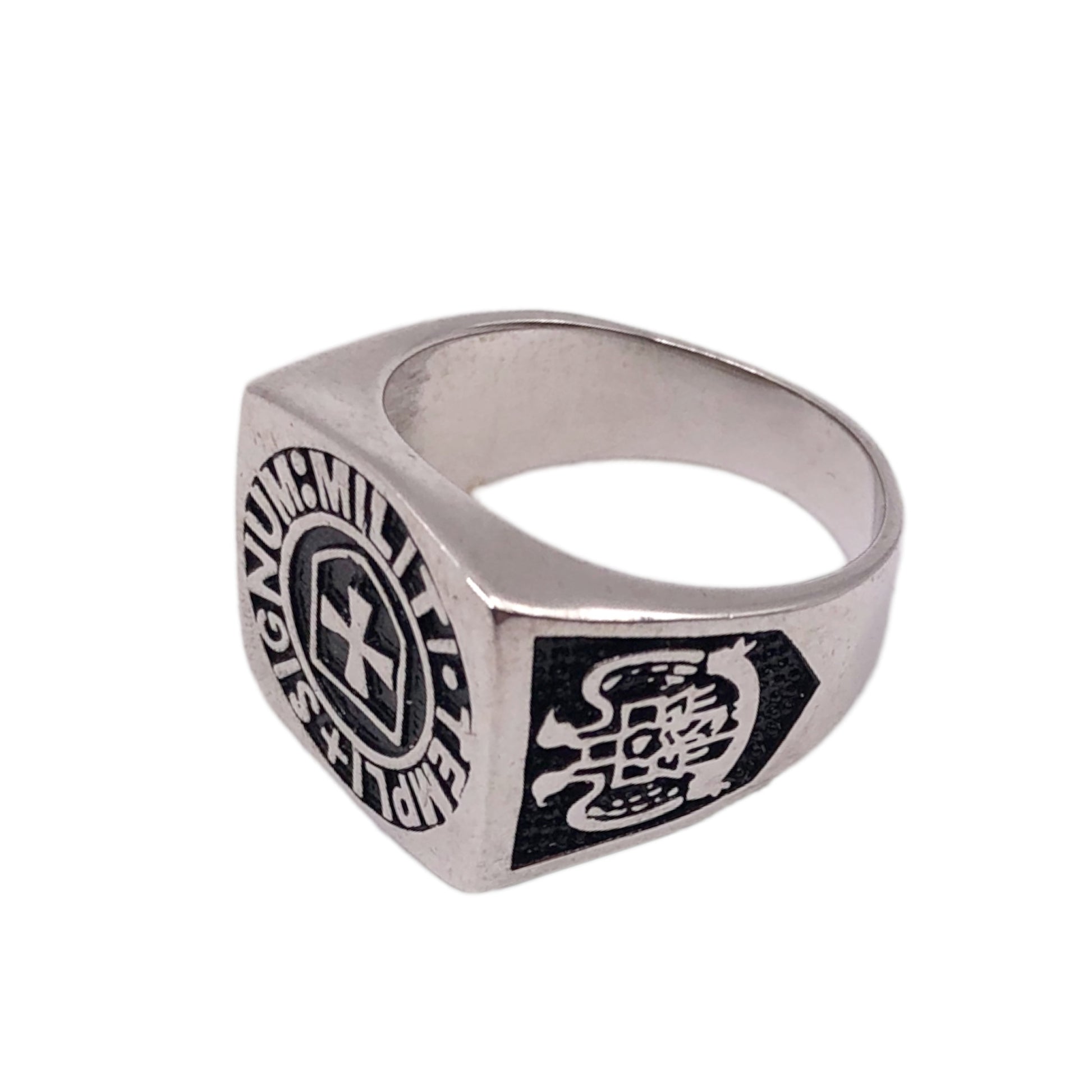 Anello da uomo rettangolare realizzato in argento impreziosito da lavorazioni di incisione su una base nera. Misura anello 21