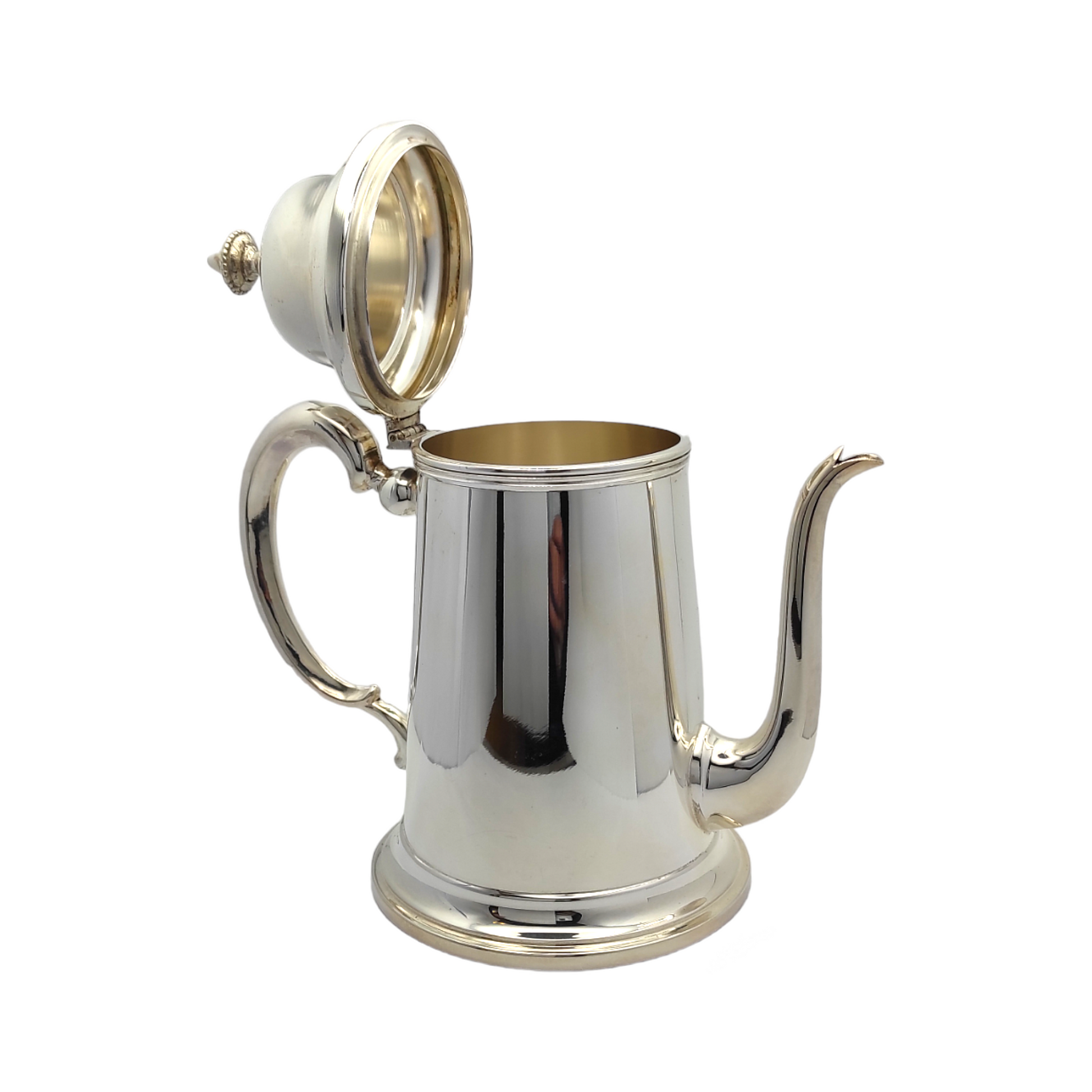 Caffettiera in argento 800 lavorata a mano dall'azienda Pietrasanta Gianni, superficie lucida con manico e versatoio dalle linee morbide che gli donano eleganza. Il coperchio presenta una chiusura a cerniera e la presa ha decorazioni stile Impero. Disponibile in 2 misure: