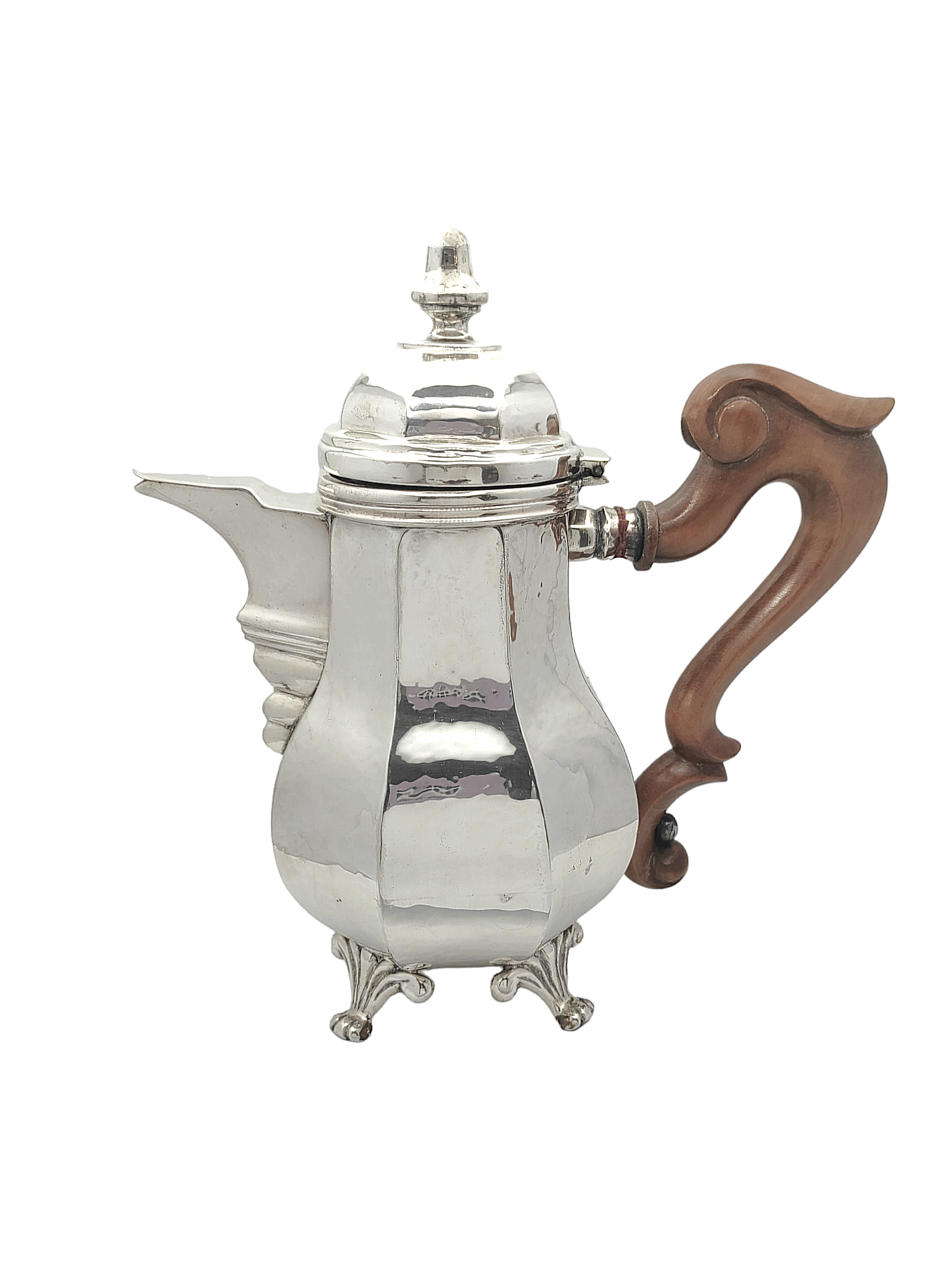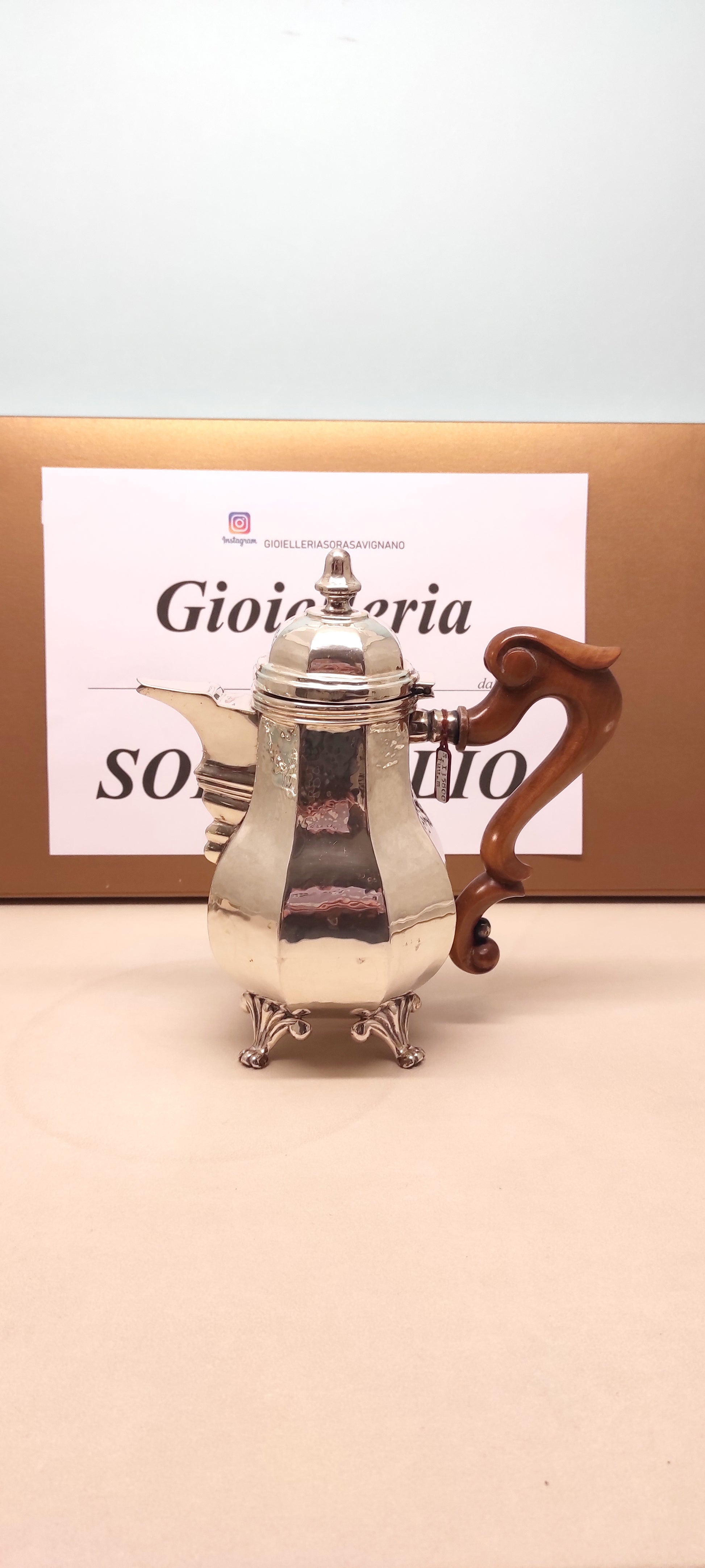 Caffettiera realizzata a mano in argento 800 con lavorazioni di battitura, piedini e manico decorati, coperchio a cerniera. Dimensioni prodotto: altezza 22 cm, larghezza 20 cm, peso 655 gr