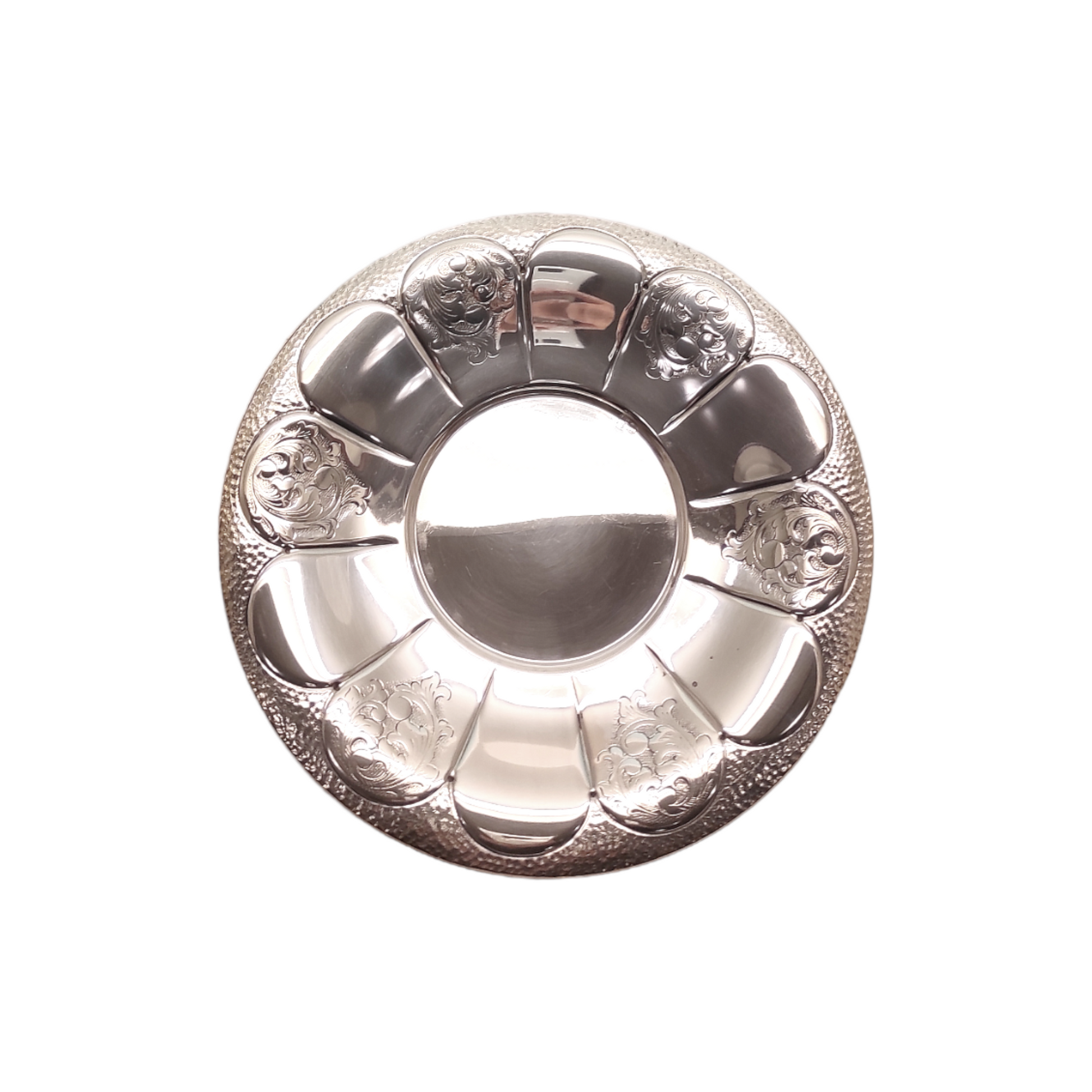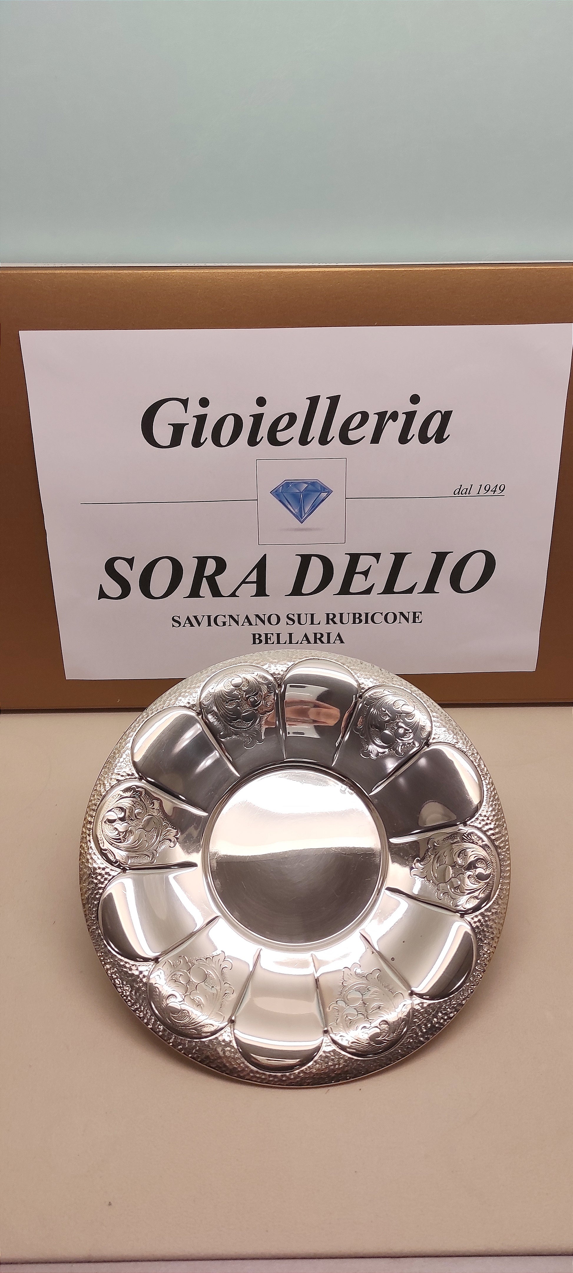 Centrotavola rotondo decorato con motivi floreali stile Vintage, realizzato a mano dall'azienda Pietrasanta Gianni in argento 800. I decori sono eseguiti con tecniche di cesellatura e battitura a mano. Diametro prodotto 21cm, altezza 1 cm, peso totale 201 gr