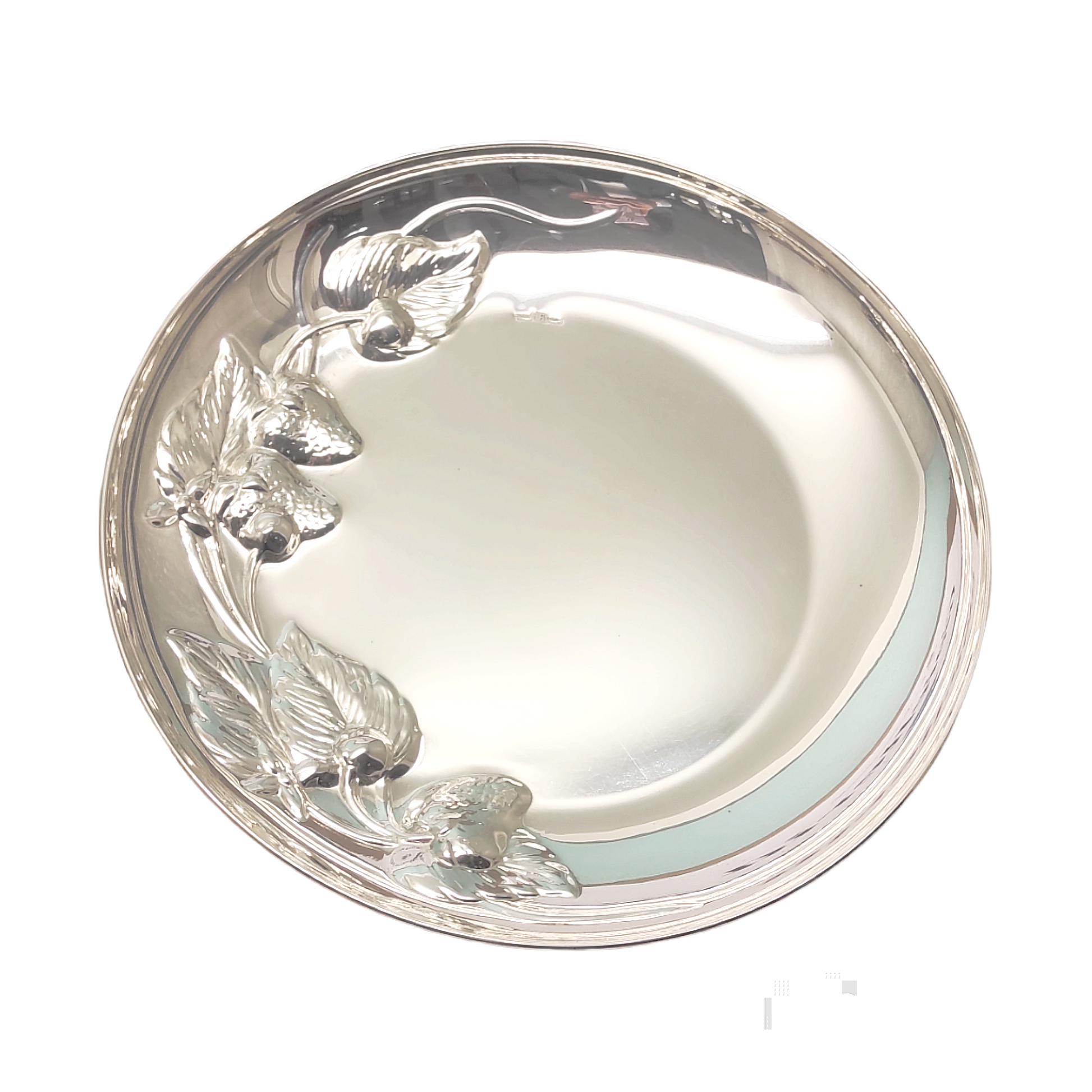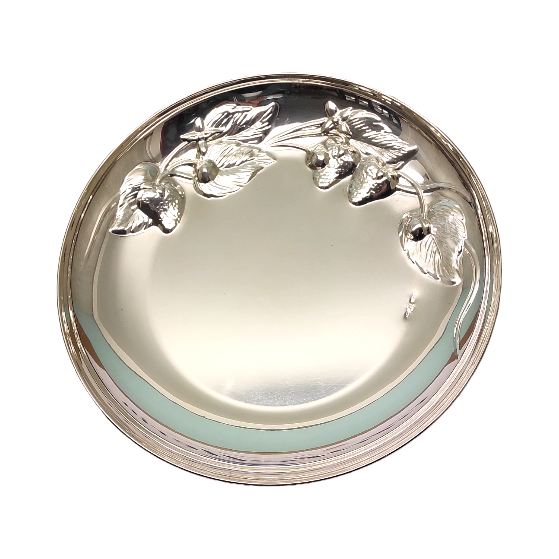 Centrotavola rotondo lavorato interamente a mano dalla superficie lucida e bordi decorati a forma di fragole eseguiti con tecniche di battitura dell'argento. Diametro articolo 27,5 cm altezza 3,5 cm, peso totale 380 gr