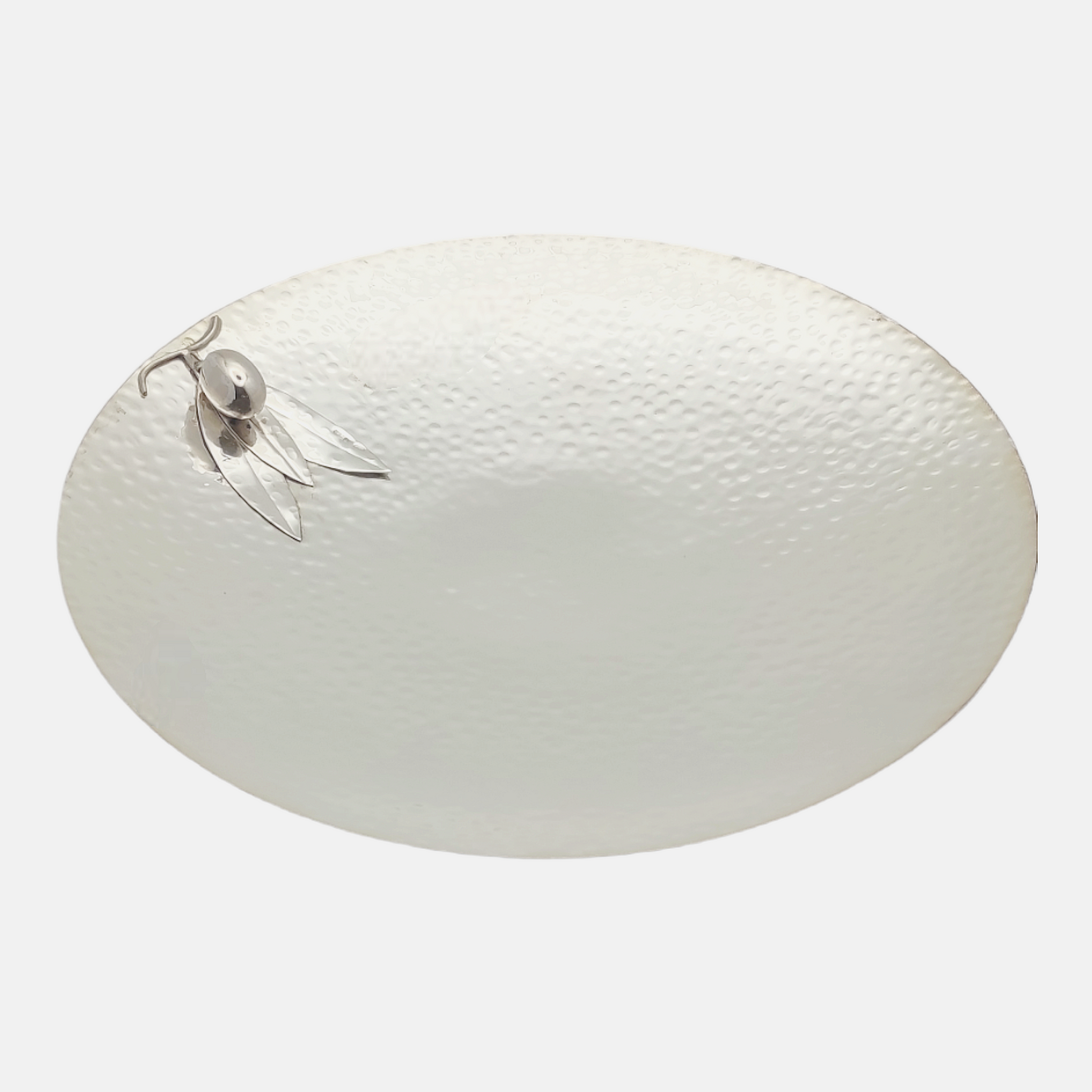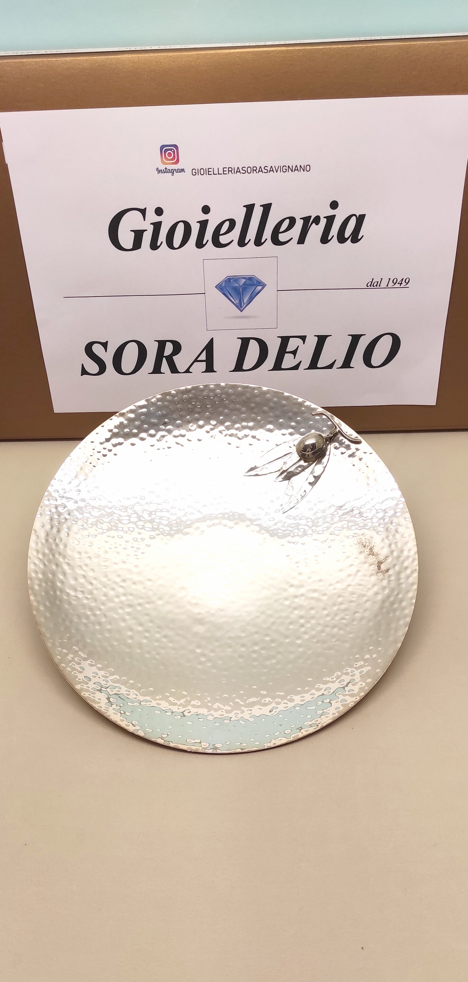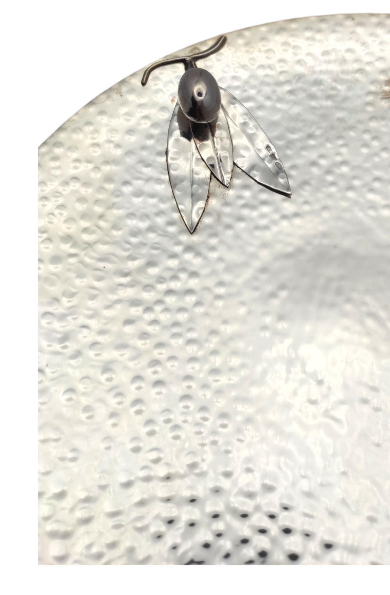 Centrotavola realizzato in argento 925 battuto a mano con decorazione a forma di oliva con due foglie. Diametro 25 cm, peso totale 257 gr