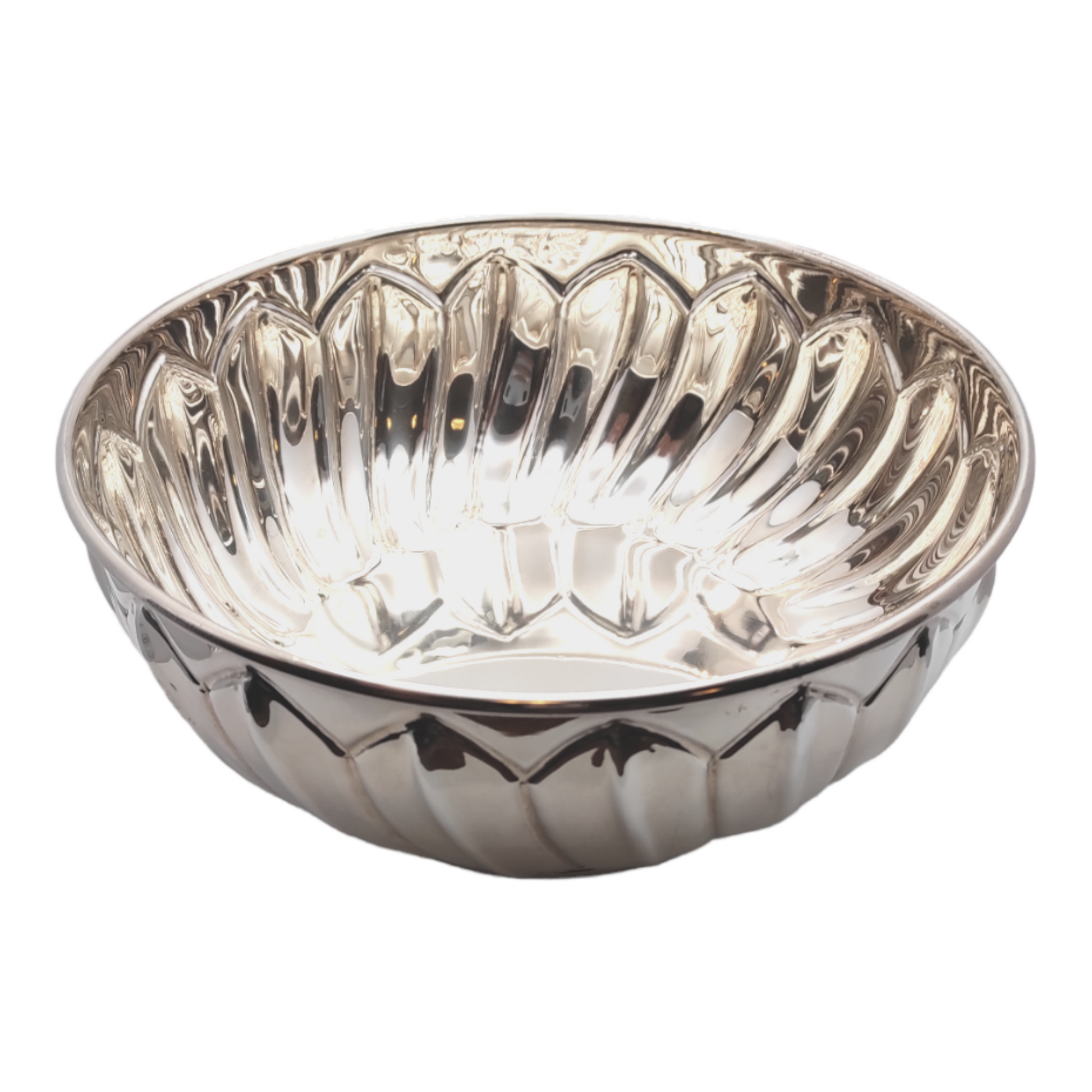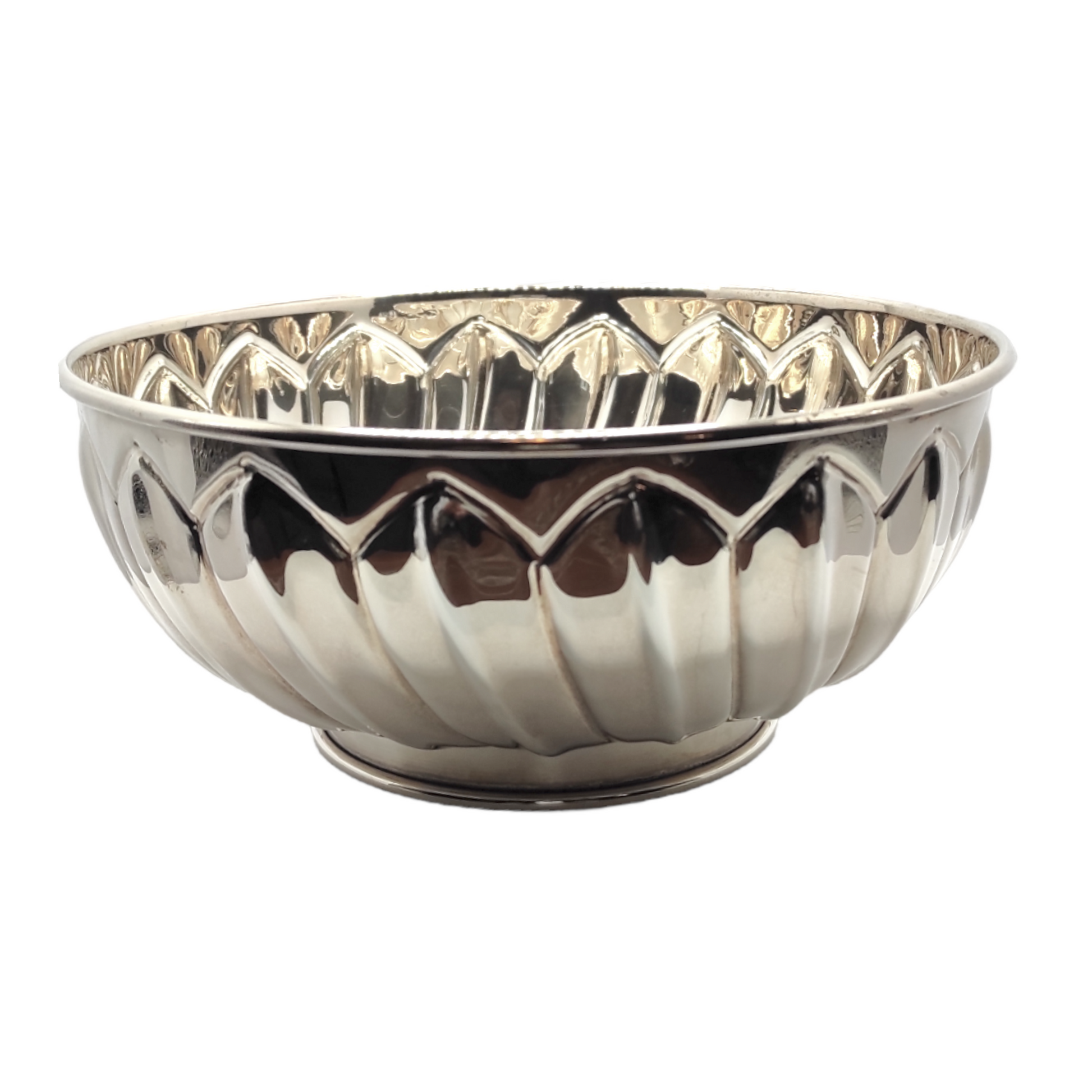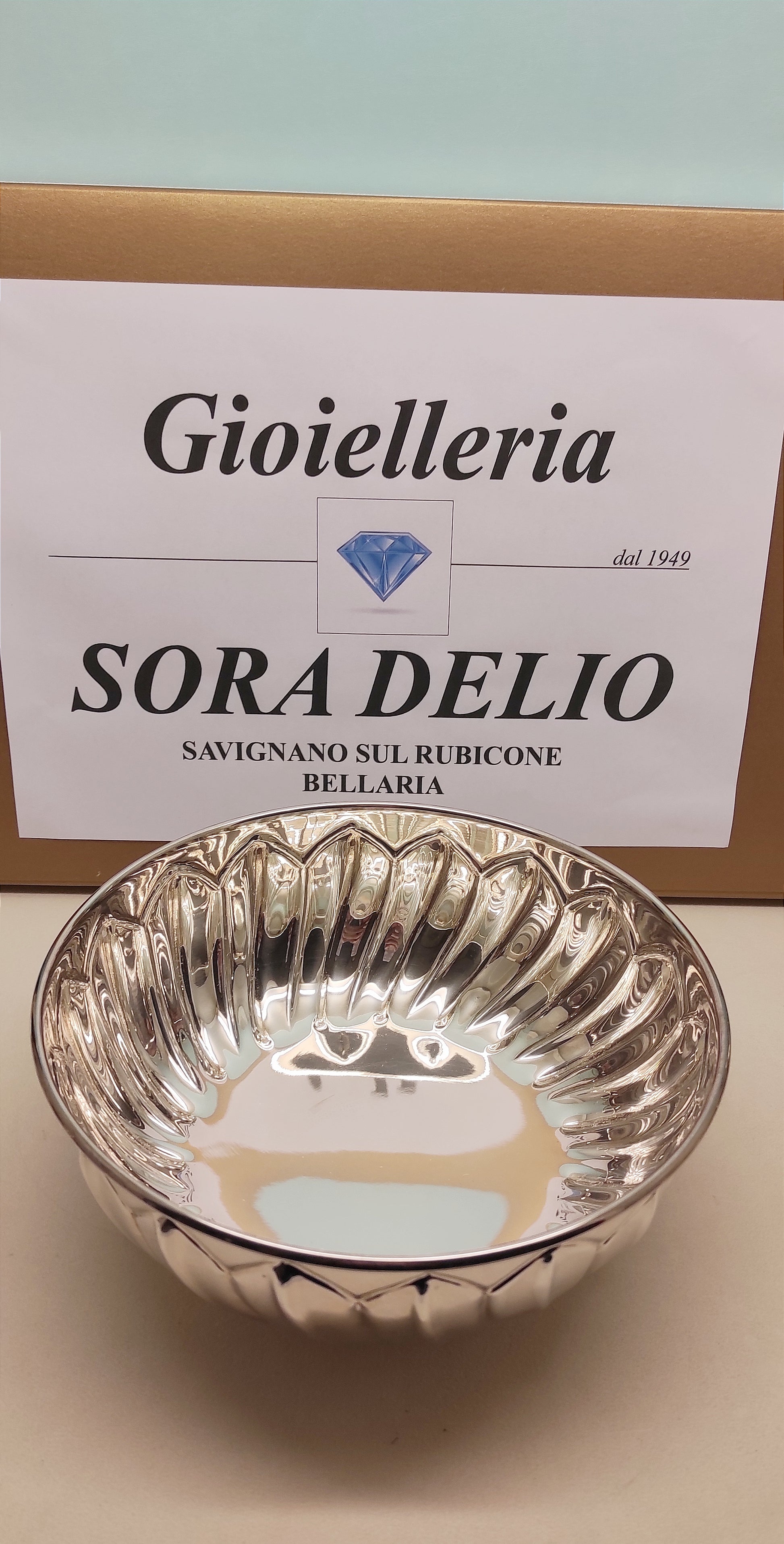 Centrotavola tondo realizzato in argento 800 interamente lavorato a mano, superficie lucida con decorazioni stile Fesonato. Disponibile in 2 misure: