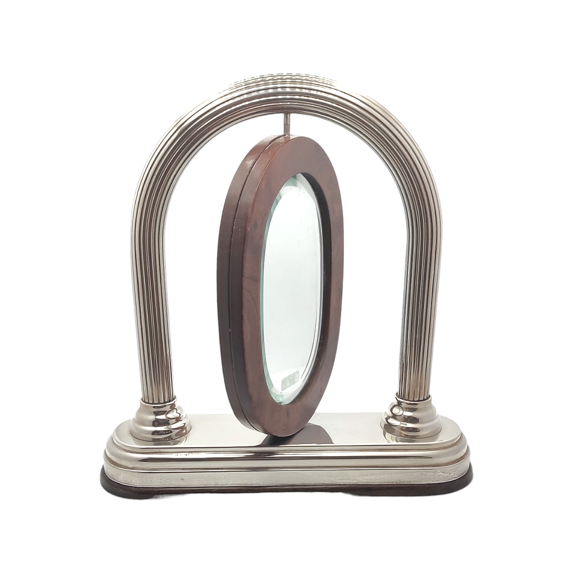 Bellissima cornice realizzata in argento 925 con oblò in legno e cristallo. Dimensioni prodotto: altezza 21 cm, larghezza arco 16,5 cm, larghezza base 21,3 cm