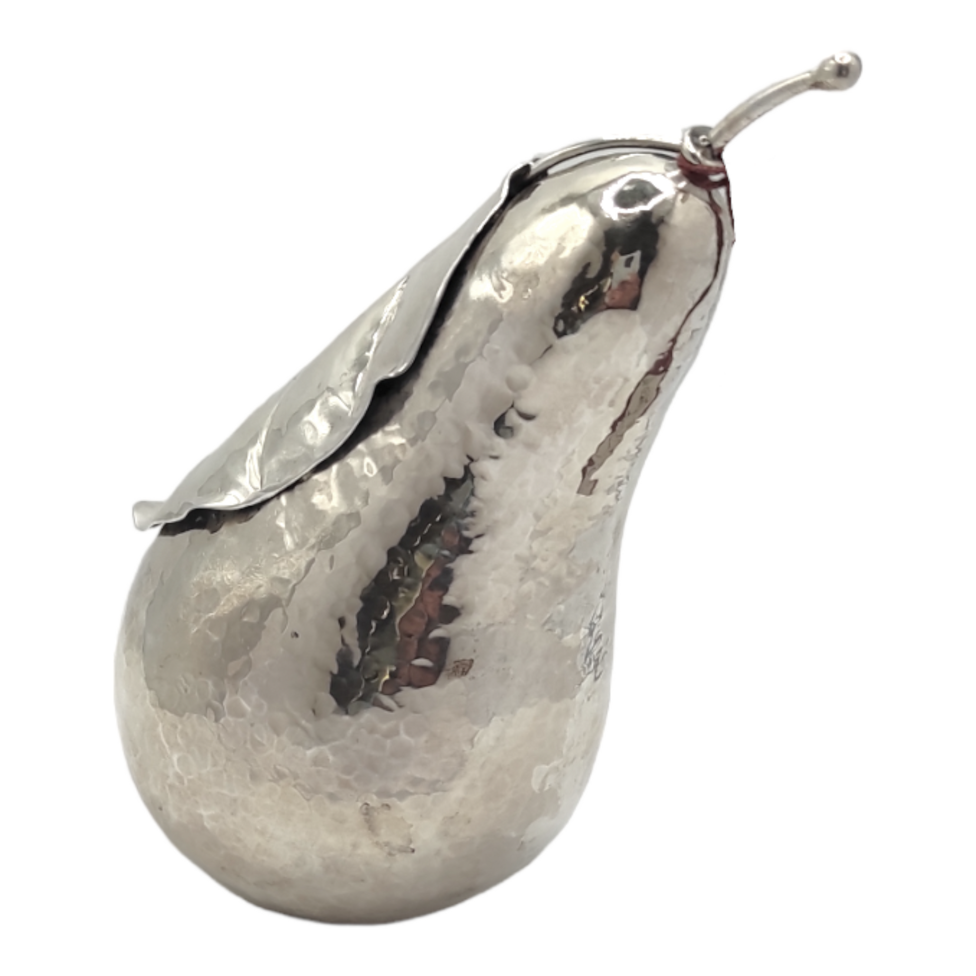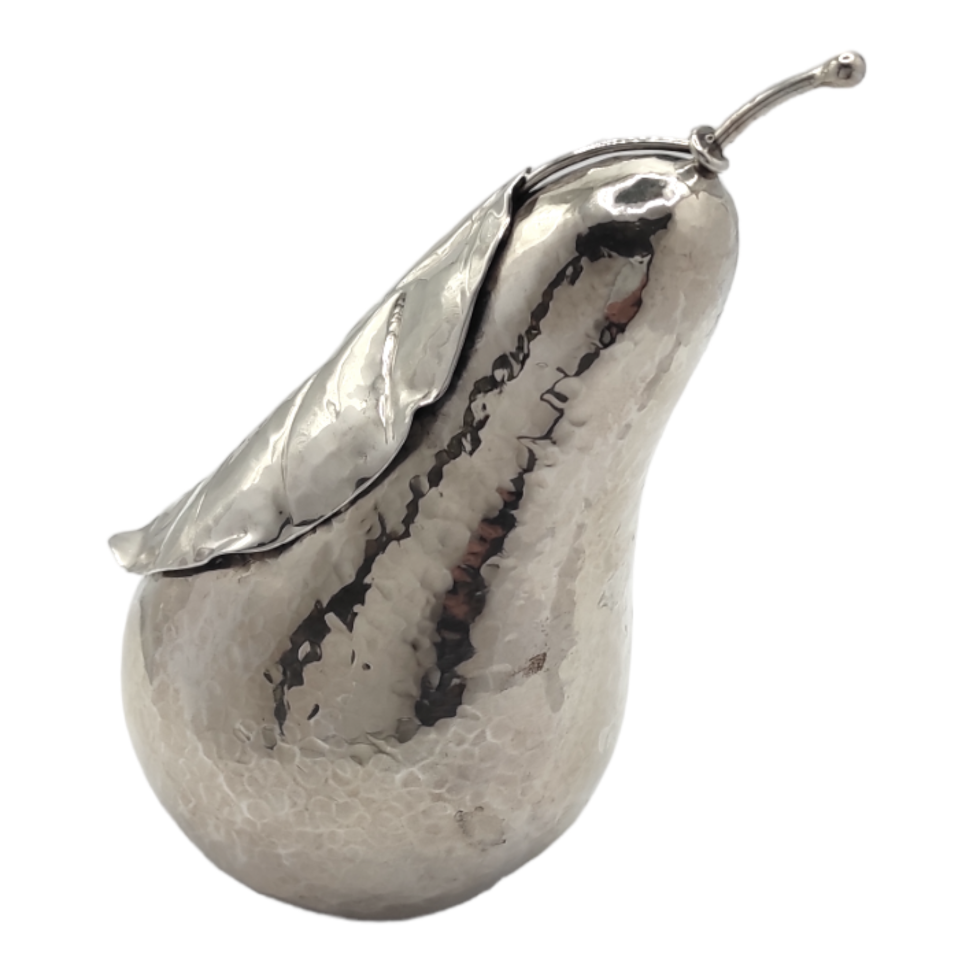 Decorazione a forma di pera lavorata interamente a mano realizzata in argento battuto. Dimensioni articolo: altezza 20 cm, peso totale 81 gr