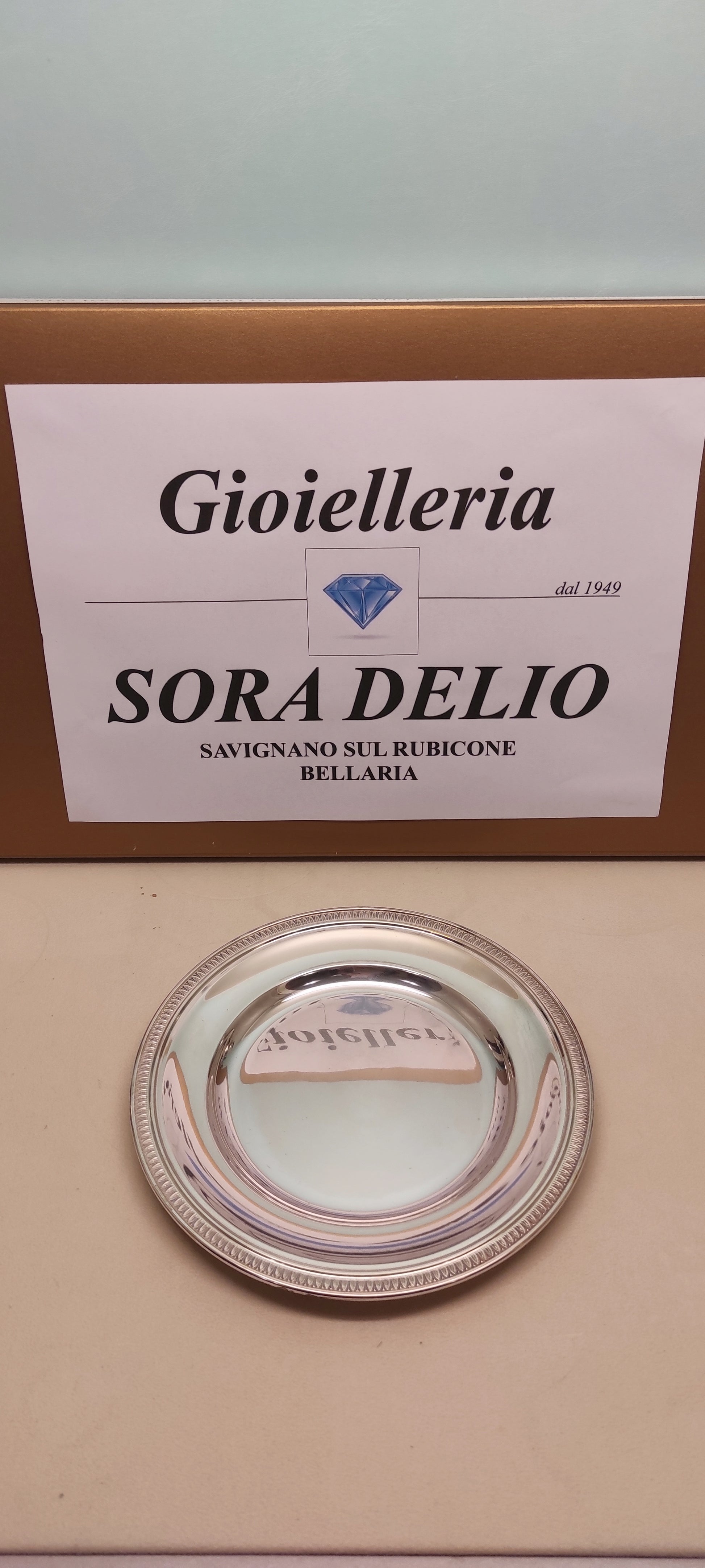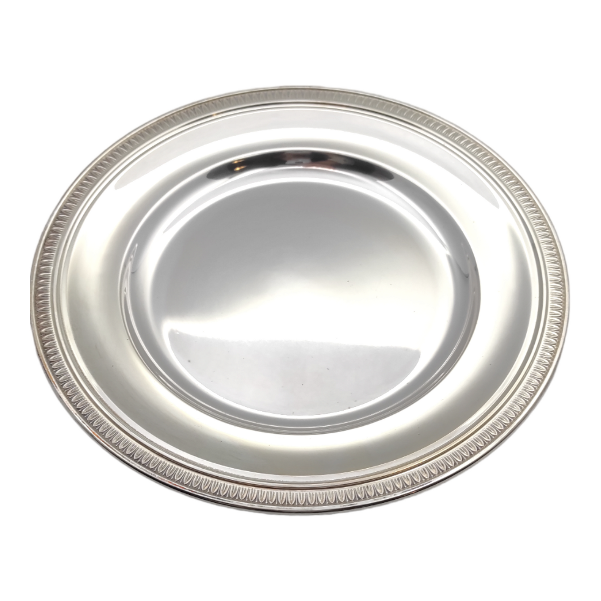 Piatto in argento 800 con bordatura stile impero. Diametro del prodotto 19,5 cm, peso totale 196 gr.