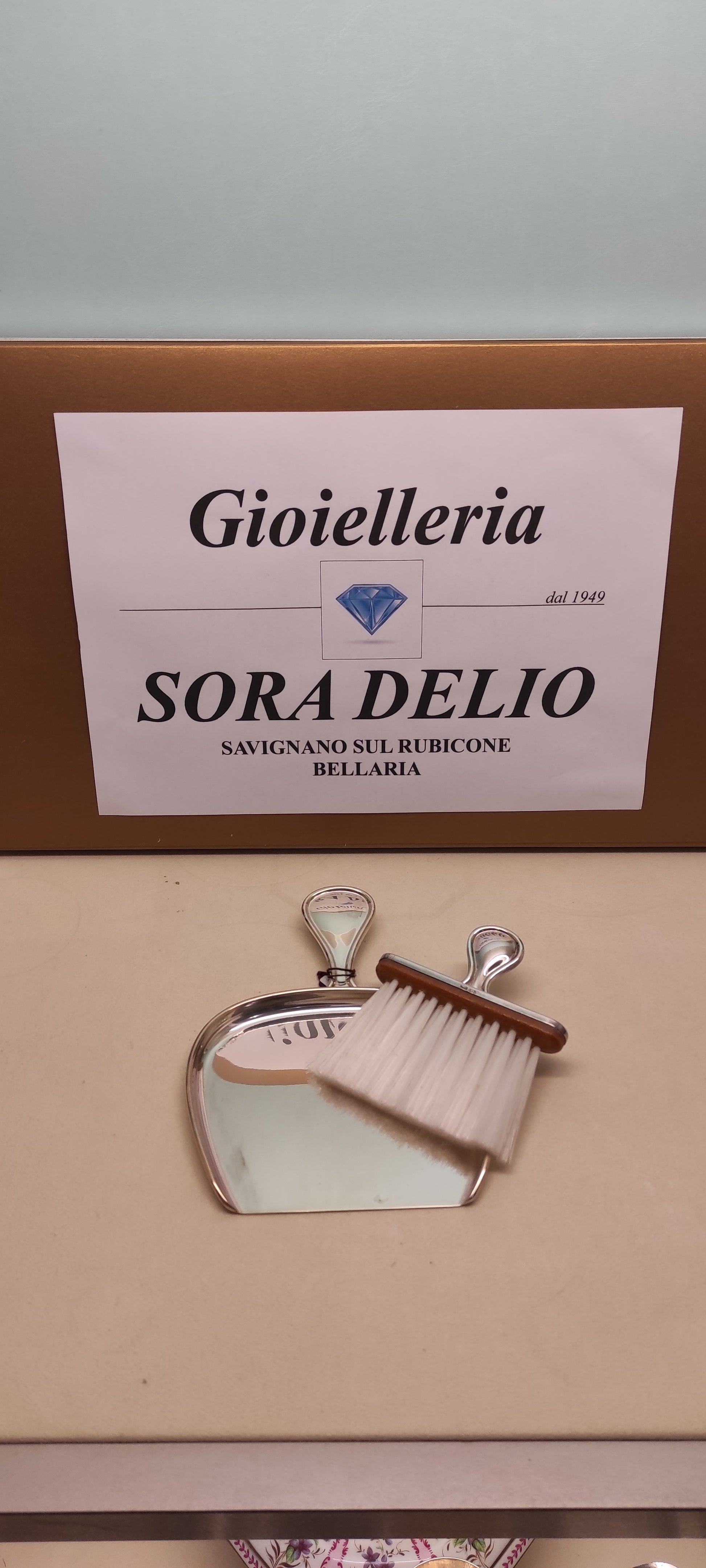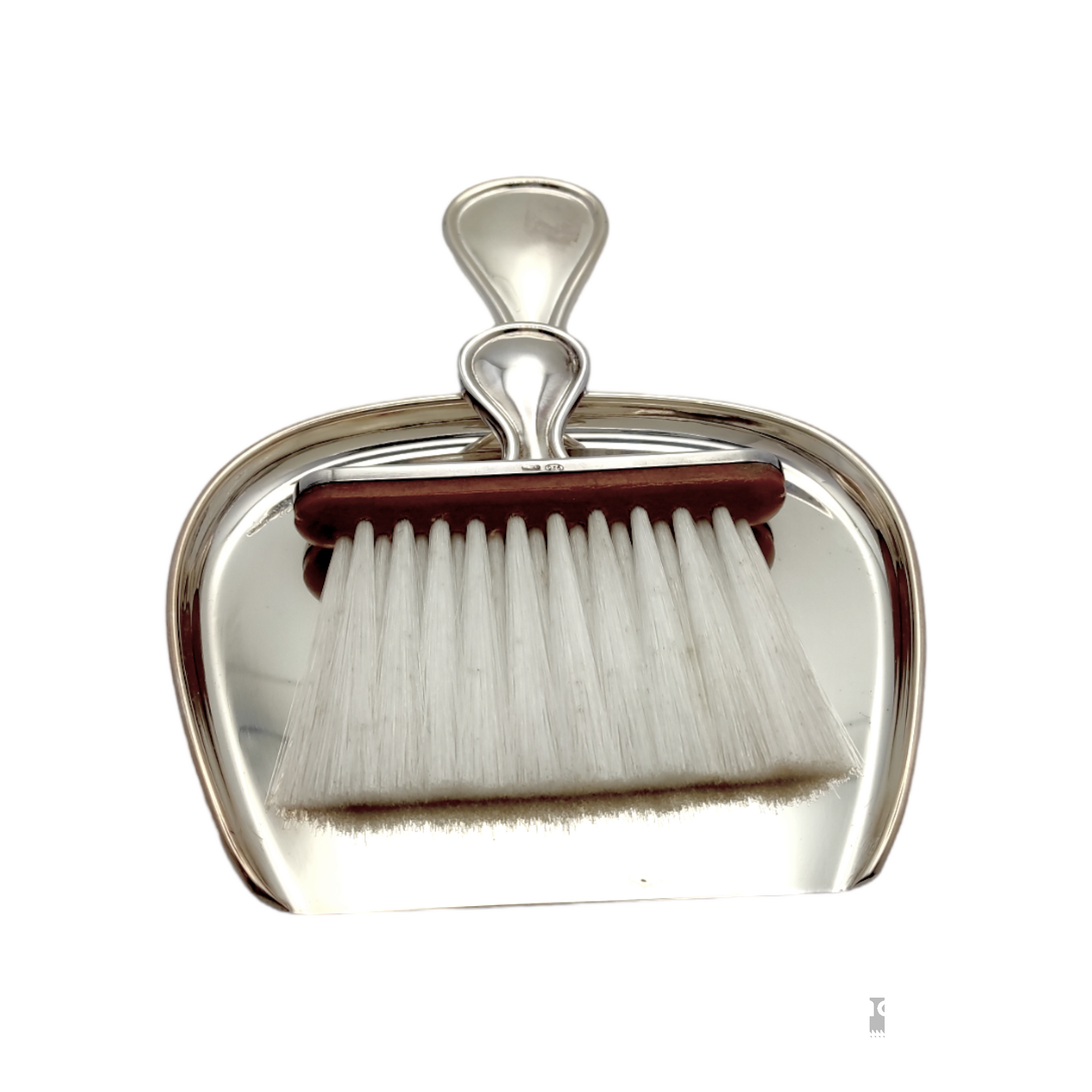 Bellissimo raccogli briciole composto da due pezzi, una paletta in stile inglese e una spazzola con setole e manico. Il tutto è eralizzato a mano con argento 925 dal peso di 140 gr