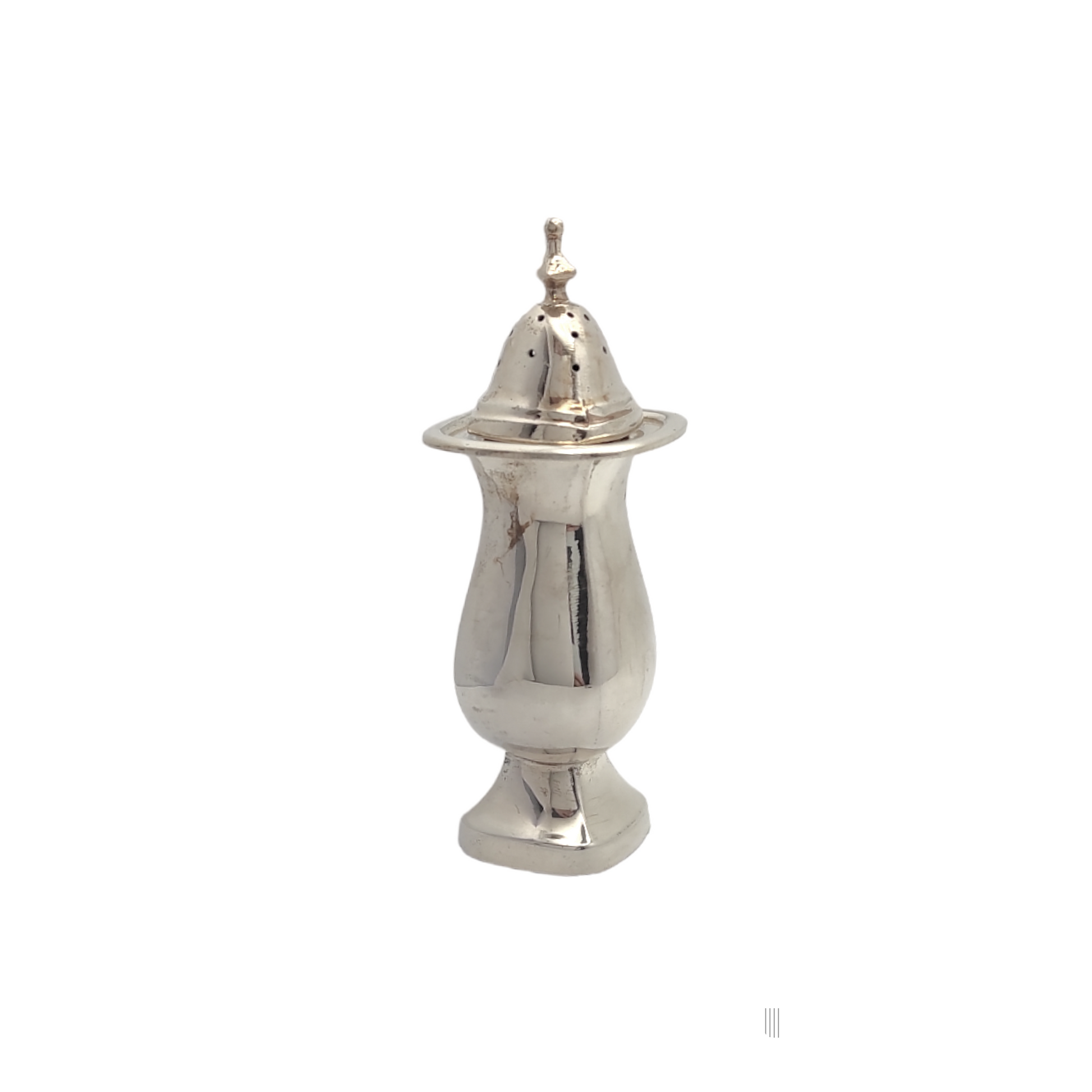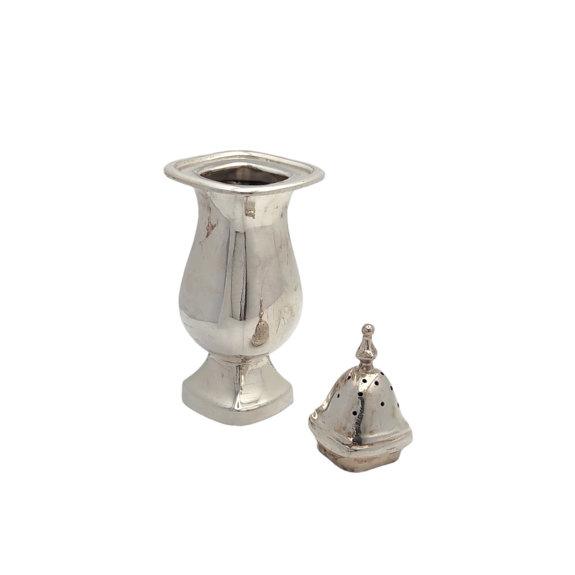 Set composto da due pezzi sale e pepe realizzato a mano in argento 800 in stile inglese dalle linee quadrate. Peso totale prodotto 77 gr, altezza 10 cm