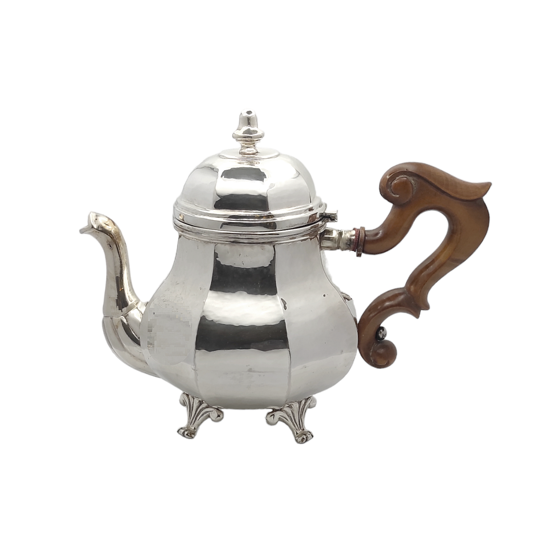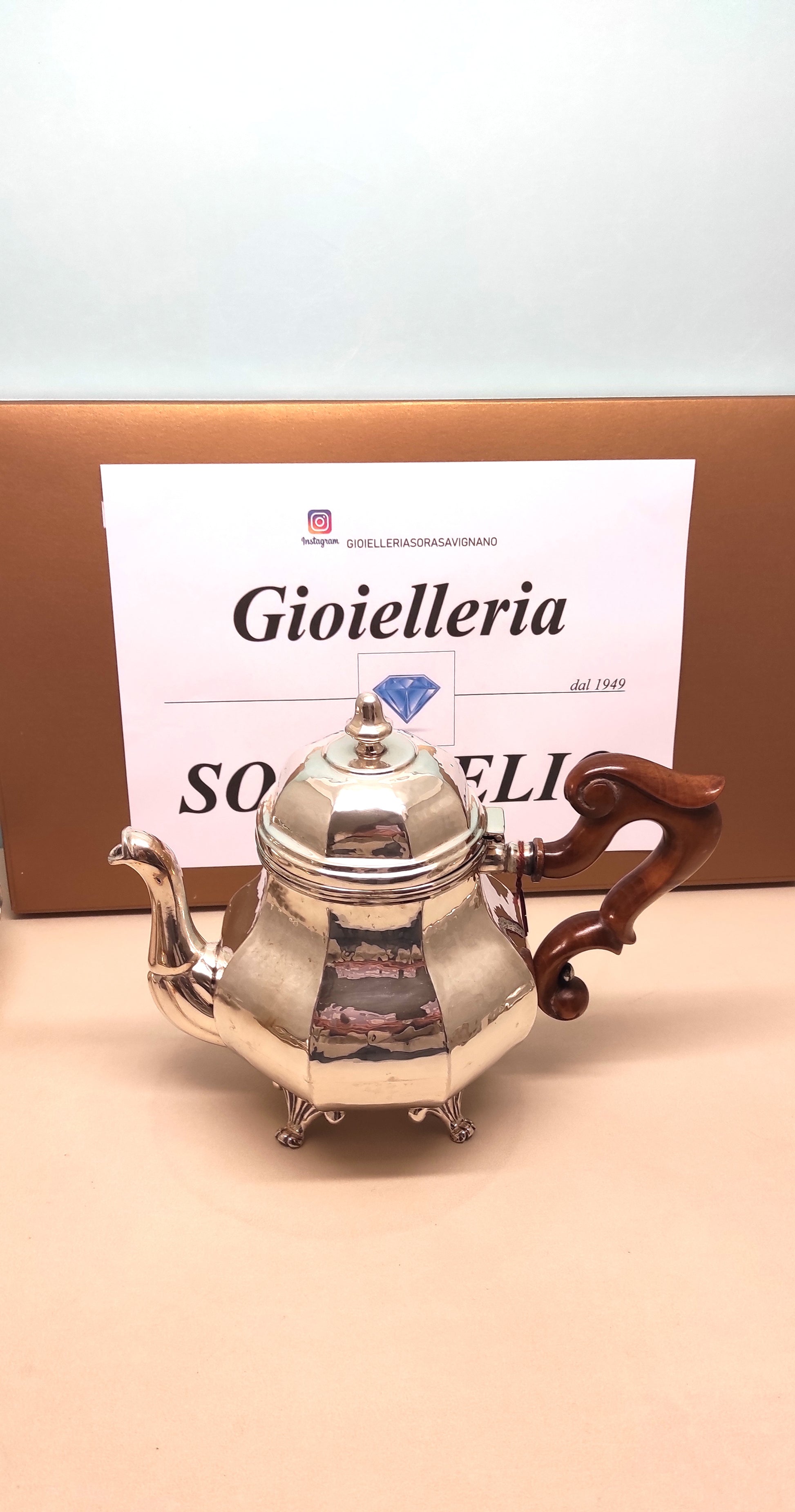 Elegante teiera dalle forme morbide con bombatura in basso realizzata in argento 800 battuto, lavorata a mano con manico in legno decorato e coperchio apribile a cerniera. Dimensioni prodotto: altezza 22 cm, larghezza 25 cm, peso 880 gr