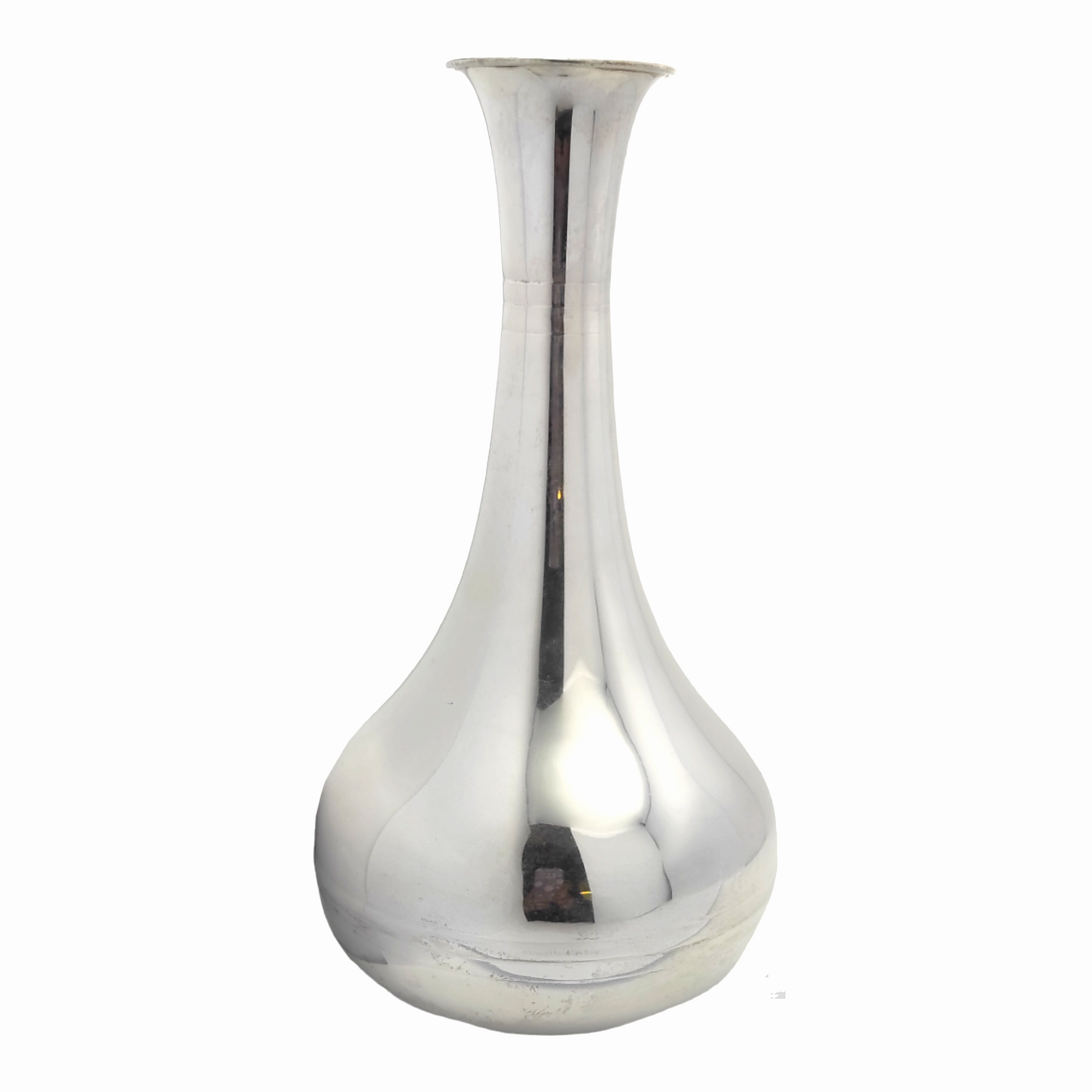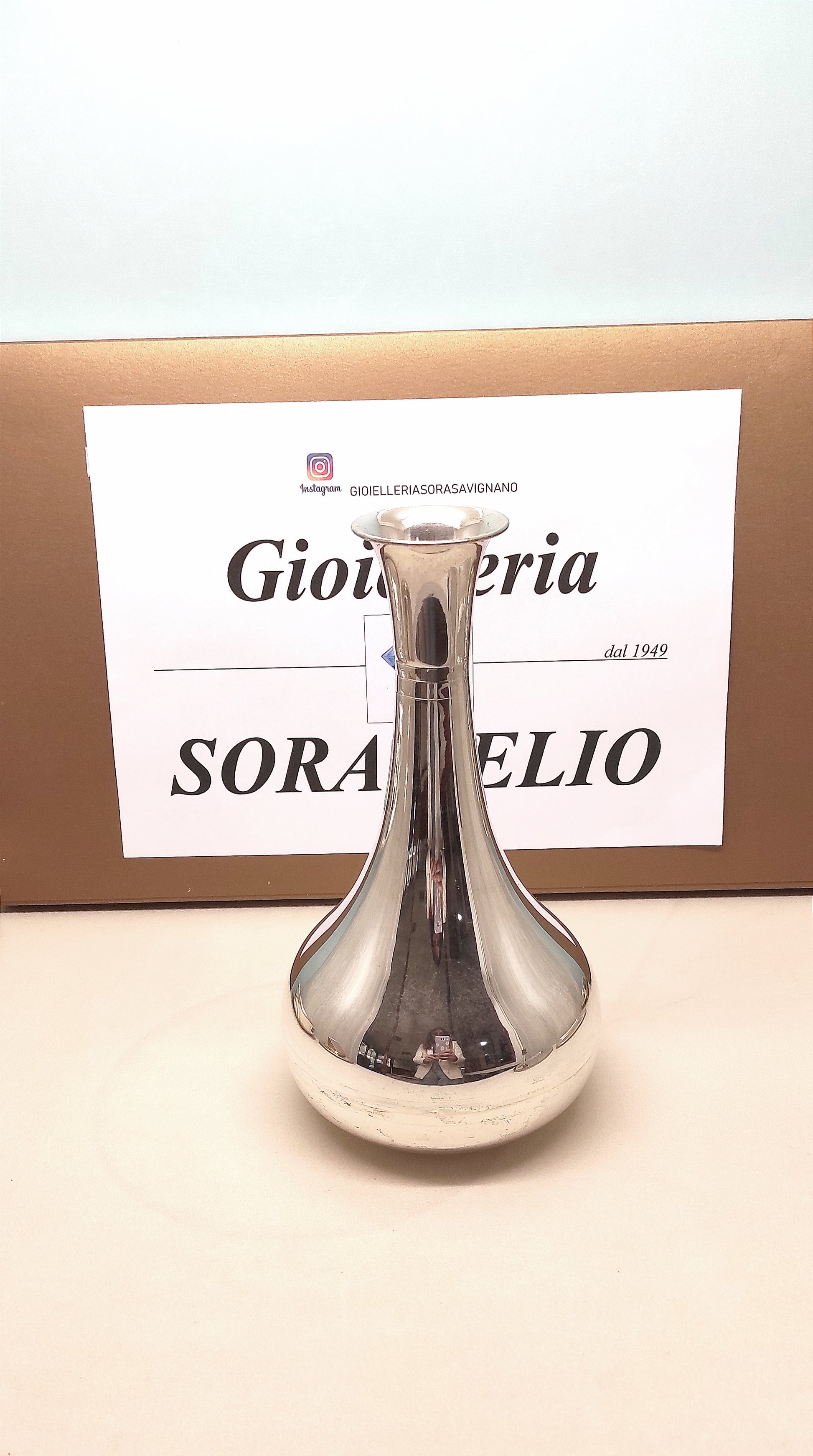Vaso decorativo realizzato a mano in argento 800 stile inglese dalla forma bombata con superficie lucida. Diametro base 11,5 cm altezza 22,5 cm, peso totale 286 gr