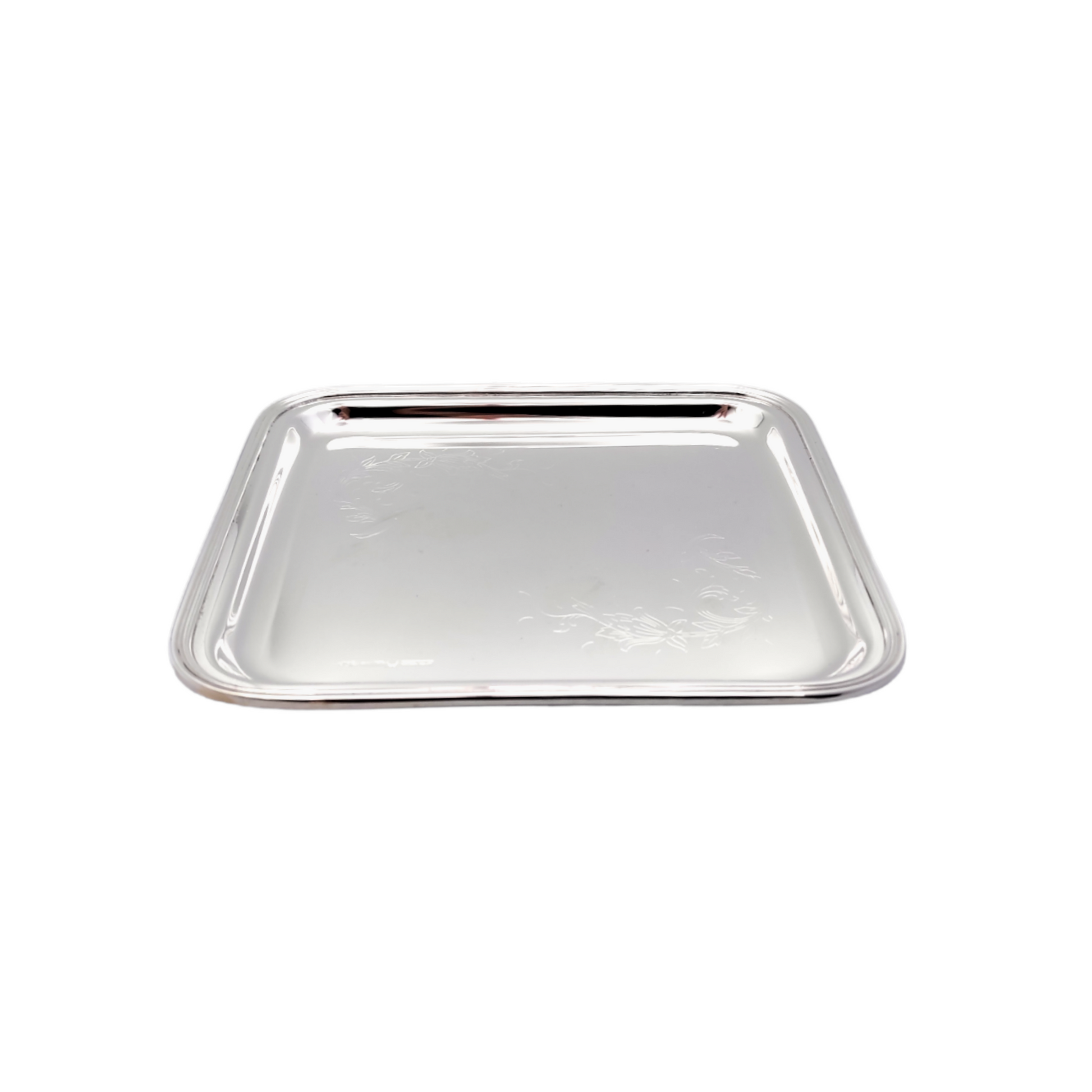 Vassoio quadrato in argento 800 con decorazioni a incisione stile floreale. L'articolo misura 17 cm x 17 cm per un peso totale di 232 gr