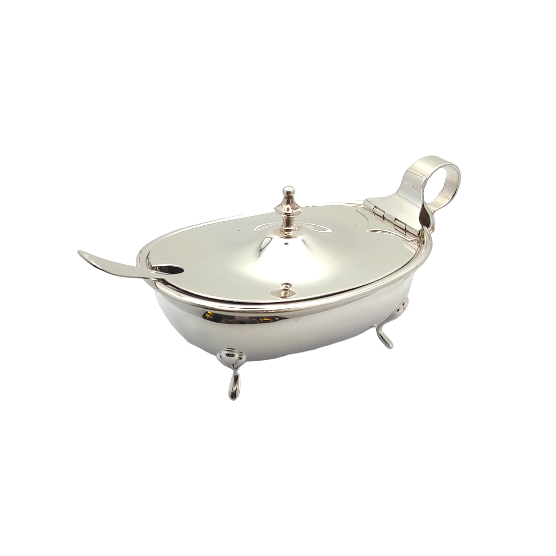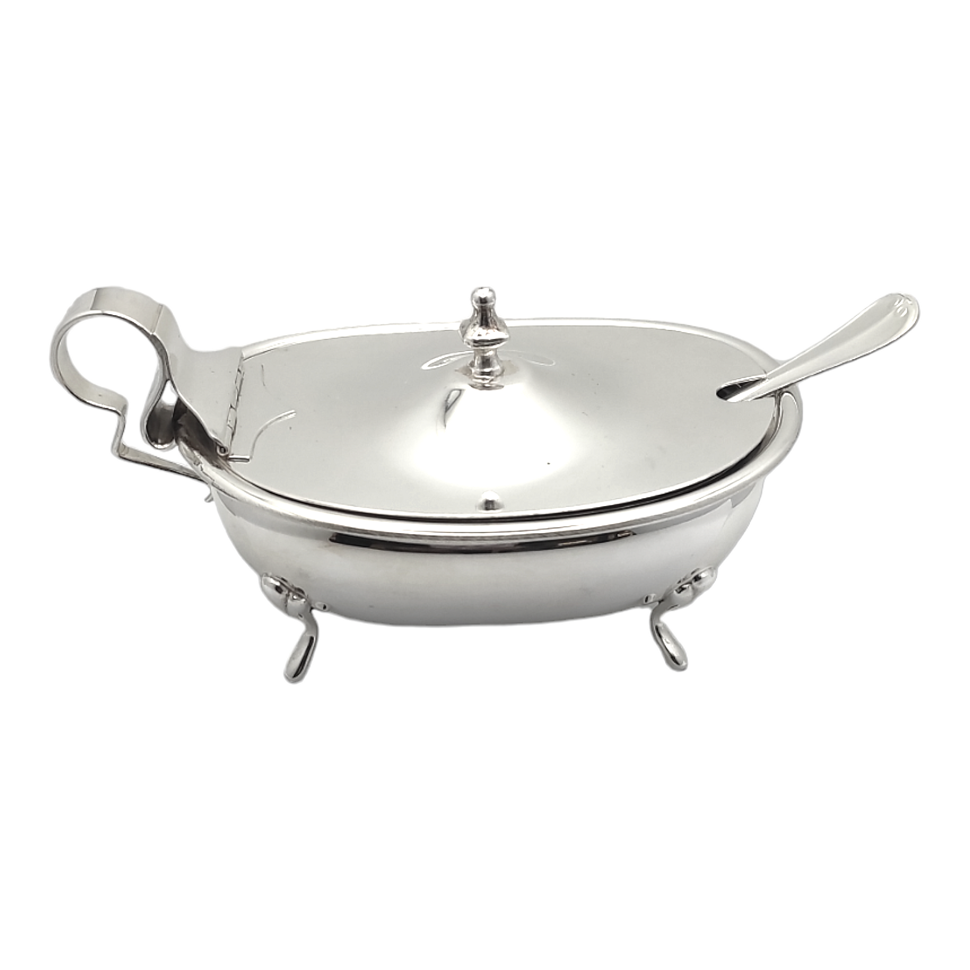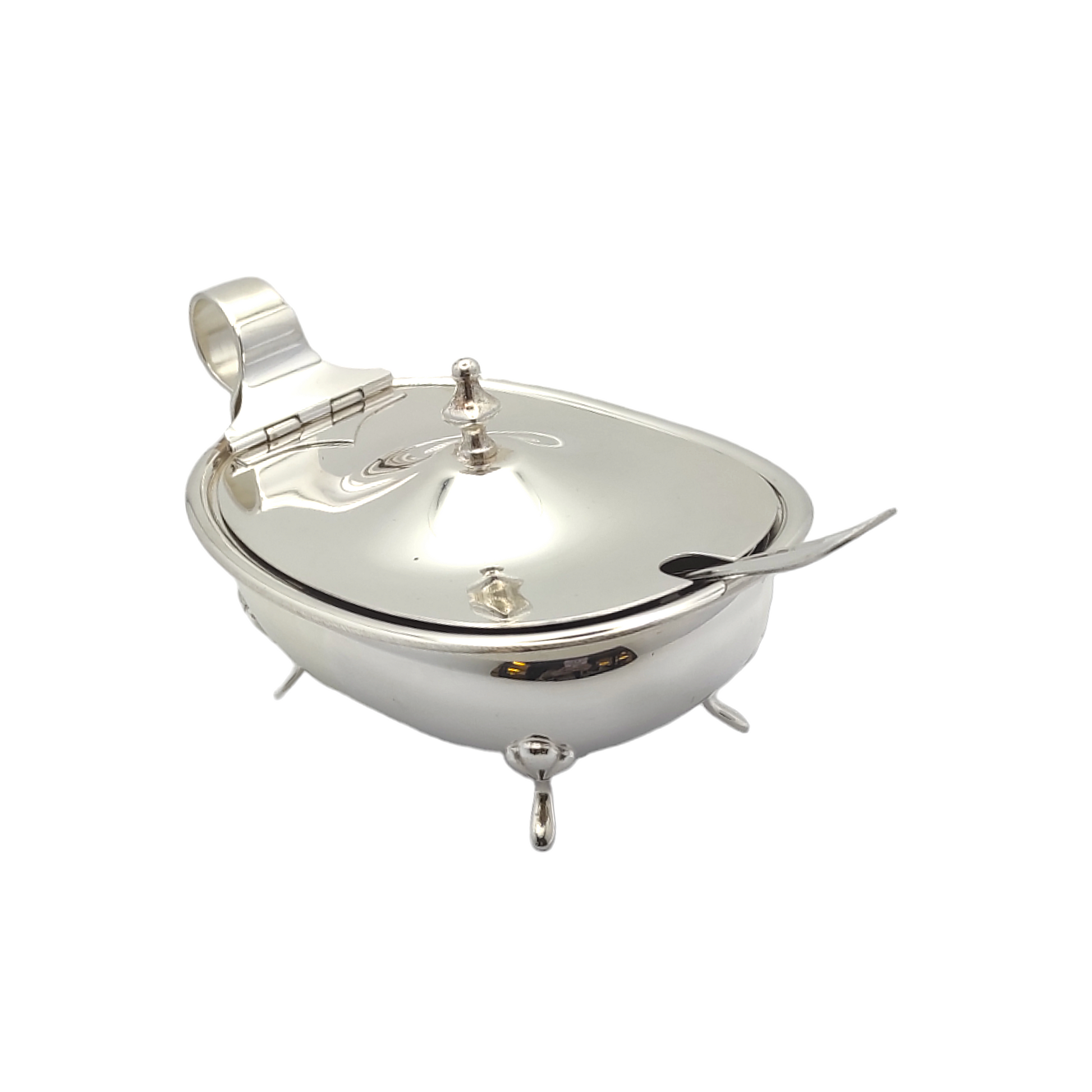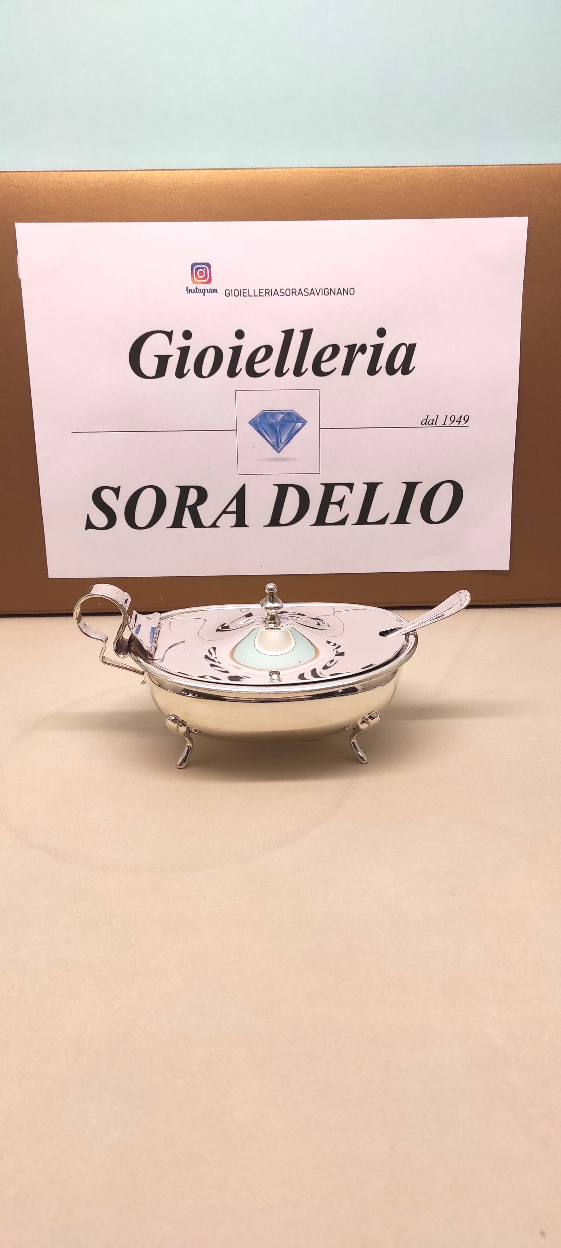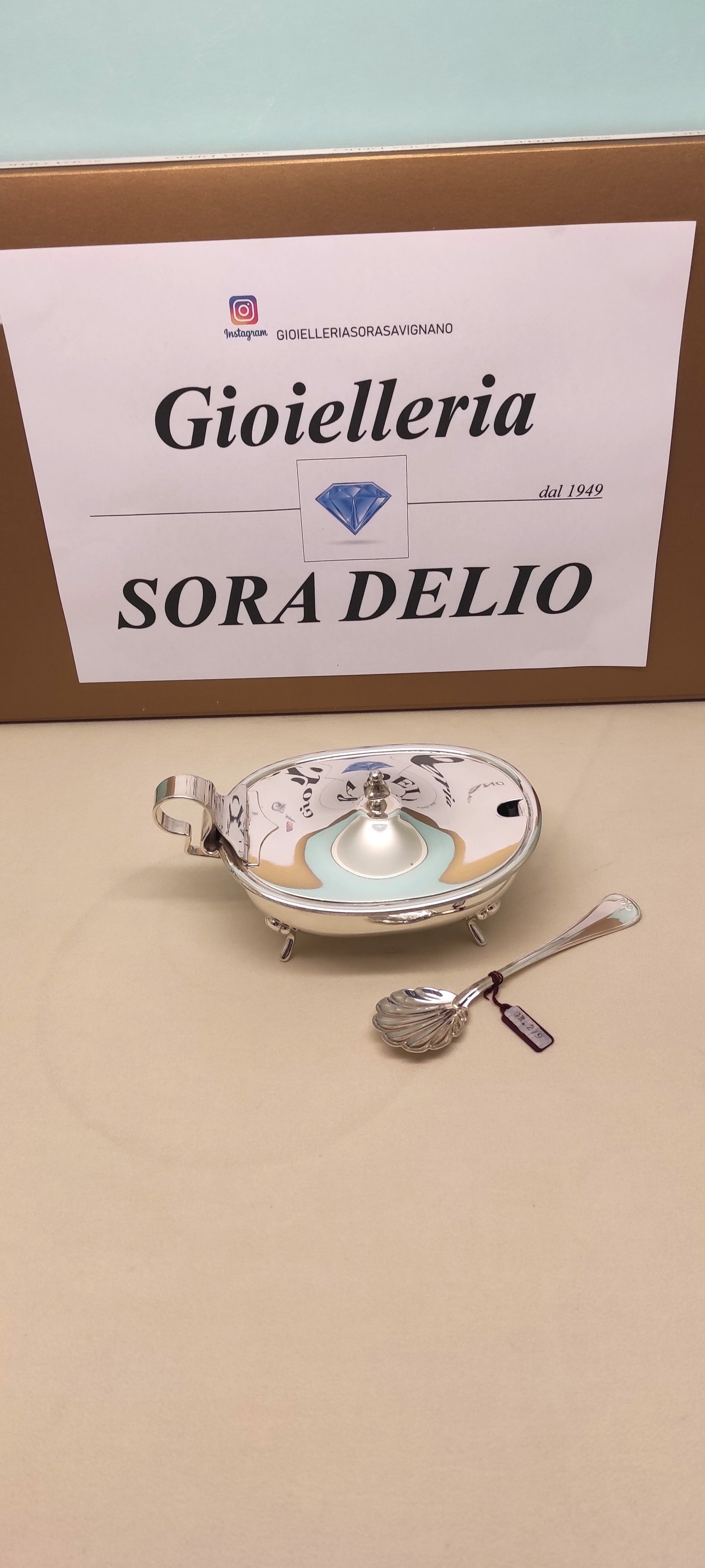 Zuccheriera realizzata a mano in argento 800 in stile Inglese dalla forma ovale con piedini decorati e cucchiaino in abbinamento. Il prodotto ha le seguenti misure: altezza 5 cm escluso manico, diametro 10,2 cm larghezza 15,5 cm peso totale argento compreso il cucchiaino 279 gr