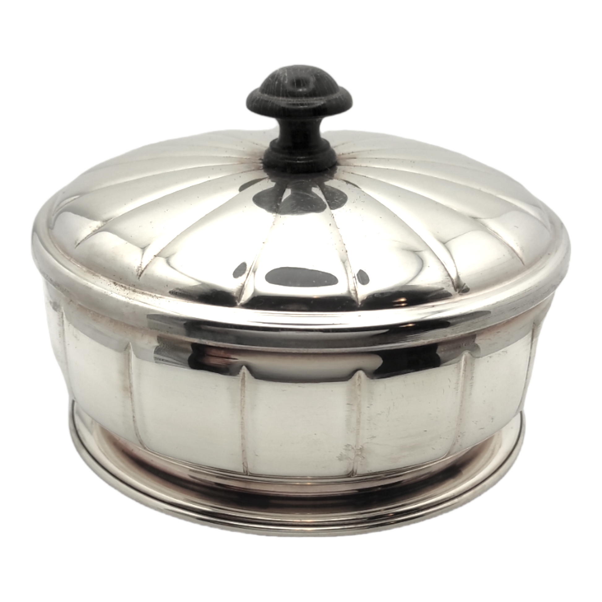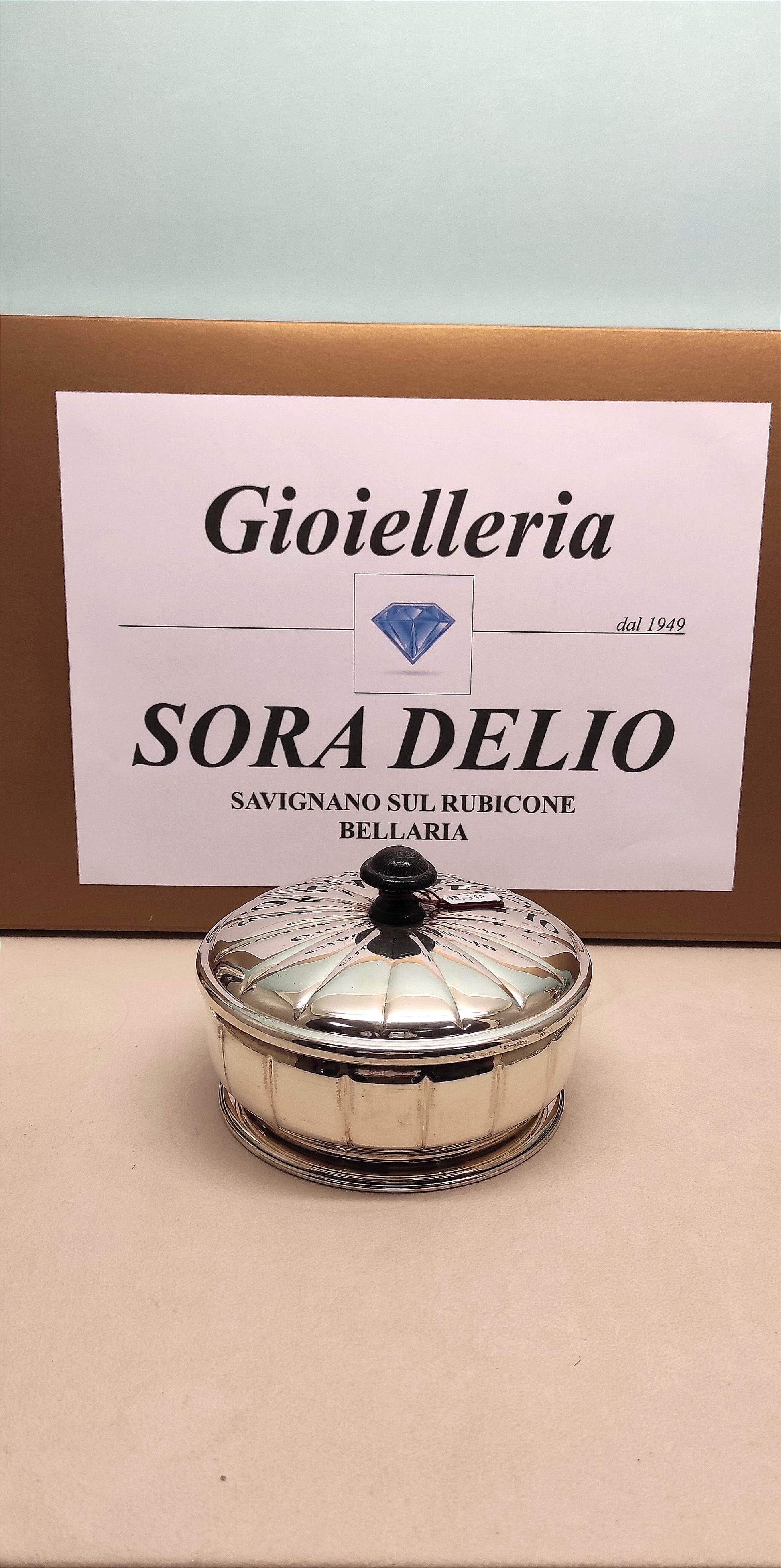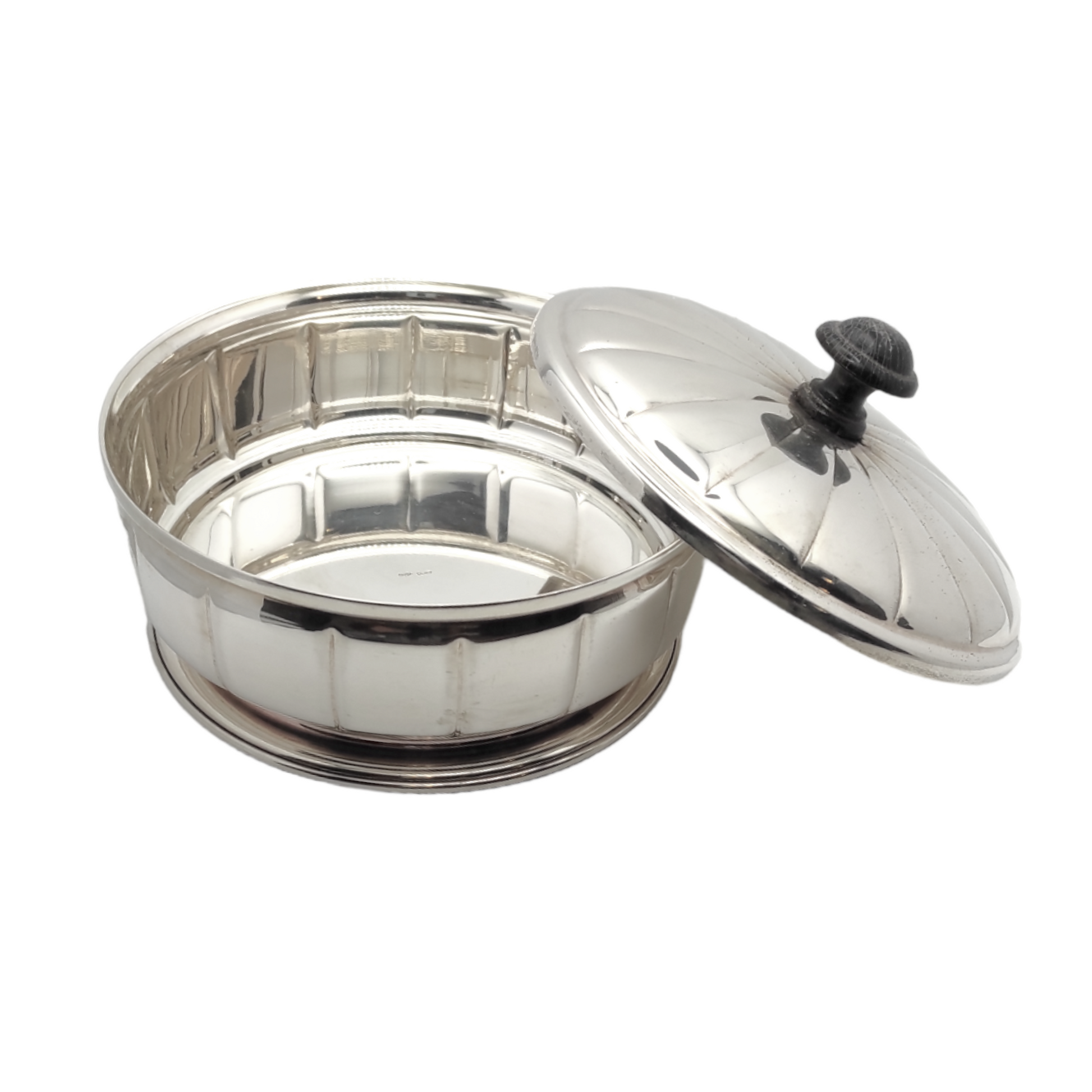 Salsiera realizzata in argento 800 fatta a mano in stile inglese, dalle linee pulite e senza troppe lavorazioni. Il prodotto ha un diametro di 14 cm e altezza 10 cm. Peso totale 342 gr.