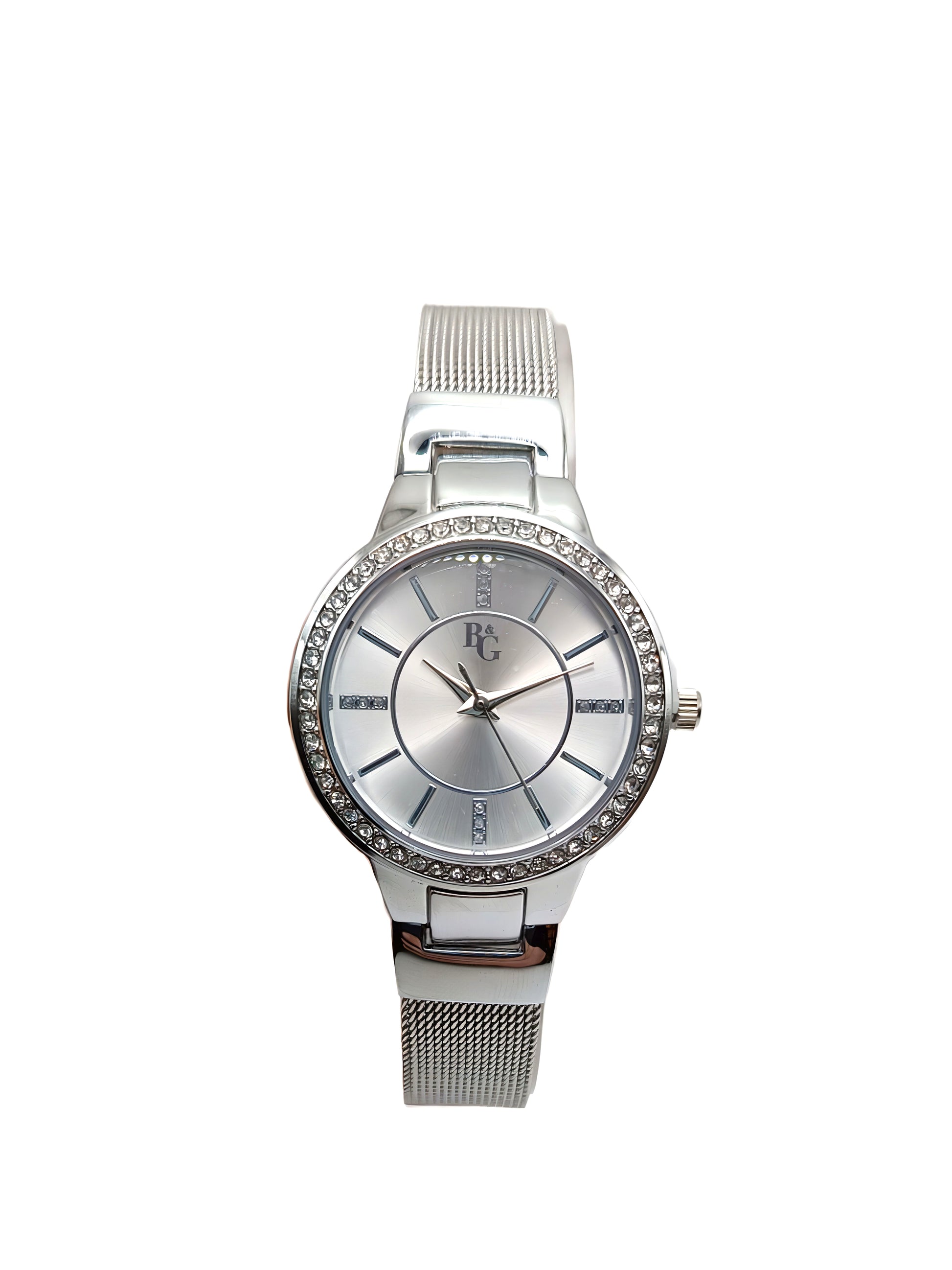 Orologio da donna solo tempo della B&G Luxury realizzato con cinturino a maglia Milano in acciaio inox con chiusura regolabile. Cassa rotonda da 30 mm di diametro impreziosita da cristalli bianchi, quadrante silver satinato con zirconi, indici e lancette in acciaio. Resistenza all'acqua fino a 3 ATM.