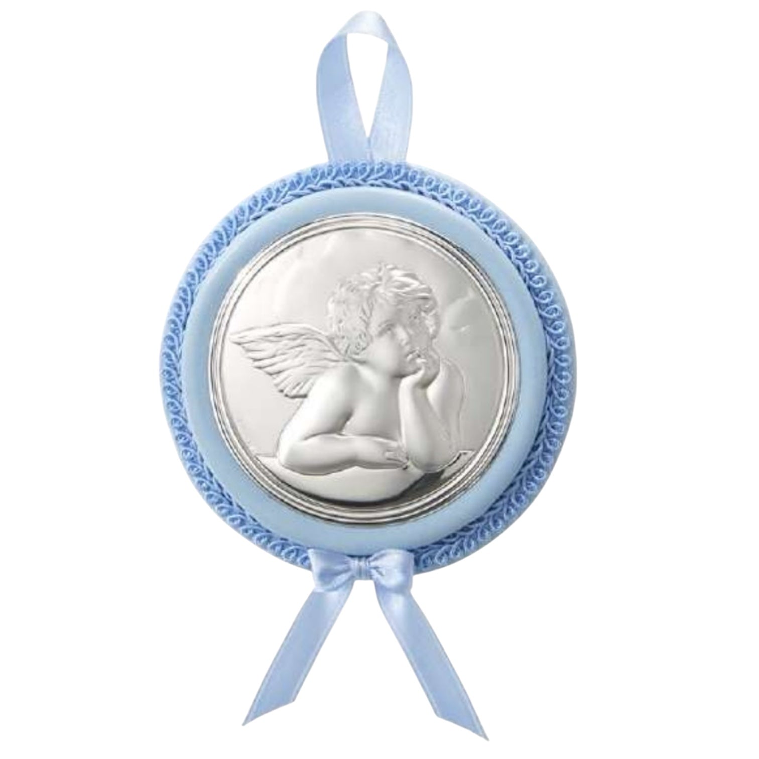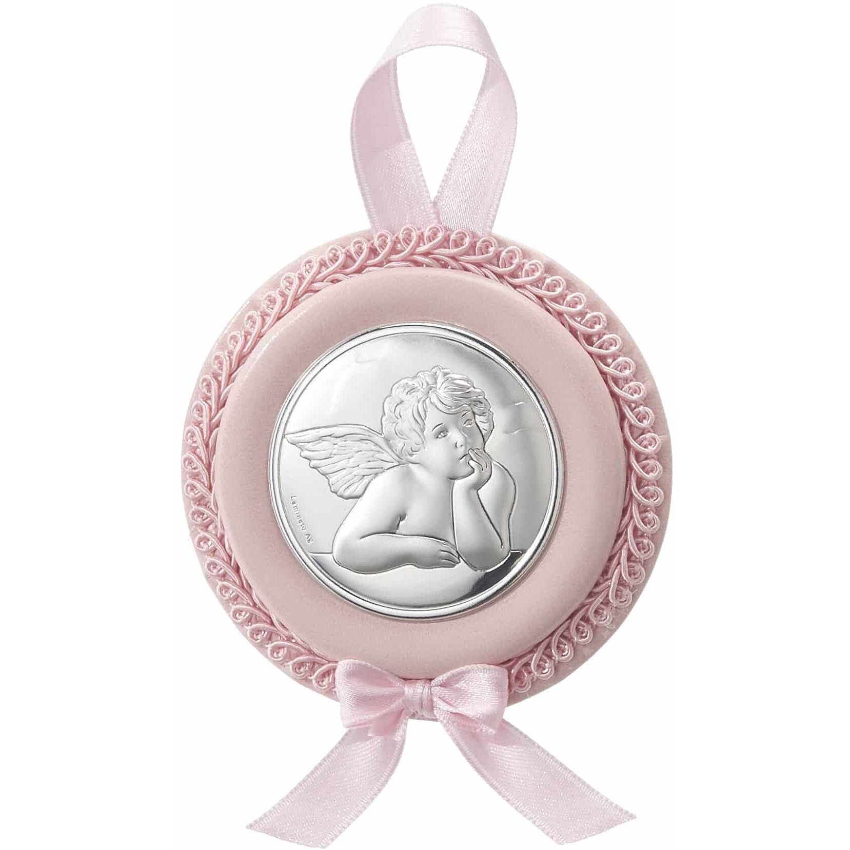 Medaglione sopraculla con carillon Angelo Raffaello di Valenti. Medaglione in simil pelle di colore rosa o azzurro con lastra in argento bilaminato, composto da una sottile lamina di argento puro unita con speciali resine ad una più robusta base di alluminio, rappresentante angioletto di Raffaello. Disponibile in due dimensioni piccolo o grande.