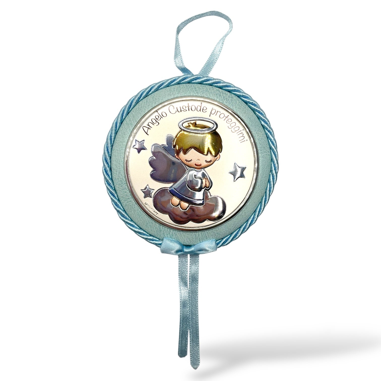 Medaglione sopraculla "Angelo Custode Proteggimi" di forma tonda di Valenti. Medaglione in eco-pelle di colore azzurro forma tonda con lastra in argento bilaminato smaltato, composto da una sottile lamina di argento puro unita con speciali resine ad una più robusta base di alluminio, rappresentante Madonna con Bambino.