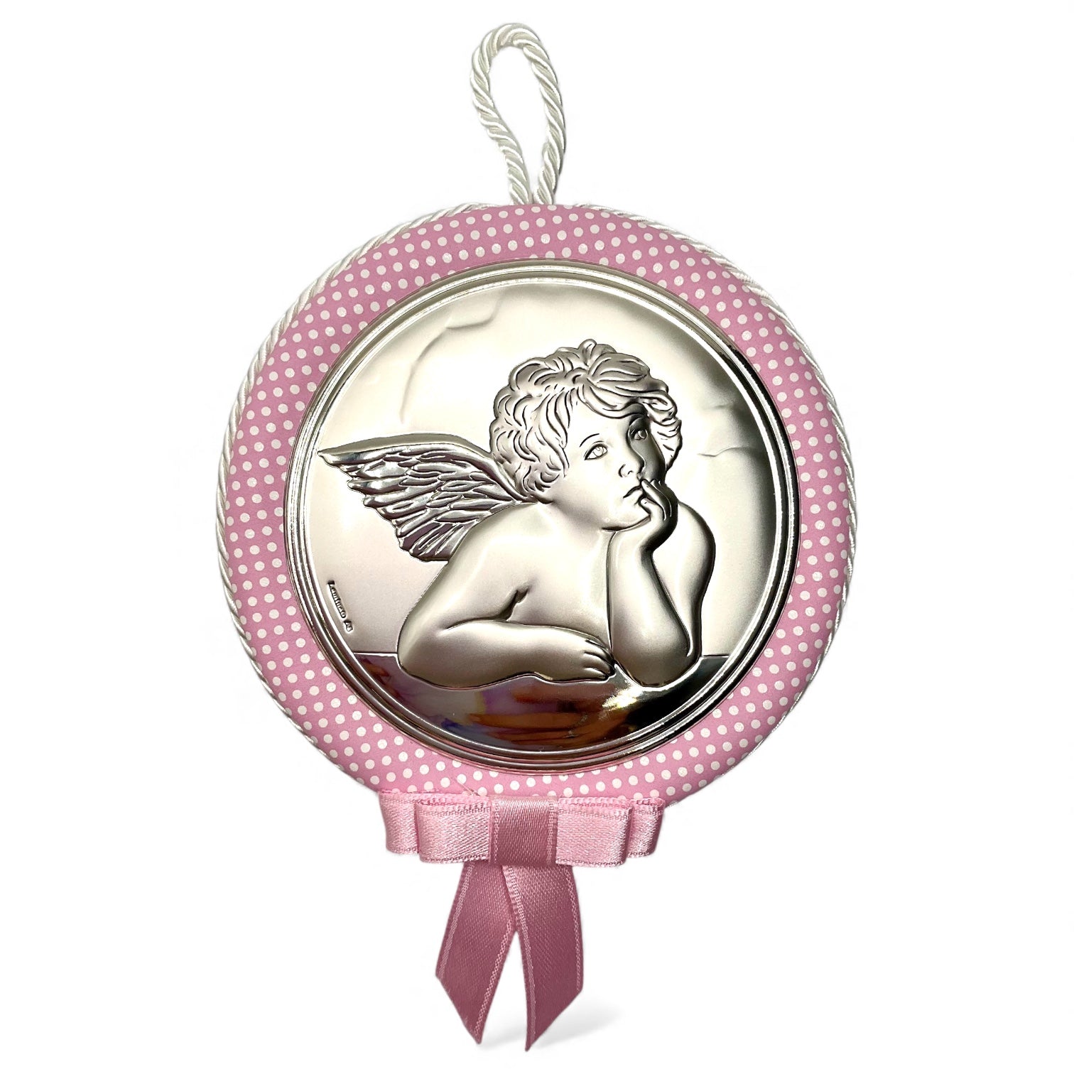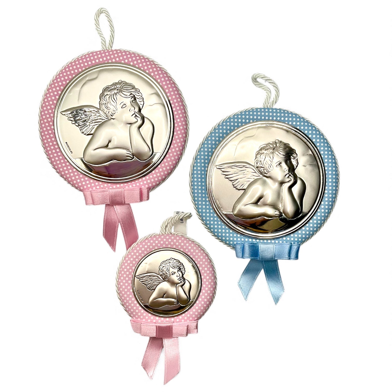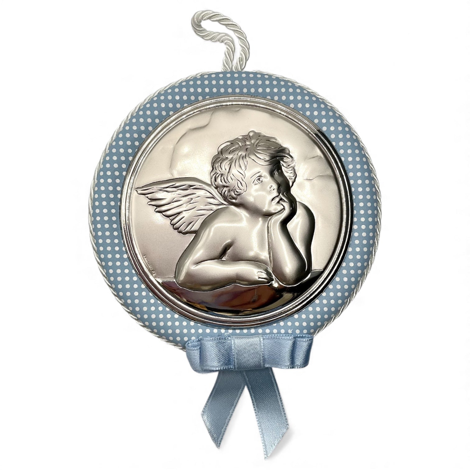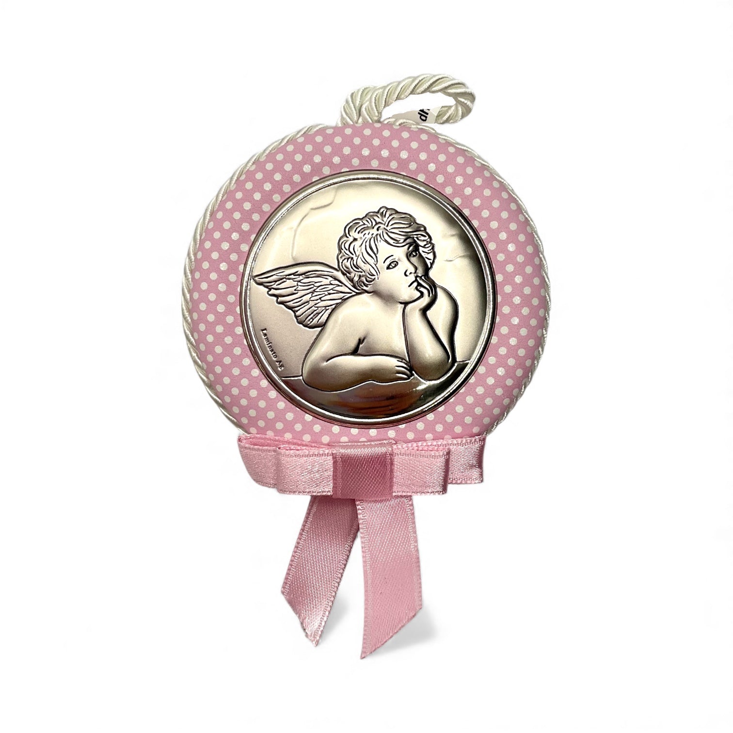 Medaglione sopraculla con carillon Angelo di Raffaello pois di Valenti. Medaglione in simil pelle pois di colore rosa o azzurro con lastra in argento bilaminato, composto da una sottile lamina di argento puro unita con speciali resine ad una più robusta base di alluminio, rappresentante Angelo di Raffaello. Disponibile in 2 misure piccolo o grande, nella misura grande è presente anche il carillon.