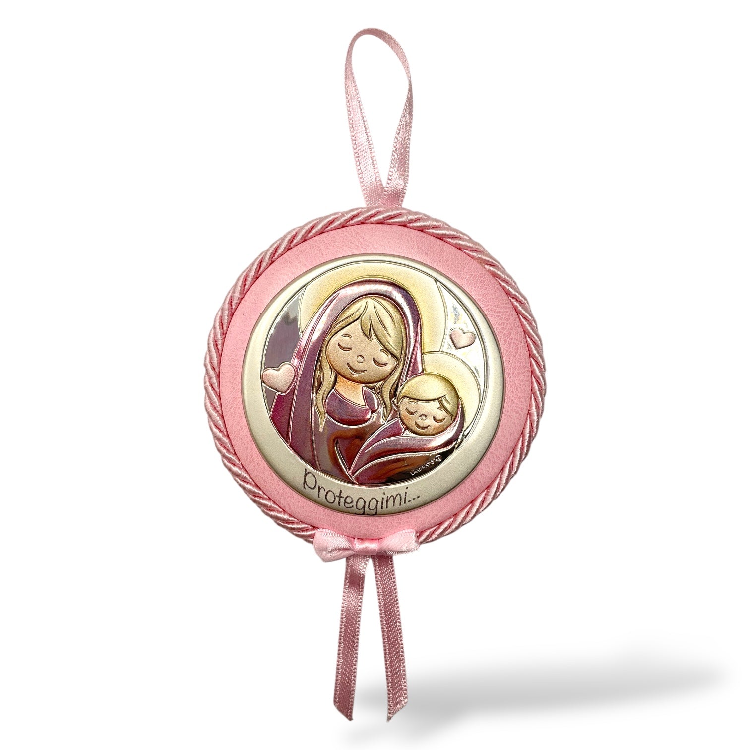 Medaglione sopraculla Madonna con Bambino "Proteggimi..." di forma tonda di Valenti. Medaglione in eco-pelle di colore rosa forma tonda con lastra in argento bilaminato smaltato, composto da una sottile lamina di argento puro unita con speciali resine ad una più robusta base di alluminio, rappresentante Madonna con Bambino.
