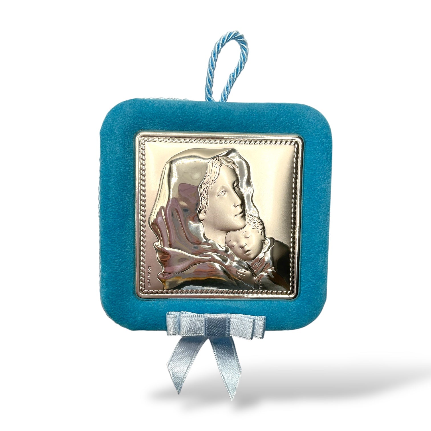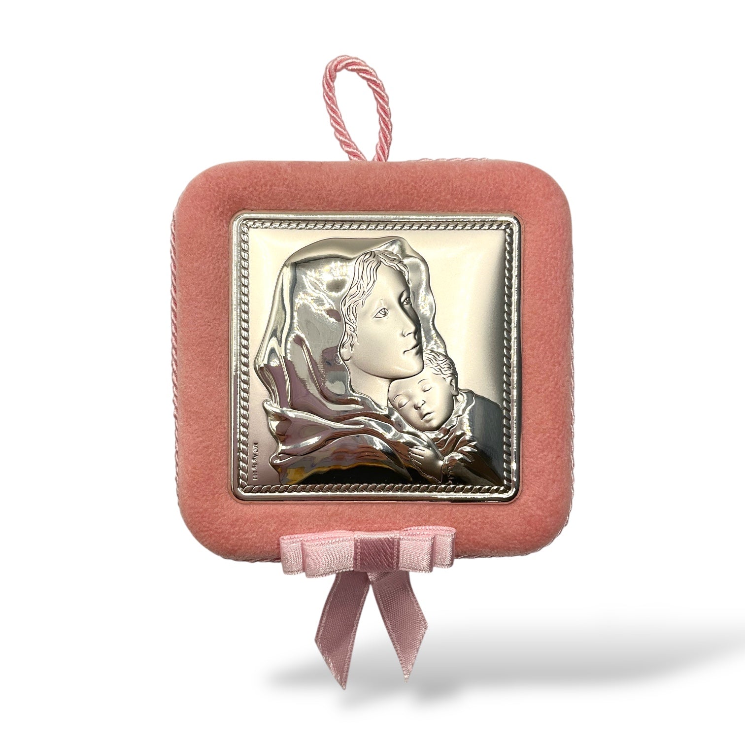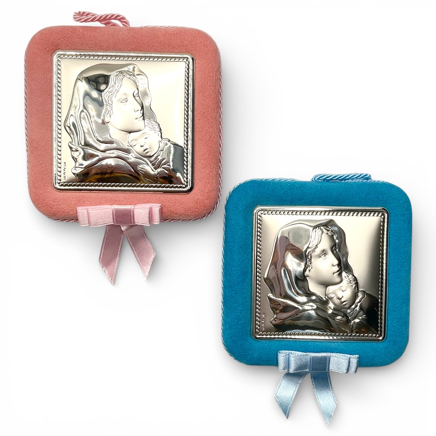 Medaglione sopraculla Madonna con Bambino di forma quadrata di Valenti. Medaglione in velluto di colore rosa o azzurro forma quadrata con lastra in argento bilaminato, composto da una sottile lamina di argento puro unita con speciali resine ad una più robusta base di alluminio, rappresentante Madonna con Bambino.
