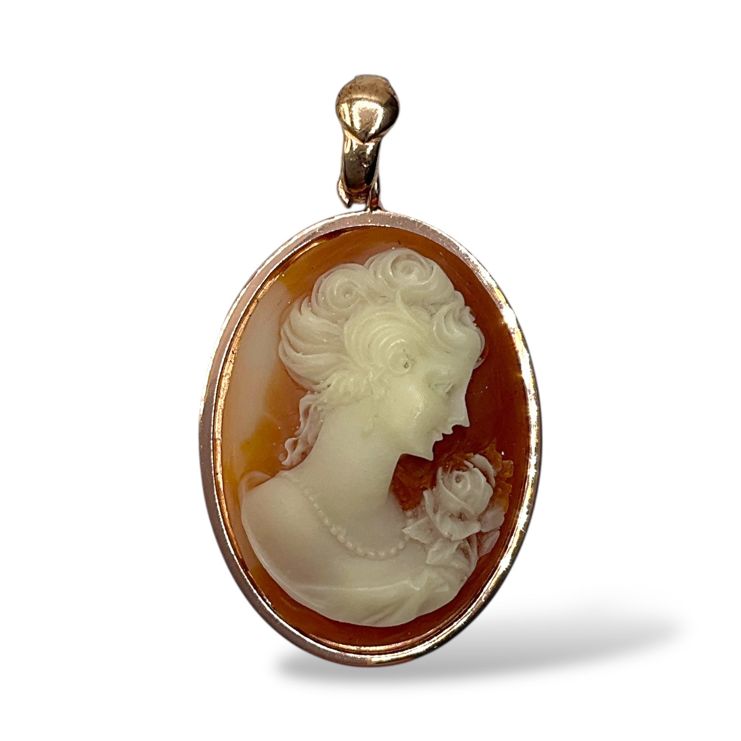 Ciondolo cammeo con montatura in argento rosato. Il cammeo è intagliato a mano realizzato su conchiglia in Italia.