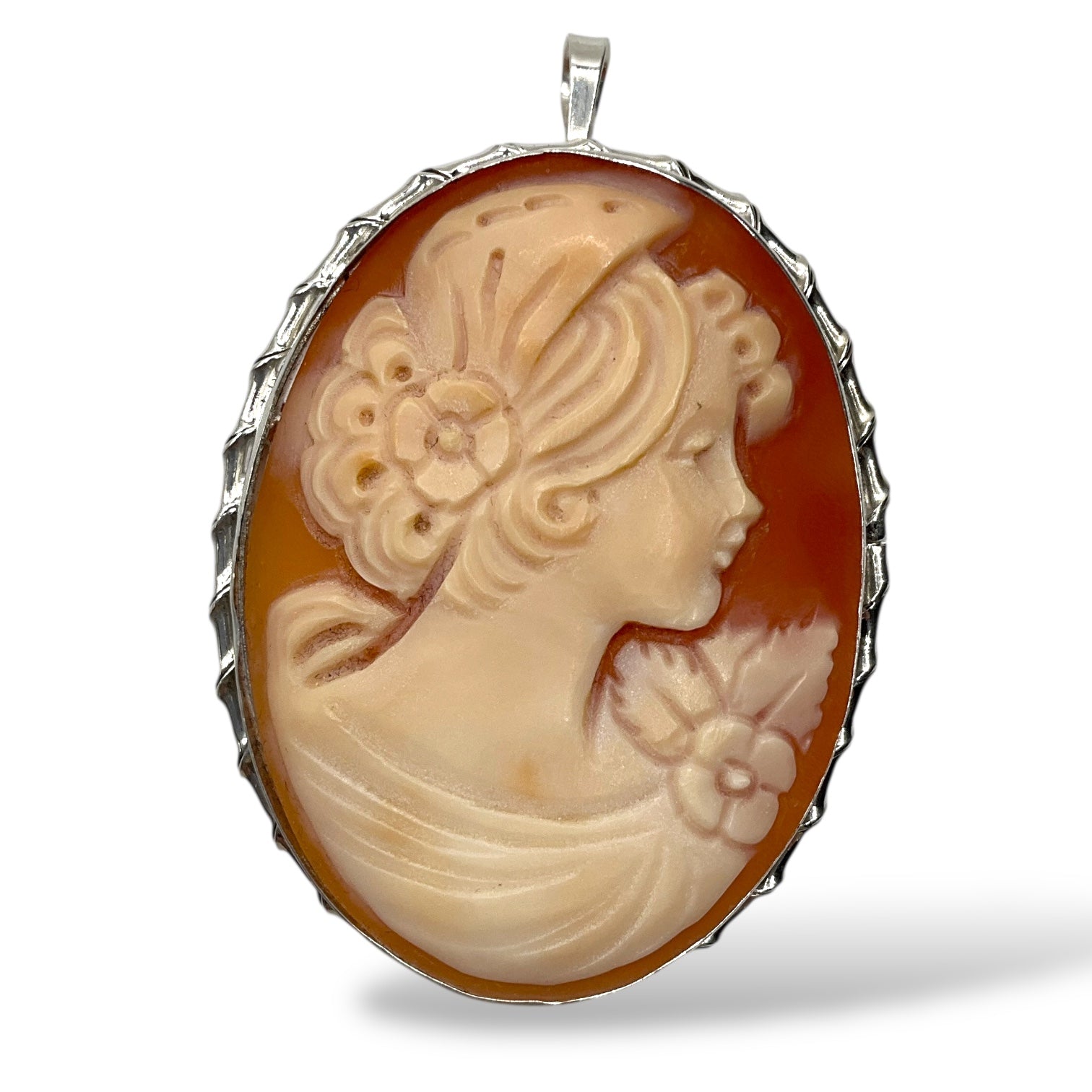 Ciondolo con spilla cammeo con montatura in argento, possibilità di indossarlo come ciondolo o spilla. Il cammeo è intagliato a mano realizzato su conchiglia in Italia.