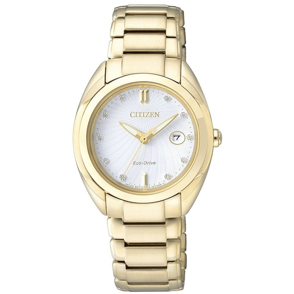 Orologio Citizen da donna, movimento Eco-Drive a carica luce infinita, riserva di carica di 8 mesi. Cassa in acciaio dorato quadrante di colore bianco con brillantini applicati. Bracciale in acciaio dorato. Vetro zaffiro. Resistenza all'acqua 5 bar.