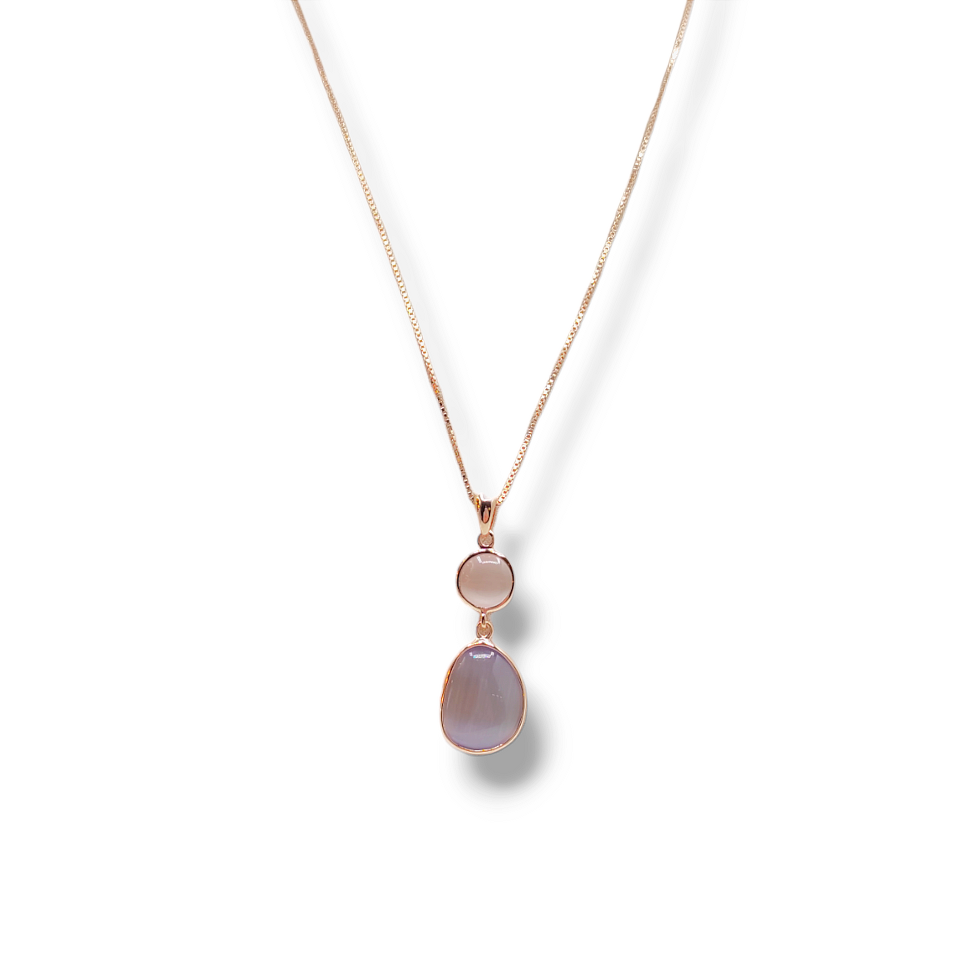 La collana Laguna di Madì è finemente lavorata in argento placcato oro rosa e impreziosita da due pietre di quarzo idrotermale, una a goccia e l’altra sferica, nei delicati toni beige e lavanda. Con una lunghezza di 40 cm e chiusura a moschettone, questo gioiello unisce eleganza e raffinatezza per ogni occasione.