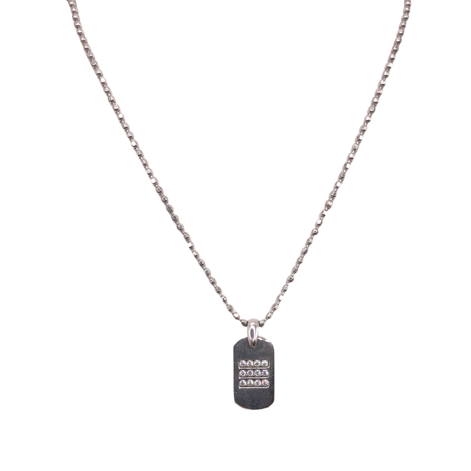 Collana unisex realizzata in argento con ciondolo in acciaio impreziosito da pietre sintetiche. Lunghezza collana 20 cm, chiusura a moschettone