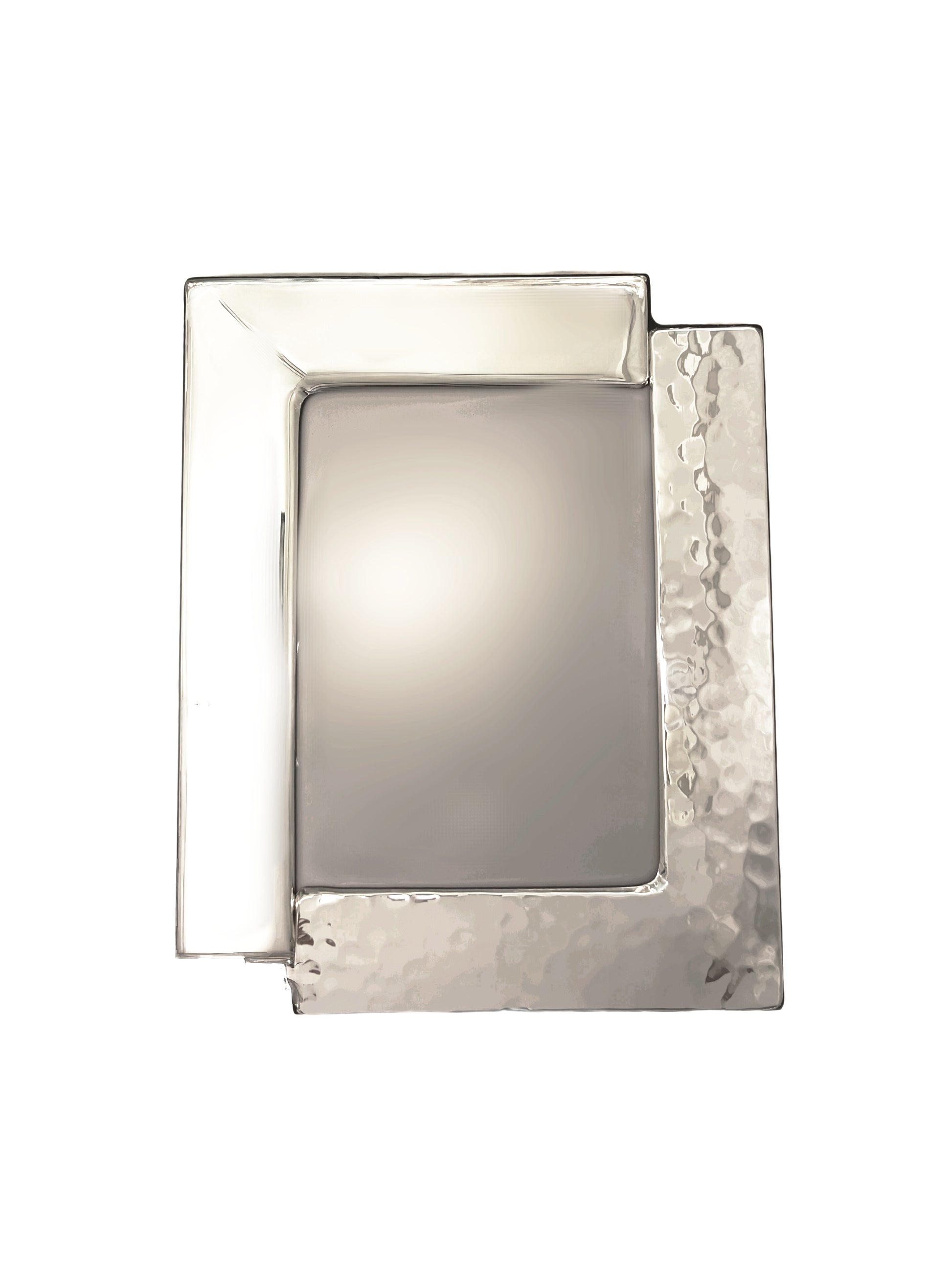 Cornice portafoto realizzata in argento massiccio con montatura sfasata che da un lato presenta una superficie con lavorazioni di martellatura, dall'altro lato è liscia. Il retro è realizzato in legno di colore nero. Dimensione prodotto: 21 x 26 cm. Adatto per fotografie 13 x 18 cm