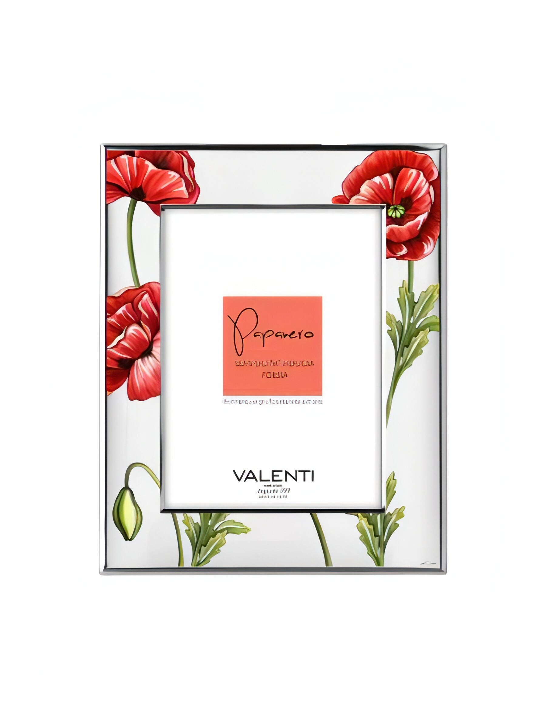 Cornice portafoto realizzata in argento lucido e decori floreali con papaveri. Dimensioni prodotto: 21 x 26 cm. Adatto per fotografie 13 x 18,5 cm