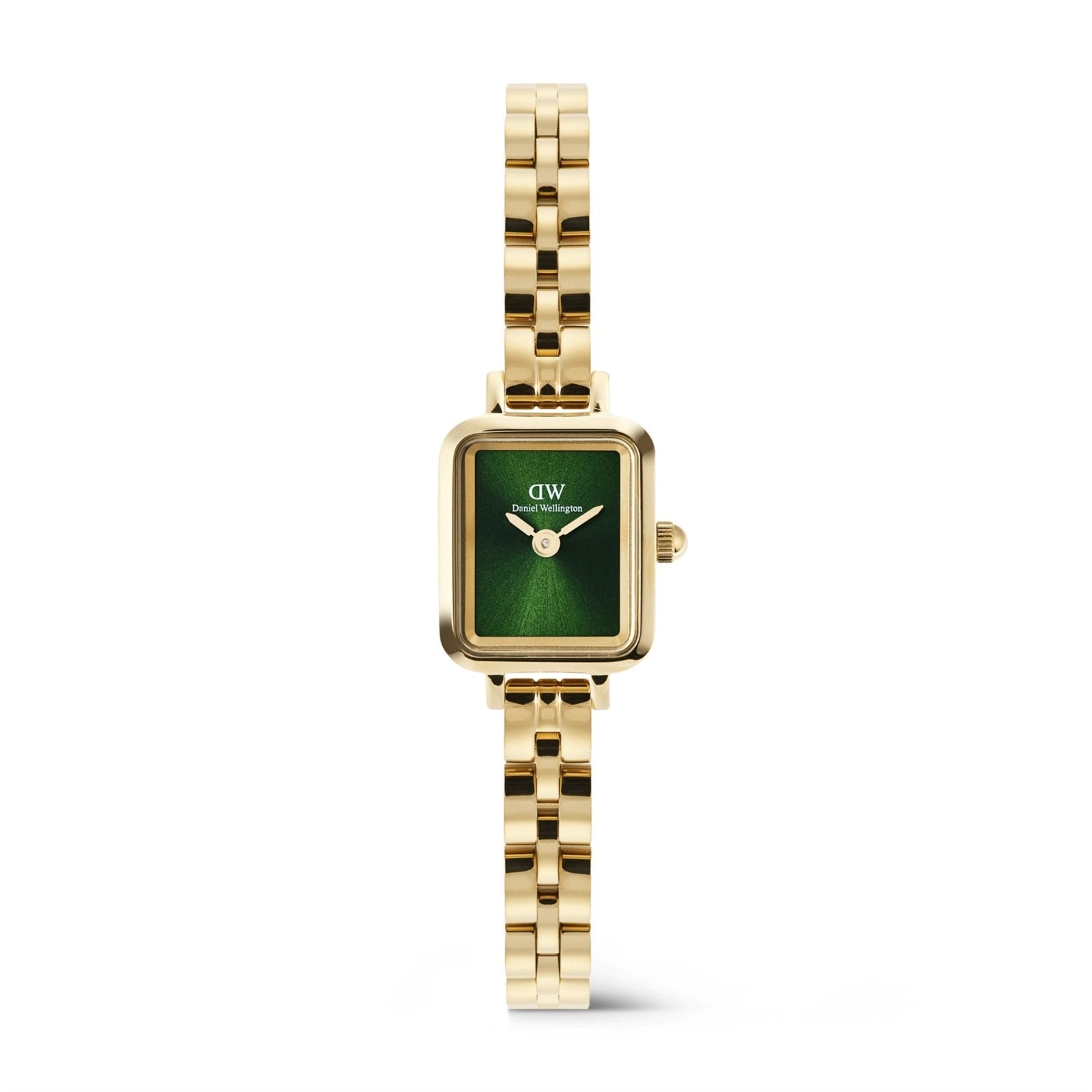 Orologio solo tempo da donna di Daniel Wellington della collezione Quadro Mini Arch 3-Link o Petite Mini Arch 3-Link. Cassa rettangolare della dimensione di 15,4 x 18,2 mm in acciaio con quadrante nero o acciaio dorato con quadrante verde, disponibile anche con cassa tonda del diametro di 19 mm in acciaio, acciaio dorato o rosato con quadrante bianco. Cinturino in acciaio con maglie ad arco e chiusura a farfalla con pulsanti. Movimento solo tempo al quarzo, resistenza all'acqua di 3 atm.