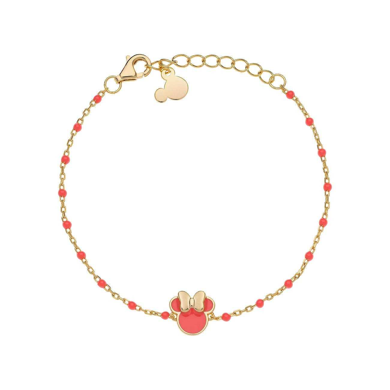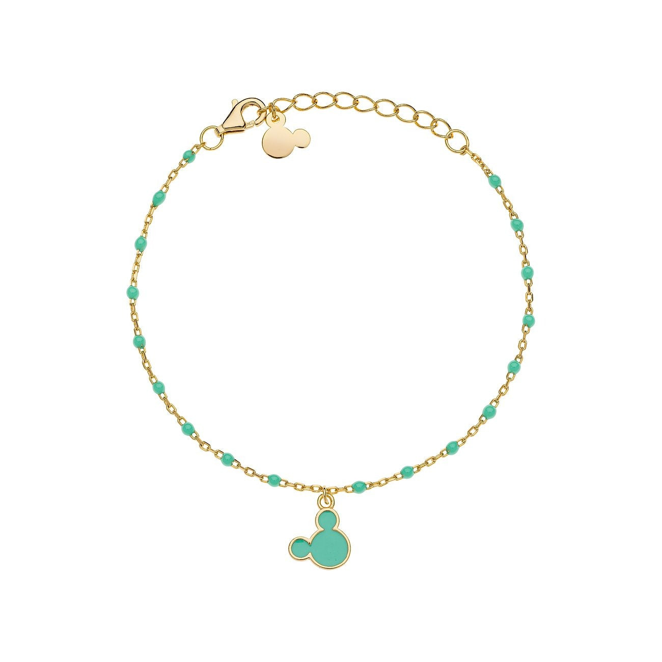Bracciale da bambina o donna di Disney in argento dorato. Bracciale in argento 925 dorato con ciondolo Minnie o Topolino smaltati, la catena è alternata da palline smaltate abbinate al ciondolo.