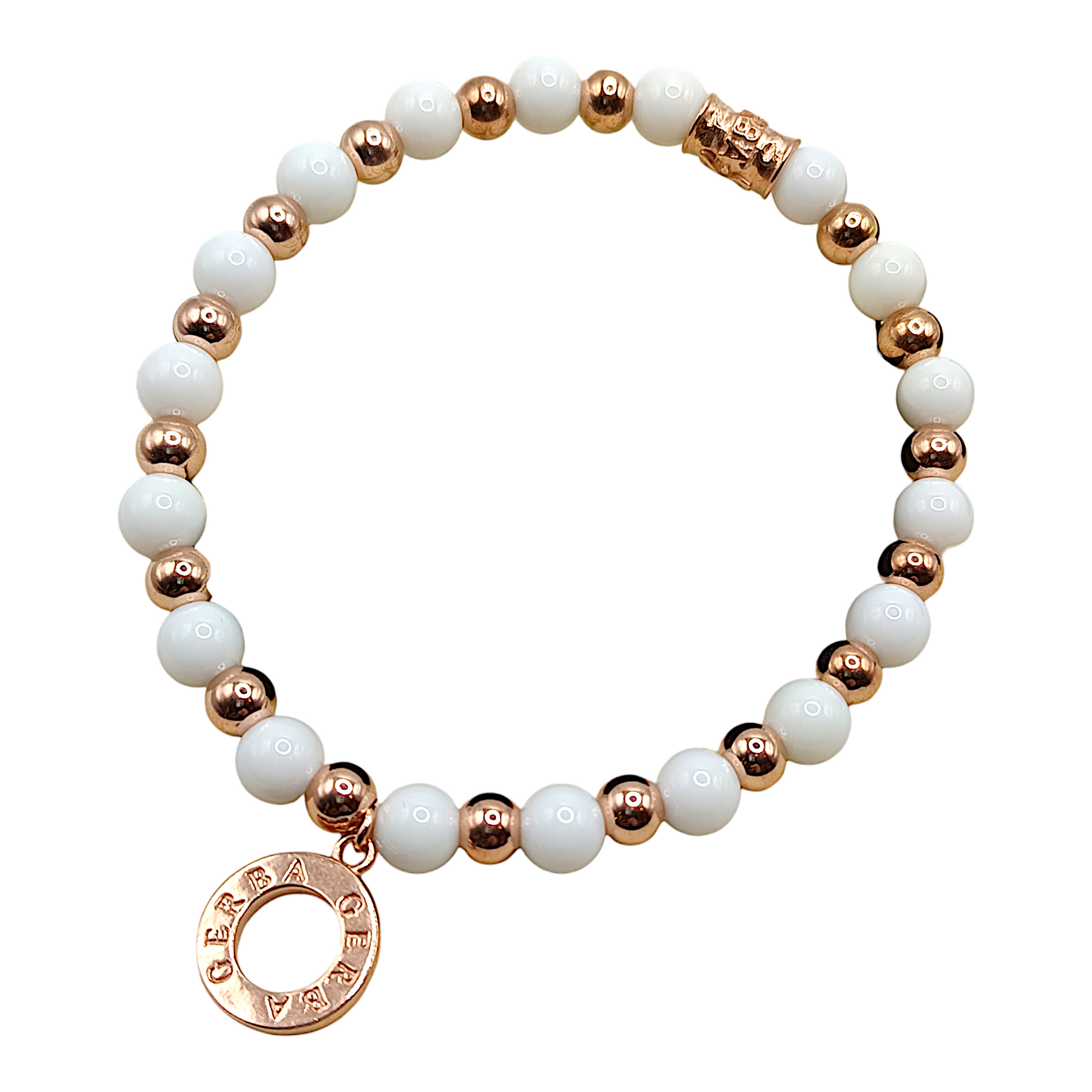 Bracciale elasticizzato da donna della collezione Sally di Gerba realizzato a mano con perle di pietra Agata bianca e argento rosè impreziosito da uno charm centrale.