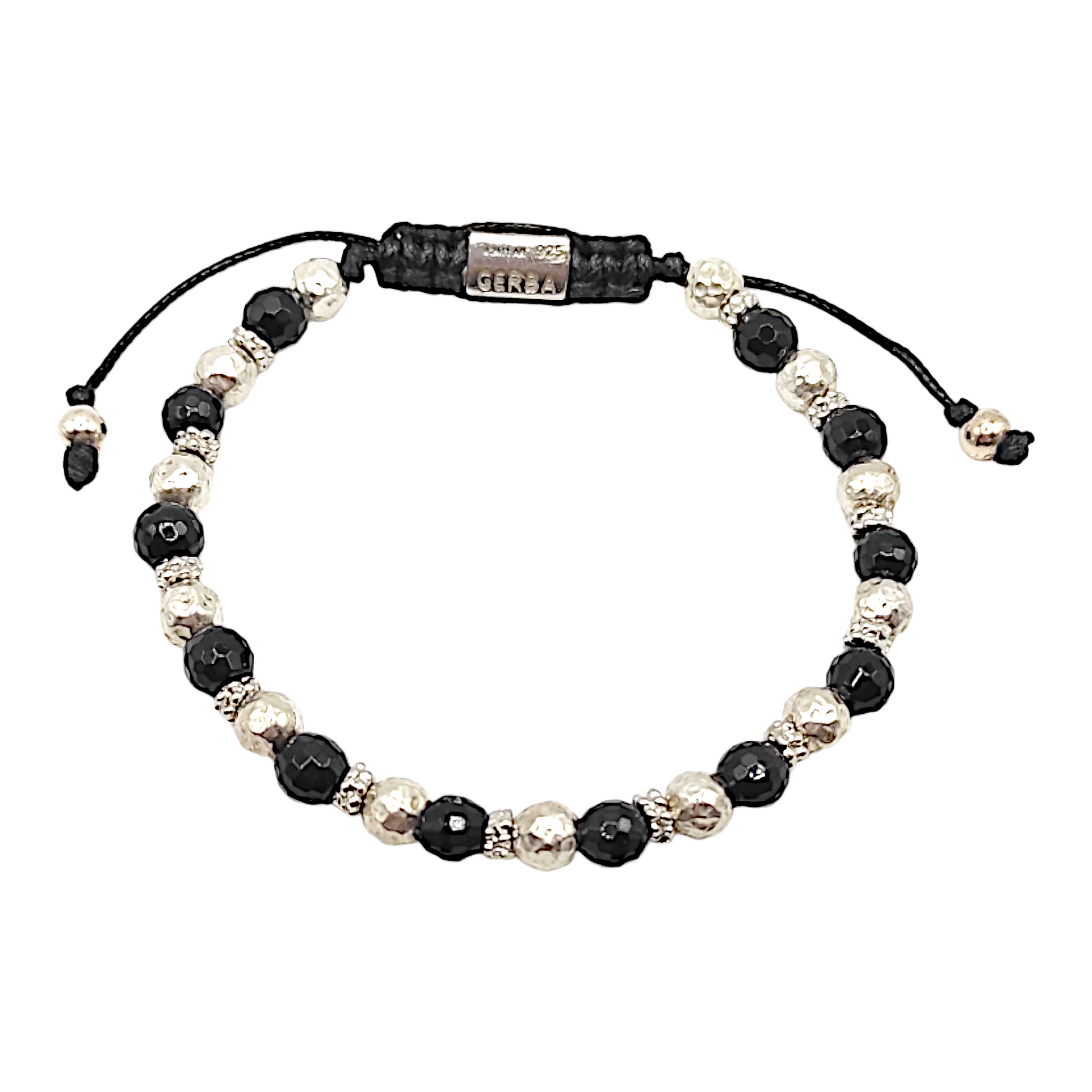 Bracciale da uomo della collezione Stone di Gerba realizzato a mano con sfere in pietre naturali di Onice nera alternate a sfere in argento . Il bracciale ha una base in filo cerato e una chiusura scorrevole. Diametro pietre 6 mm