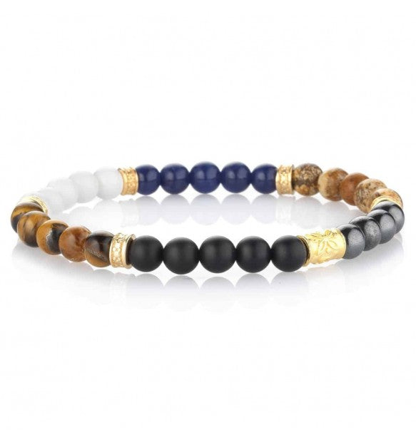 Bracciale da uomo della collezione Victor di Gerba realizzato a mano con sfere in pietre naturali di Occhio di Agata, Onice opaco, Ematite, Occhio di tigre e Paesina con componenti in Argento 925 placato oro. Il bracciale ha una base in filo elasticizzato, diametro pietre 6 mm