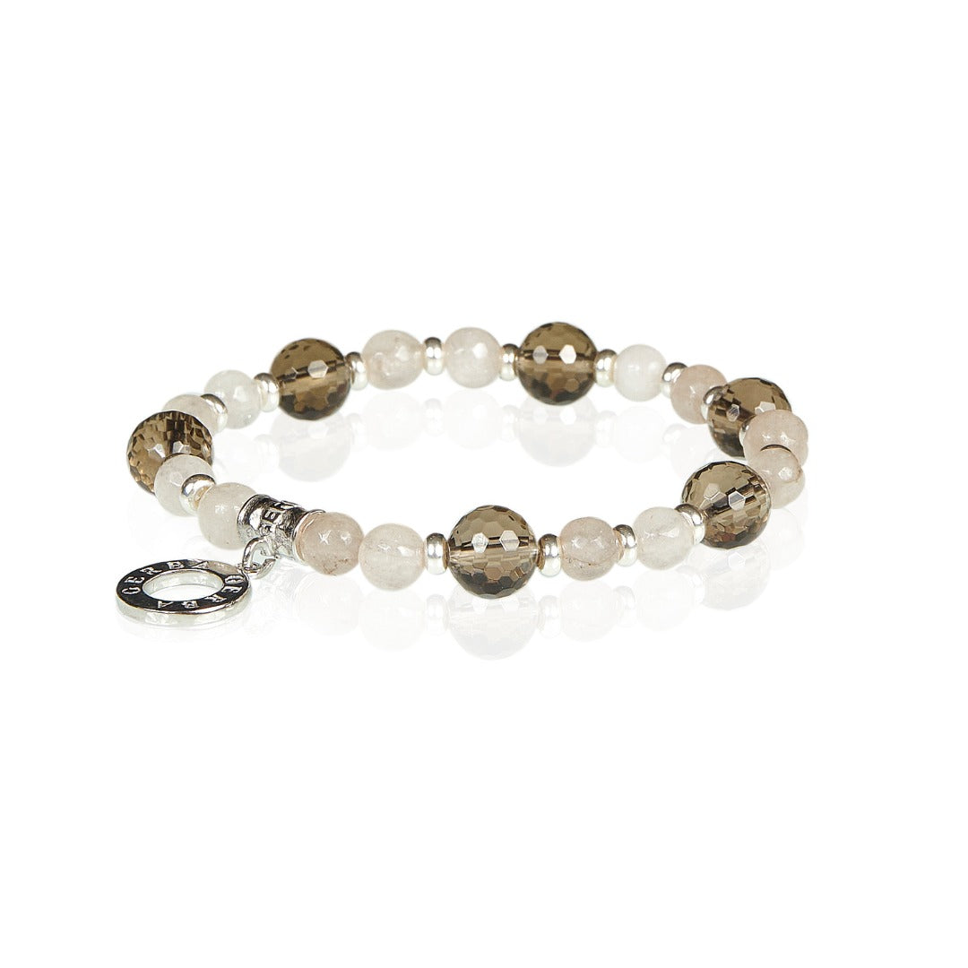 Bracciale da donna della collezione Elodie di Gerba. Bracciale elastico con quarzo fumè e grigio chiaro con elementi in argento. Diametro delle pietre 6 mm.