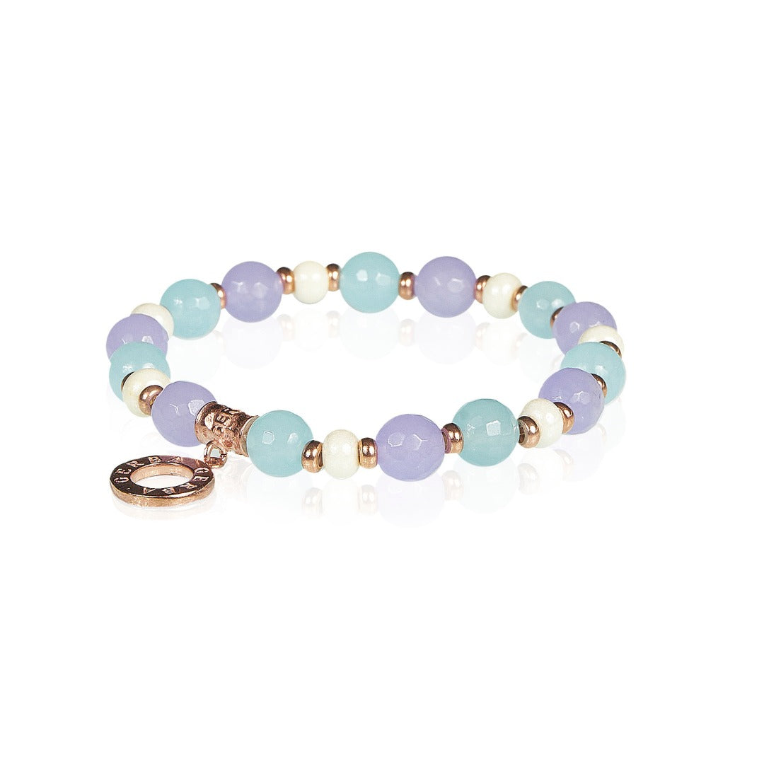 Bracciale da donna della collezione Romy di Gerba. Bracciale elastico con giada celeste, lilla e murrina di colore bianco perlato con elementi in argento rosato. Diametro delle pietre 6 mm.