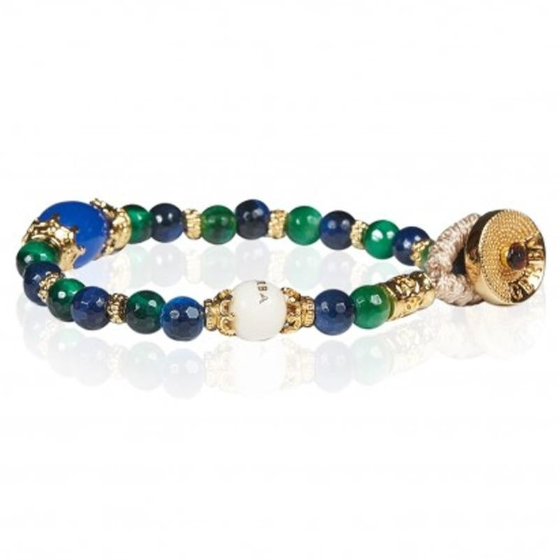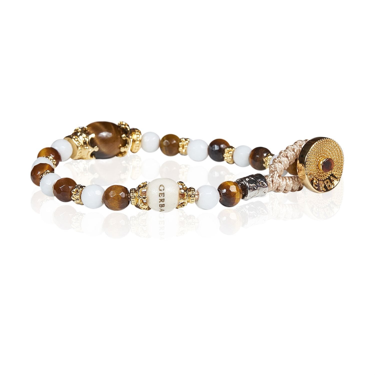 Bracciale unisex della collezione Corona di Gerba. Bracciale realizzato con cordino in filo cerato con sfere di pietre naturali di occhio di tigre verde e blu o occhio di tigre marrone e agata bianca e componenti in bronzo dorato, chiusura a bottone in bronzo dorato. Diametro delle pietre 6 mm.