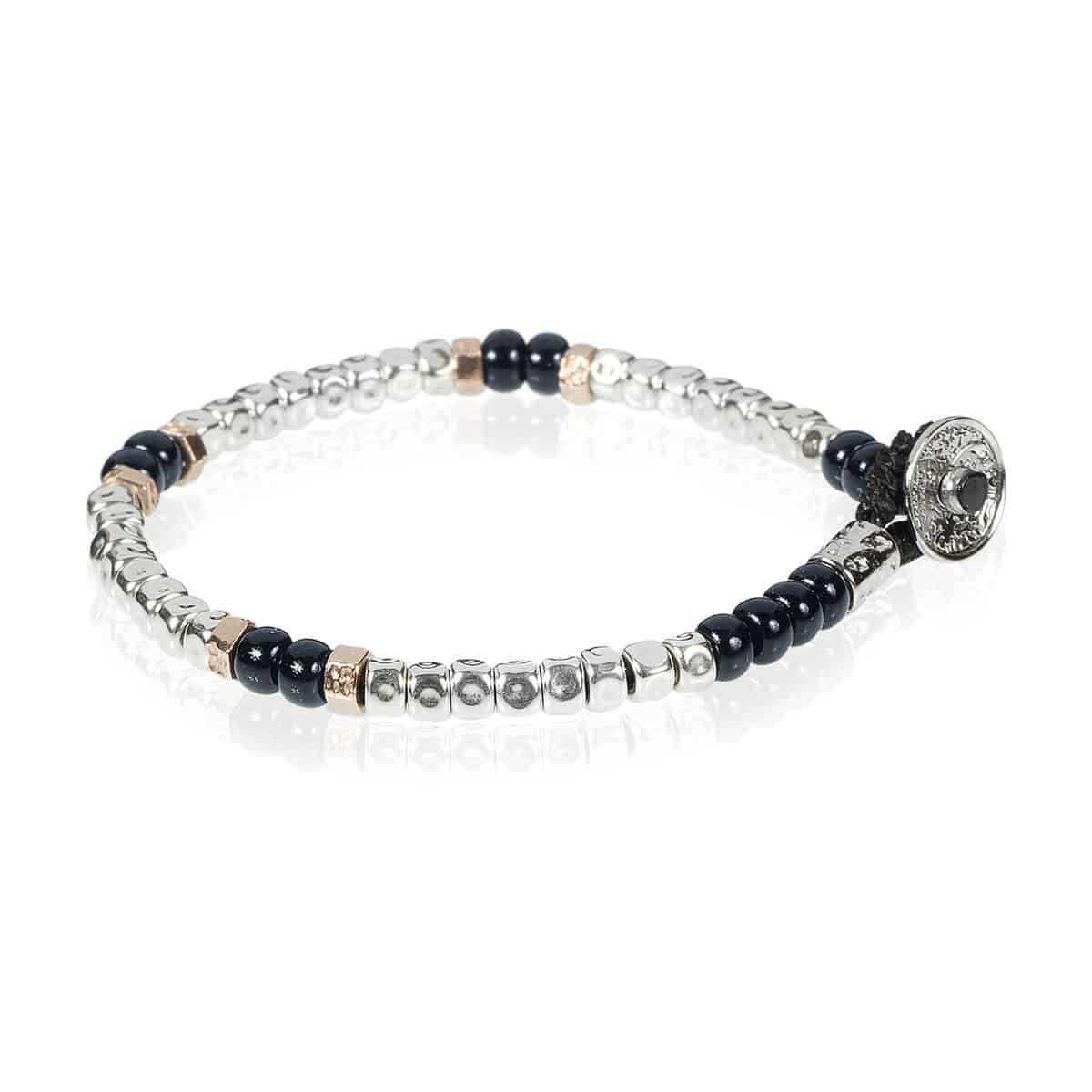 Bracciale unisex della collezione Silver di Gerba realizzato in filo cerato di colore nero con pepite in argento 925 e murrine. Lunghezza bracciale 21 cm, chiusura a bottone.