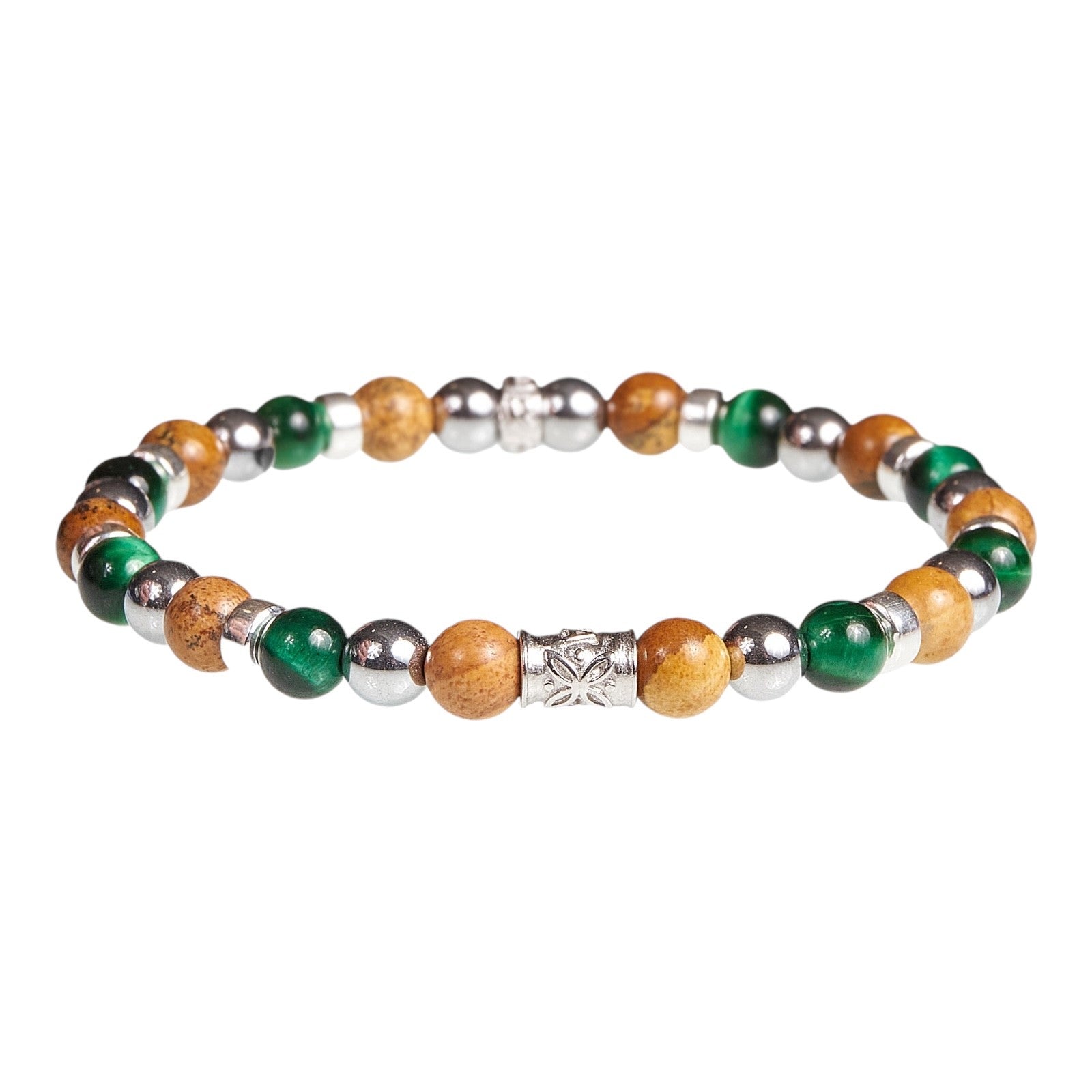 Bracciale da uomo della collezione Elastic Farrel di Gerba. Bracciale realizzato a mano con sfere di pietre naturali di paesina, ematite chiara, occhio di tigre verde e componenti in argento. Il bracciale ha una base in filo elastico. Diametro delle pietre 6 mm.