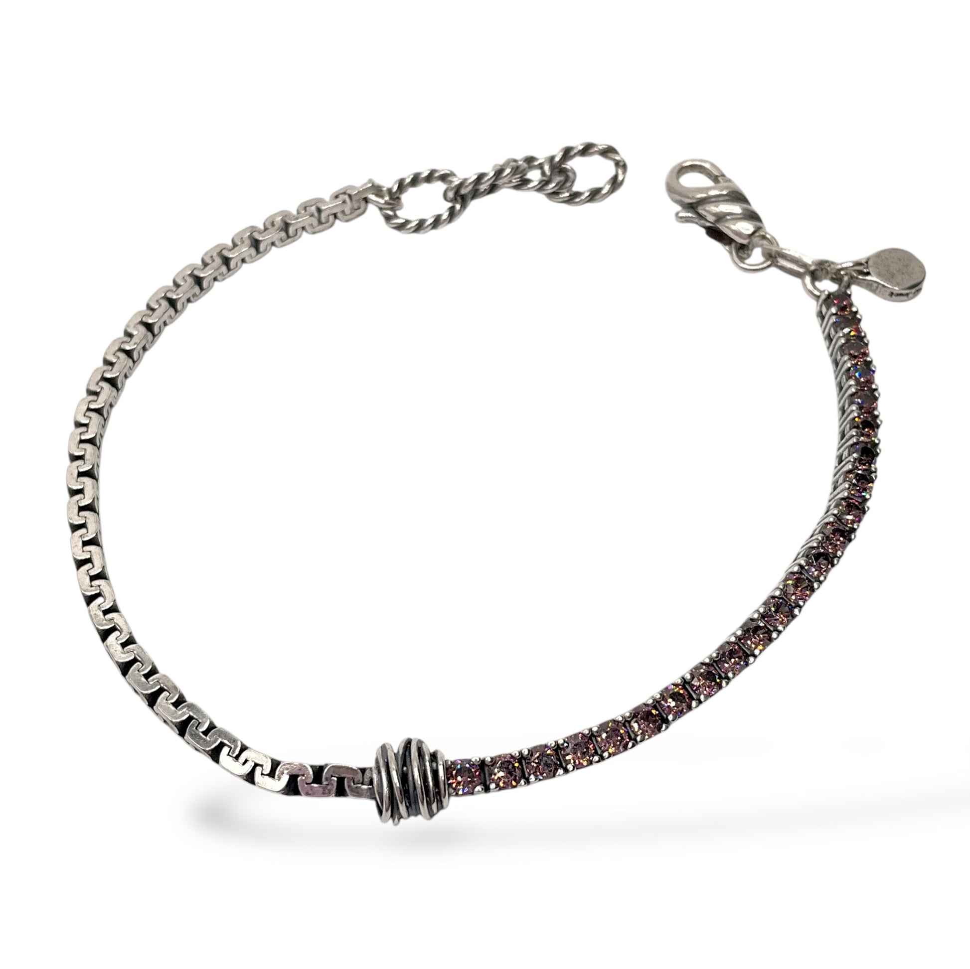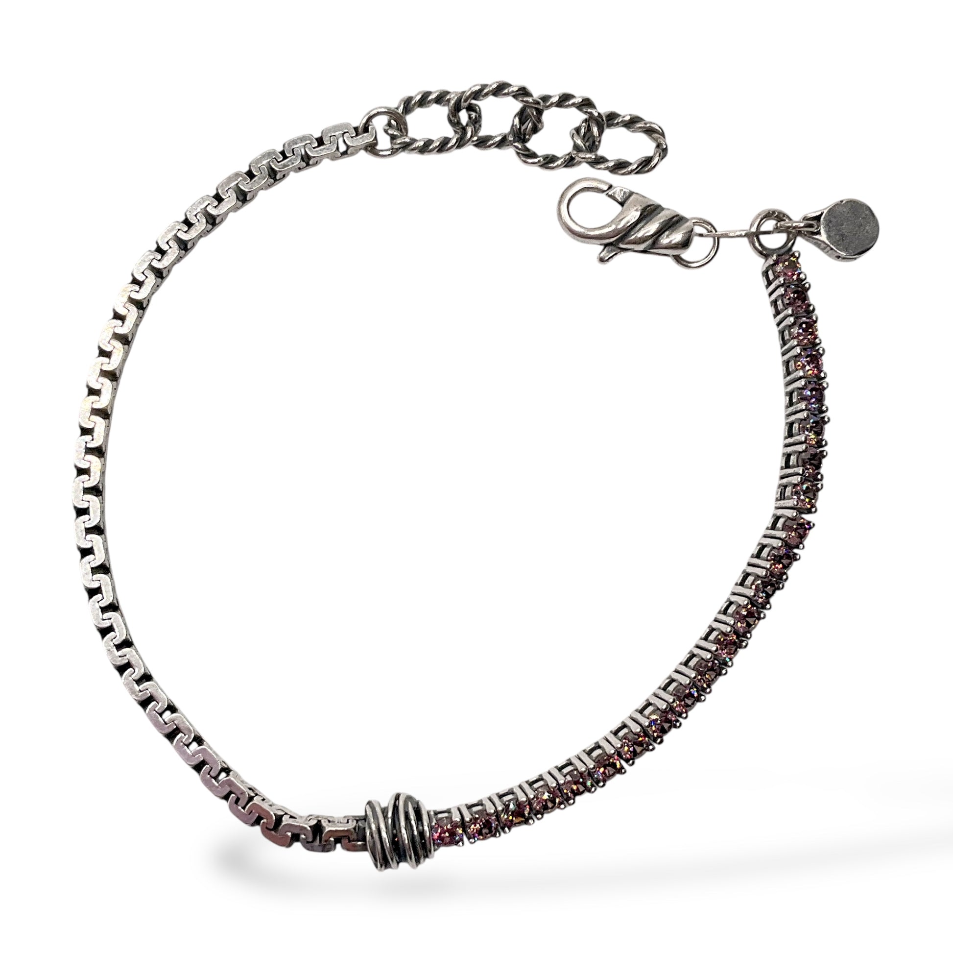 Bracciale da uomo in argento con rifiniture in argento brunito, è diviso in due parti da un elemento in argento, una parte ha una maglia greca quadrata mentre l'altra tennis con pietre colore fumè.