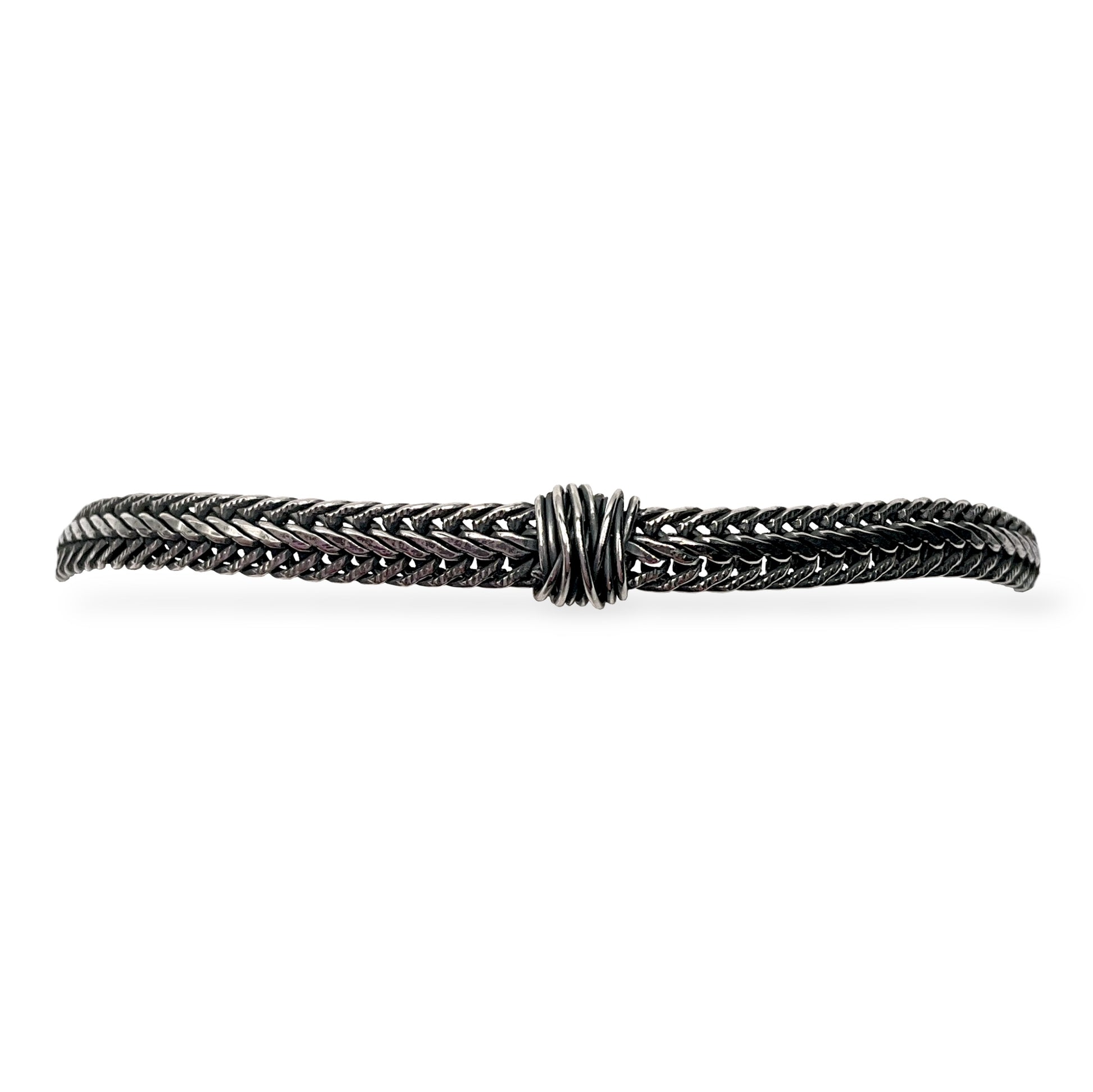 Bracciale da uomo in argento e argento brunito, catena a maglia piatta lavorata con elemento in argento centrale.