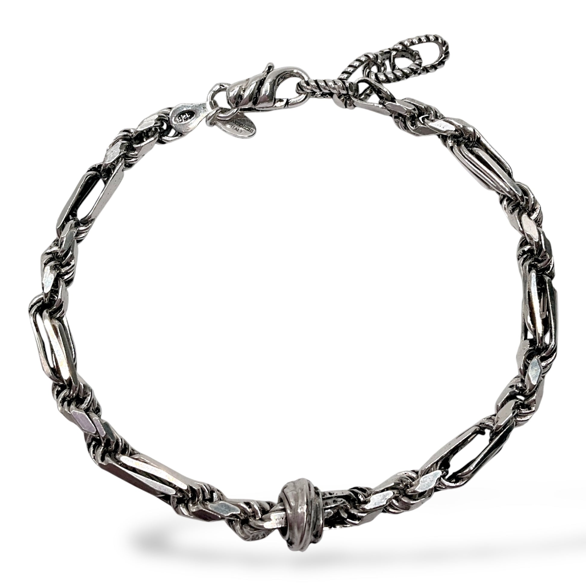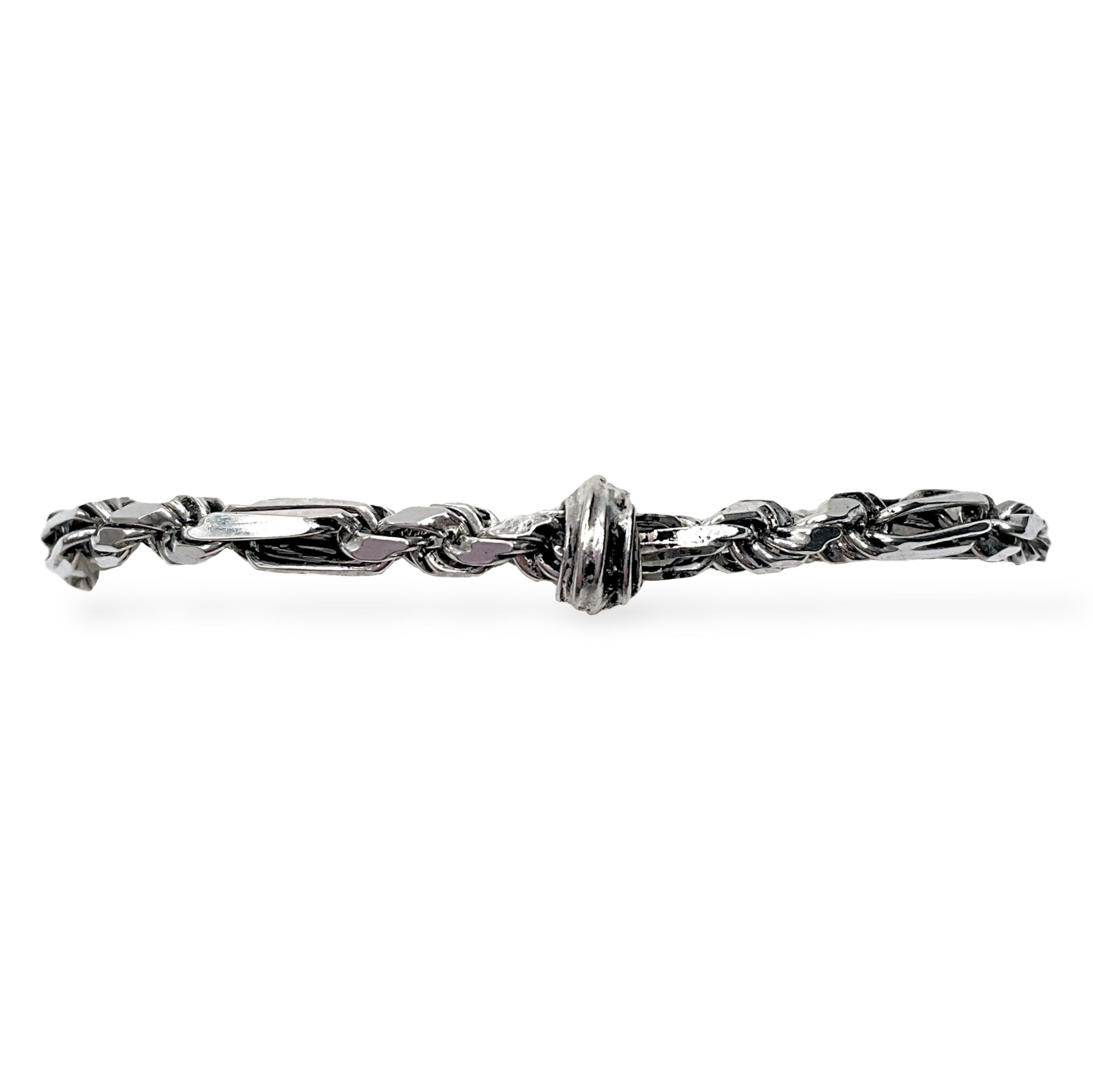 Bracciale da uomo in argento con rifiniture in argento brunito, elemento centrale, catena a corda alternata.