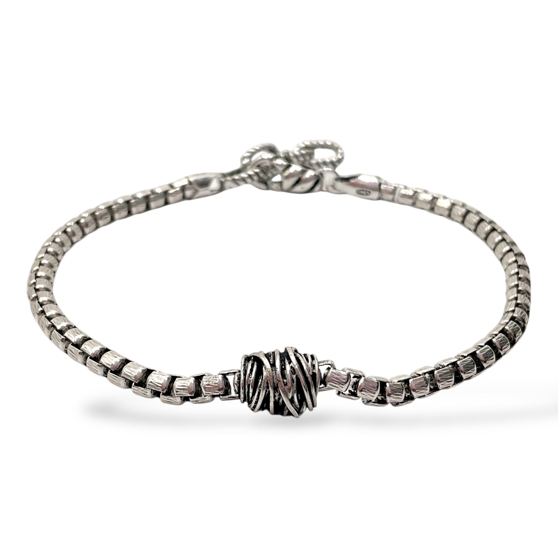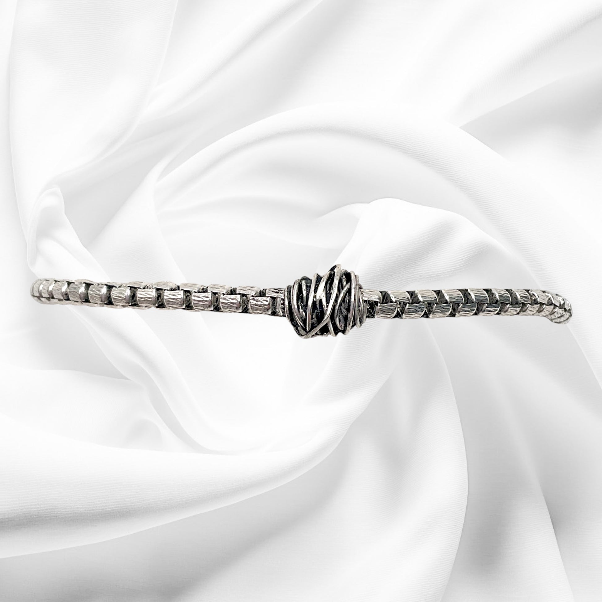 Bracciale da uomo in argento con rifiniture in argento brunito, catena a maglie lavorata con elemento in argento centrale.