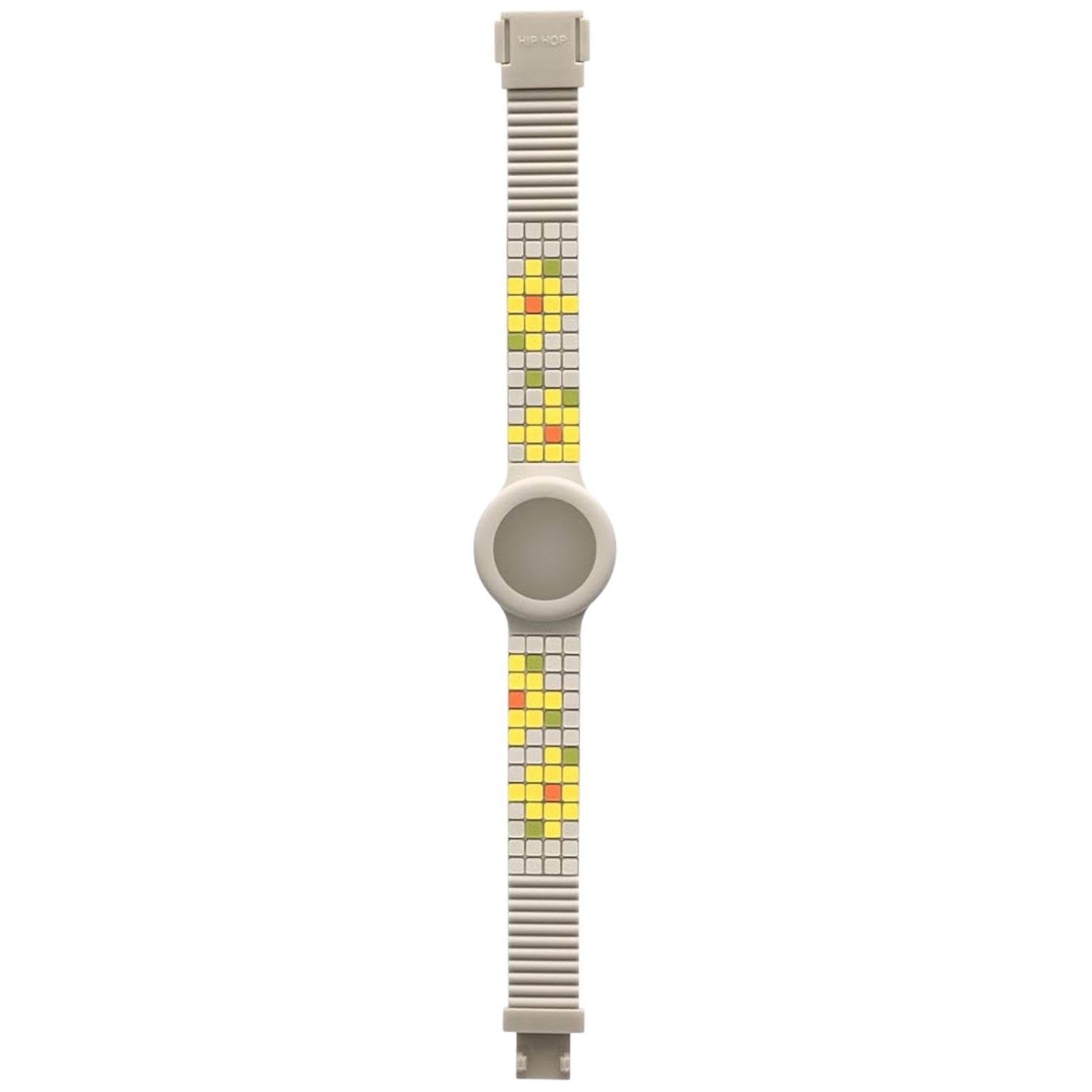 Cinturino in silicone per orologio Hip Hop Mosaico, base sabbia con mosaico giallo, arancione e verde per cassa 32 mm. Facilmente accorciabile tagliandolo nelle linee guida. Chiusura in plastica con pulsanti laterali.