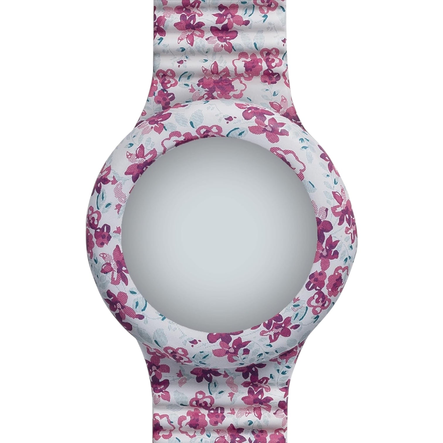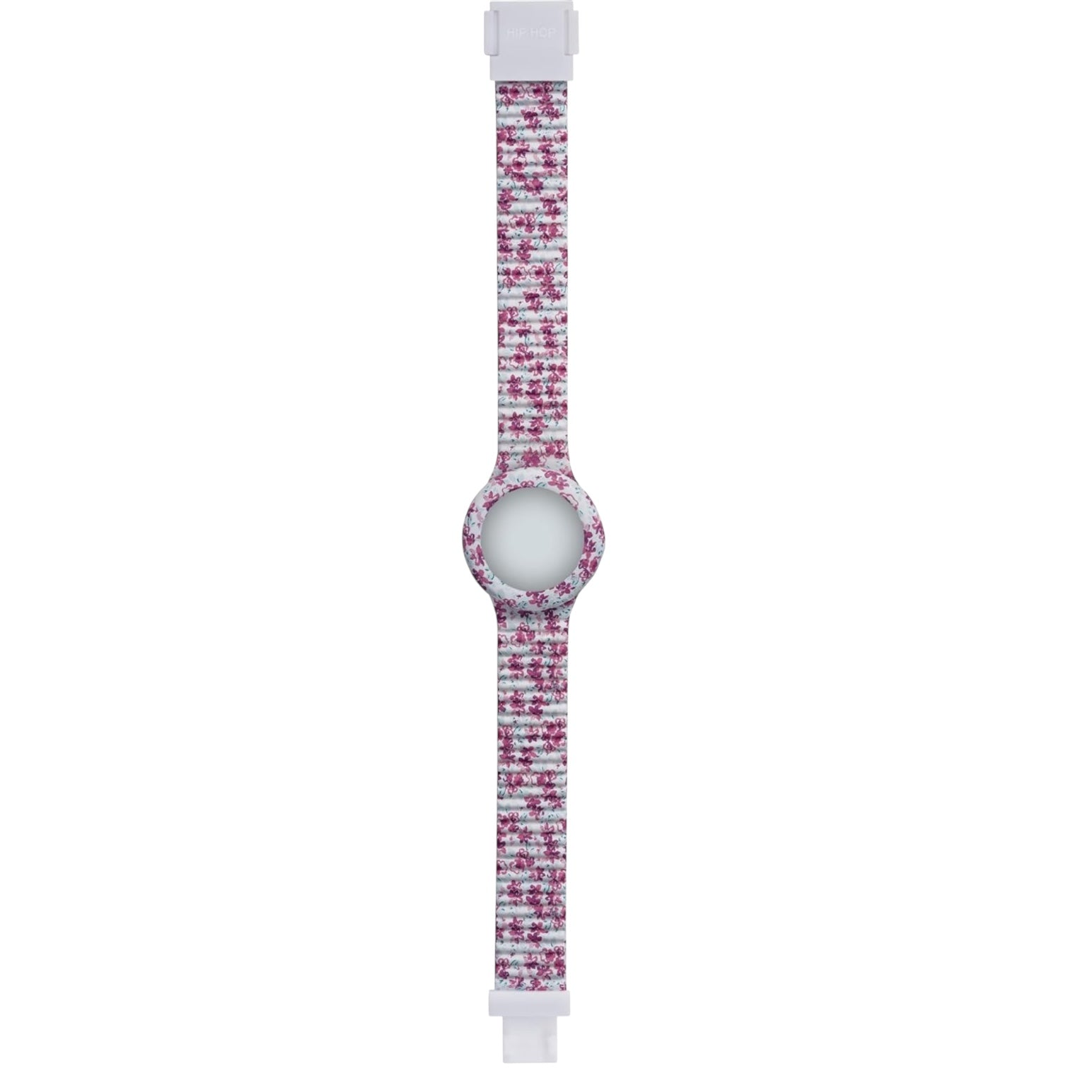 Cinturino in silicone per orologio Hip Hop della linea Spring, base bianca con fiorellini per cassa 32 mm. Facilmente accorciabile tagliandolo nelle linee guida. Chiusura in plastica con pulsanti laterali.