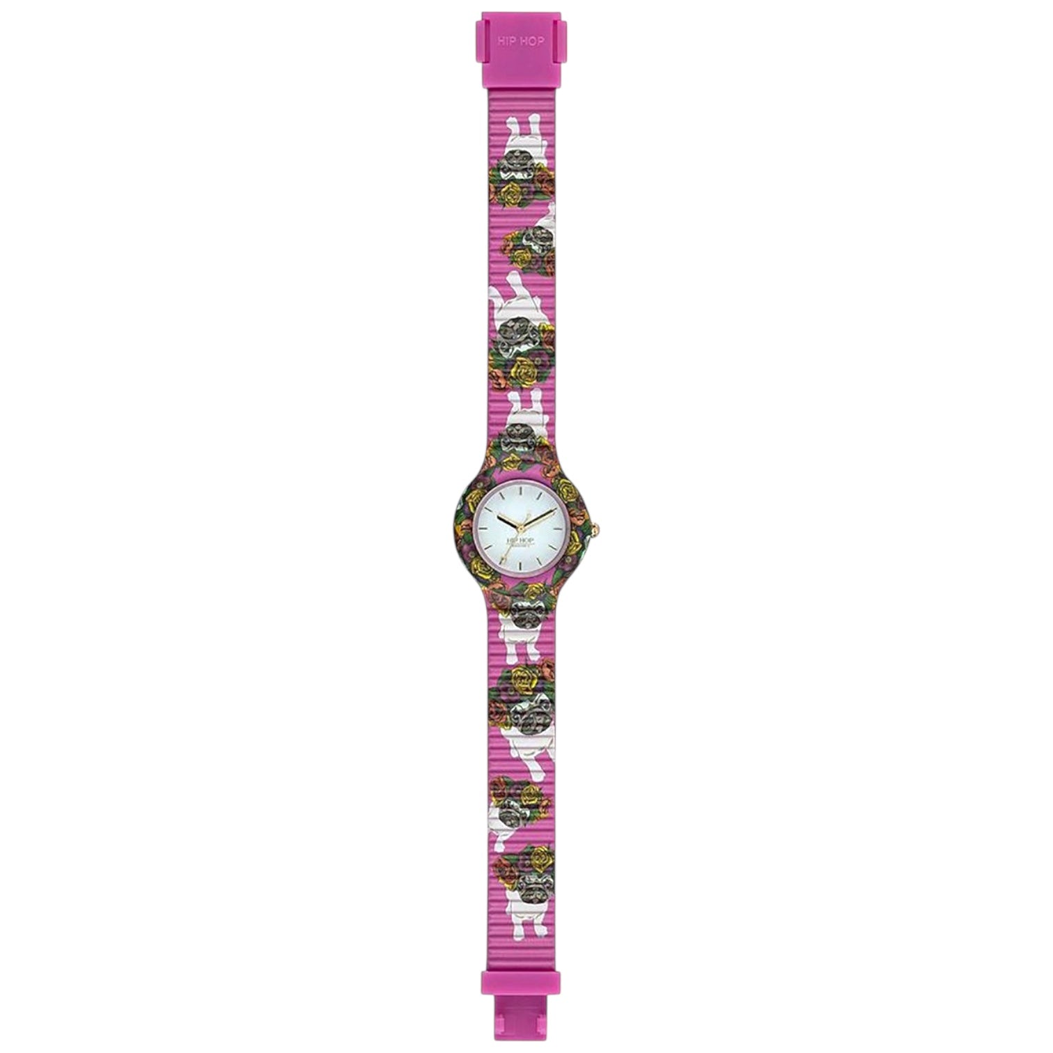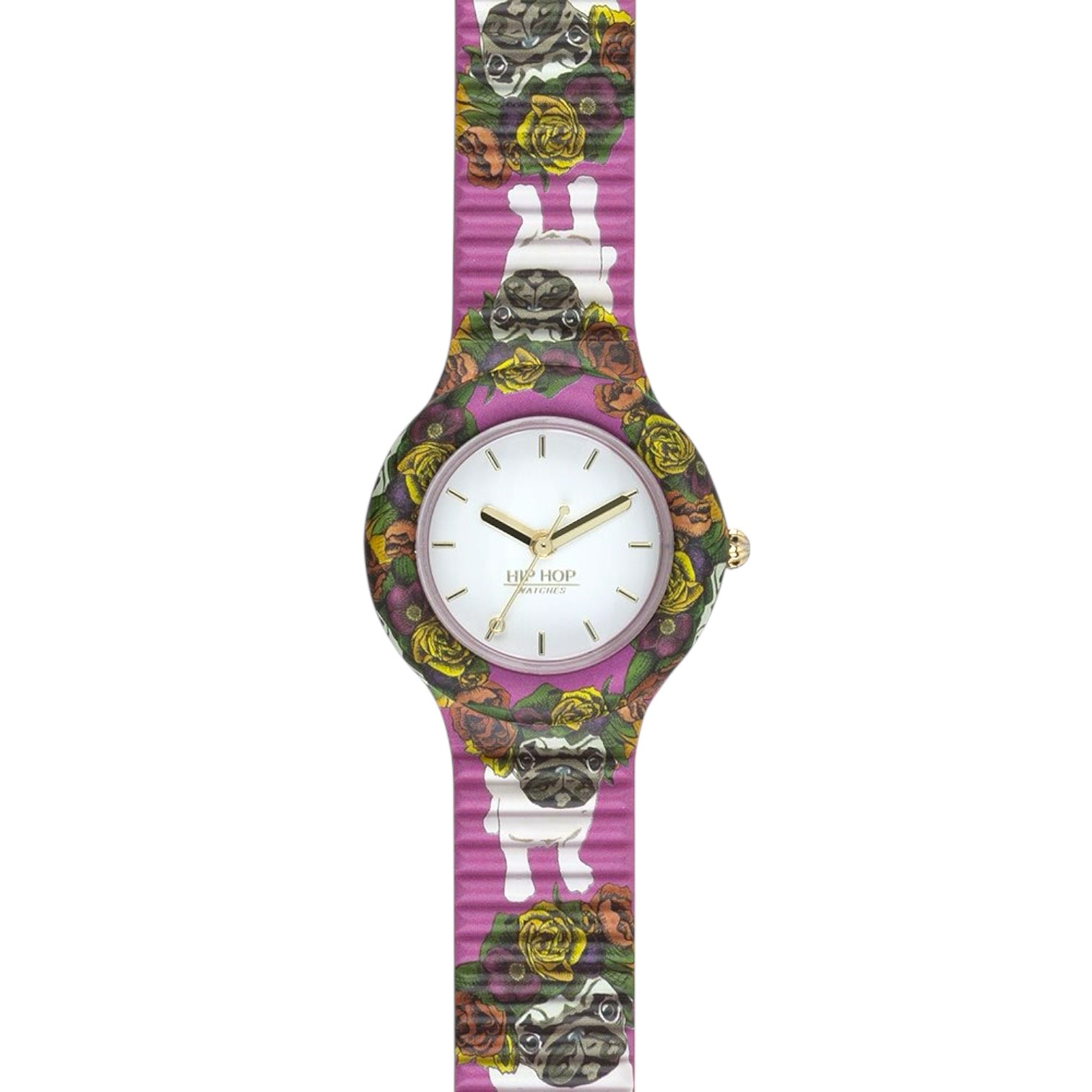 Orologio da donna di Hip Hop Flower Dog. Cassa in plastica del diametro di 32 mm, quadrante bianco con indici gold, sfere gold. Cinturino in silicone base fucsia con cane carlino e corona di fiori, facilmente accorciabile tagliandolo nelle linee guida. Chiusura in plastica con pulsanti laterali. Movimento solo tempo al quarzo, resistenza all'acqua 5 atm.
