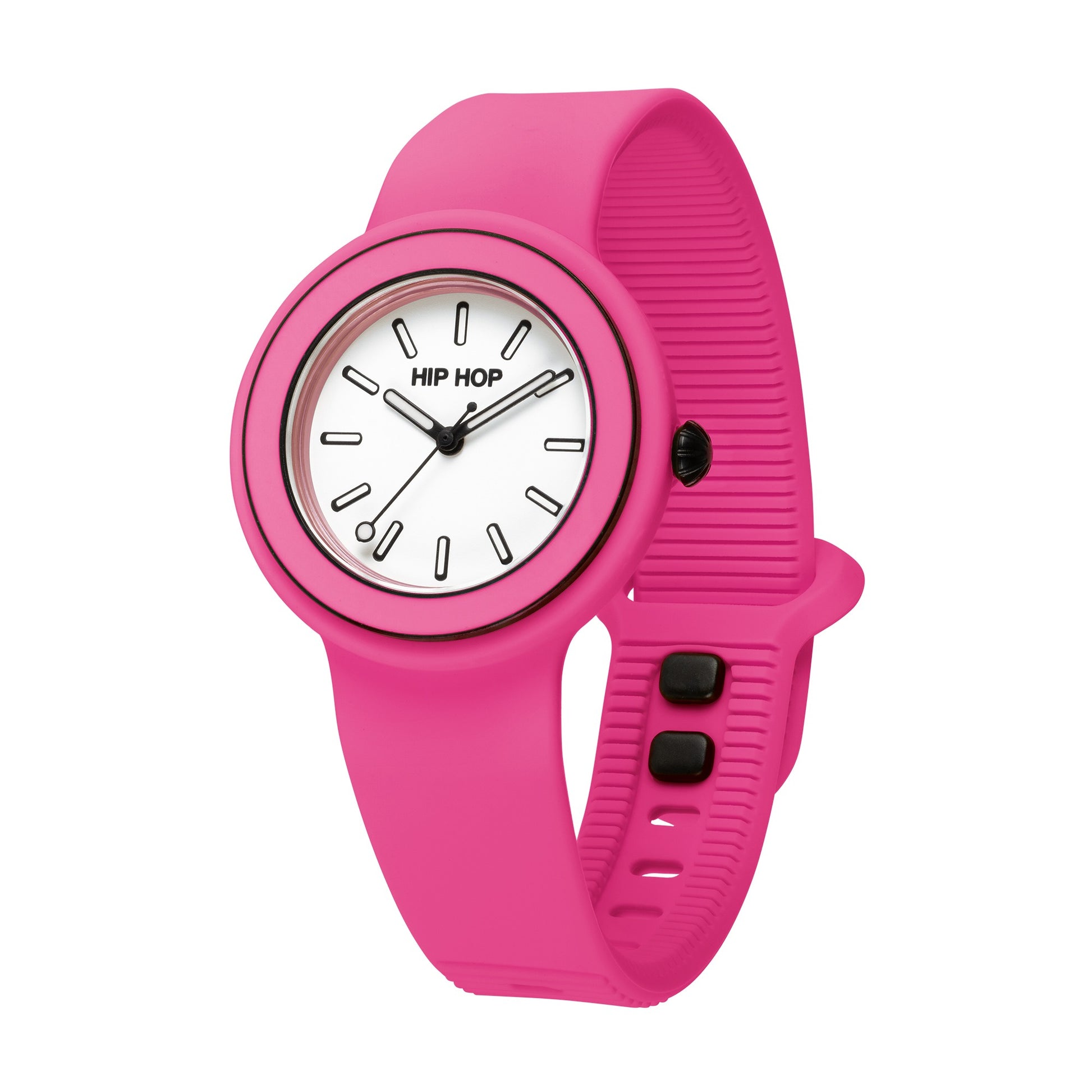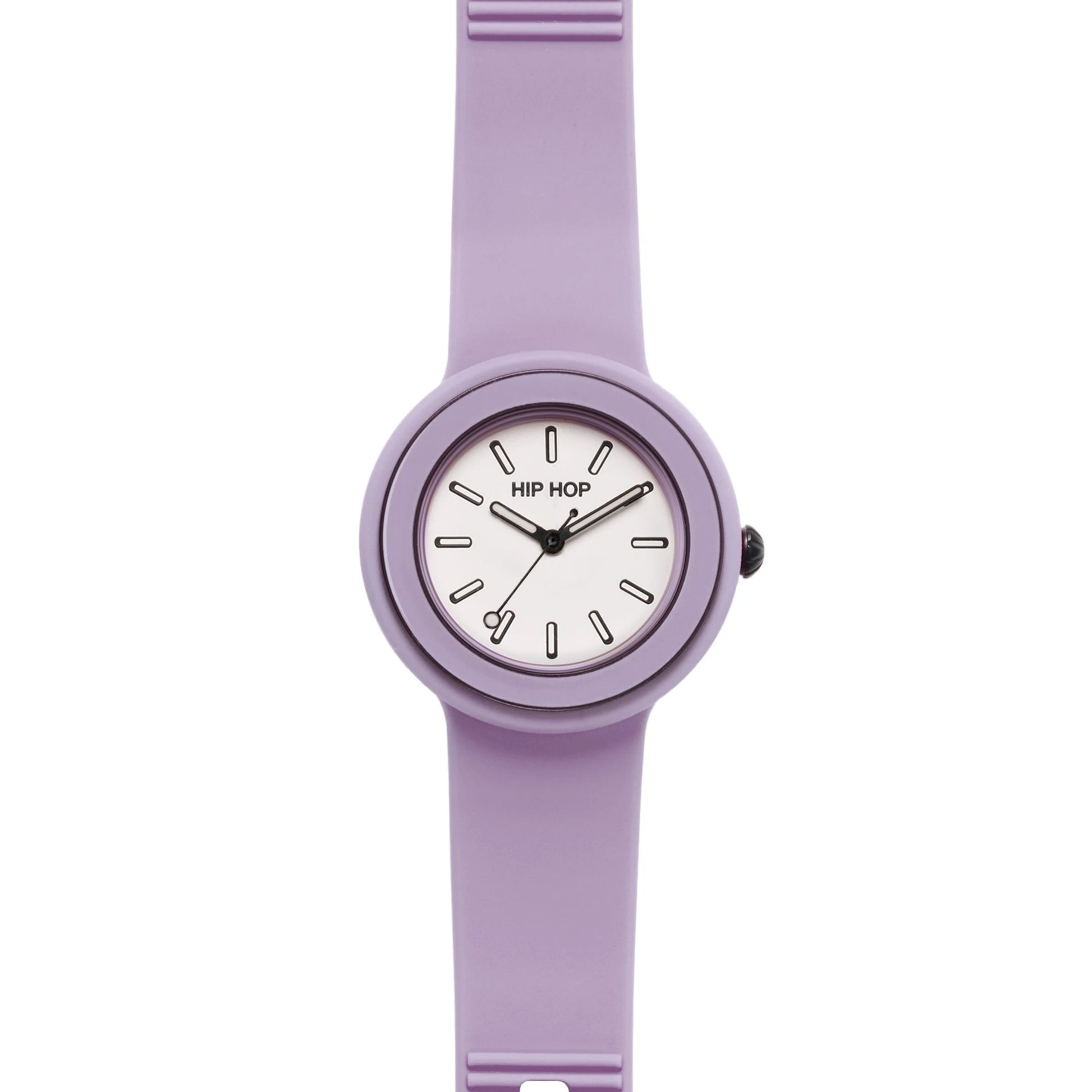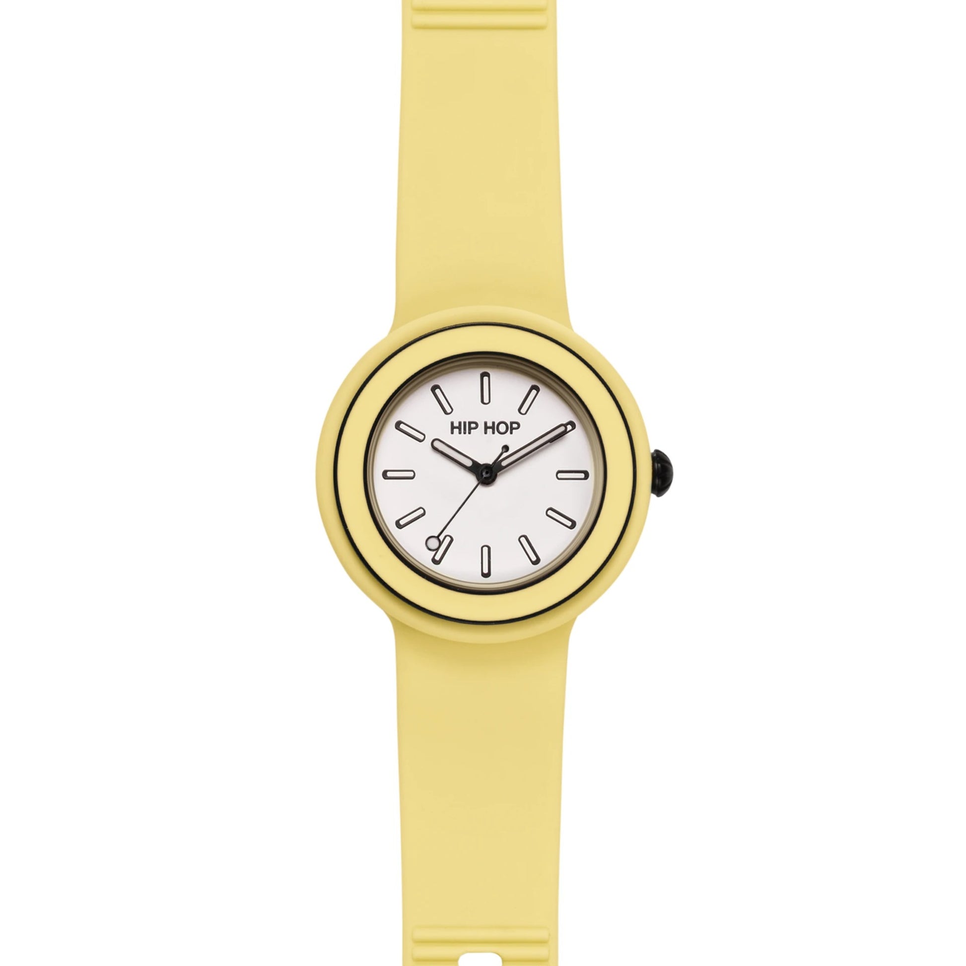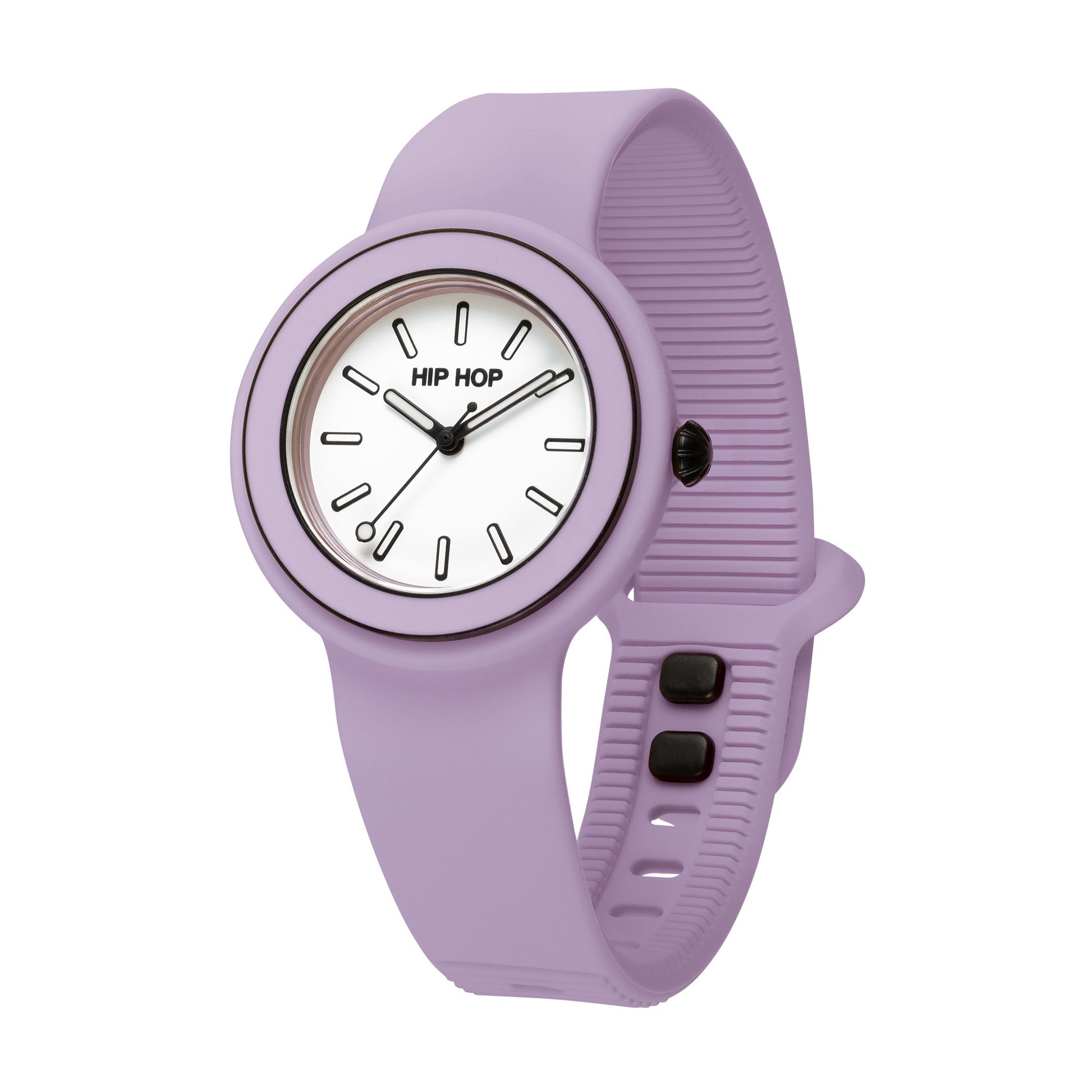 Orologio da donna di Hip Hop Hero.Dot Bezel. Cassa in plastica del diametro di 34 mm con lunetta in metallo con inserto in resina traslucida, quadrante bianco con indico bianchi e neri, sfere bianche e nere. Cinturino in silicone giallo, rosa o lilla, chiusura a bottone in metallo. Movimento solo tempo al quarzo, resistenza all'acqua 5 atm.