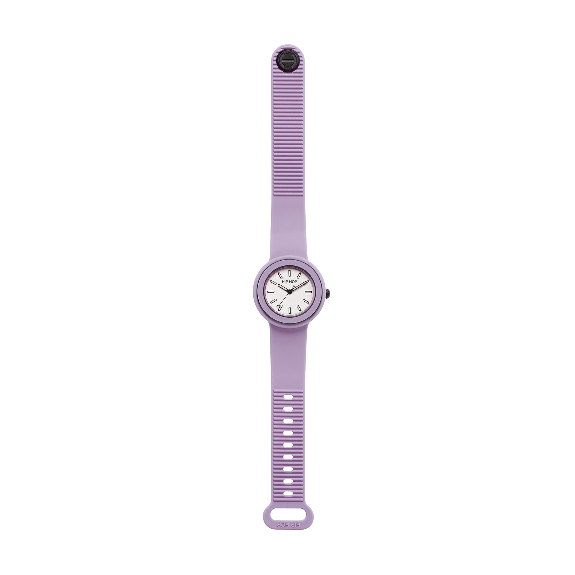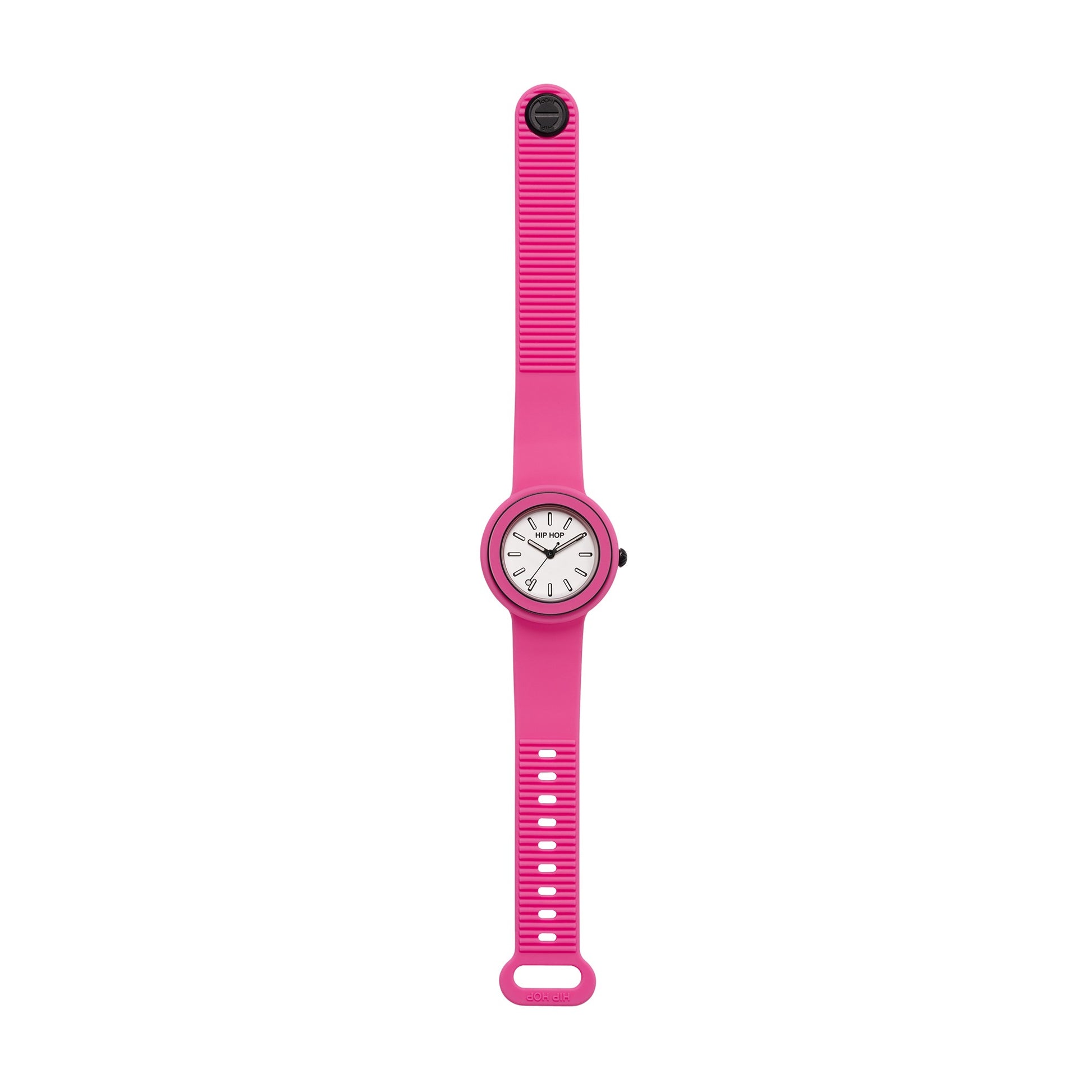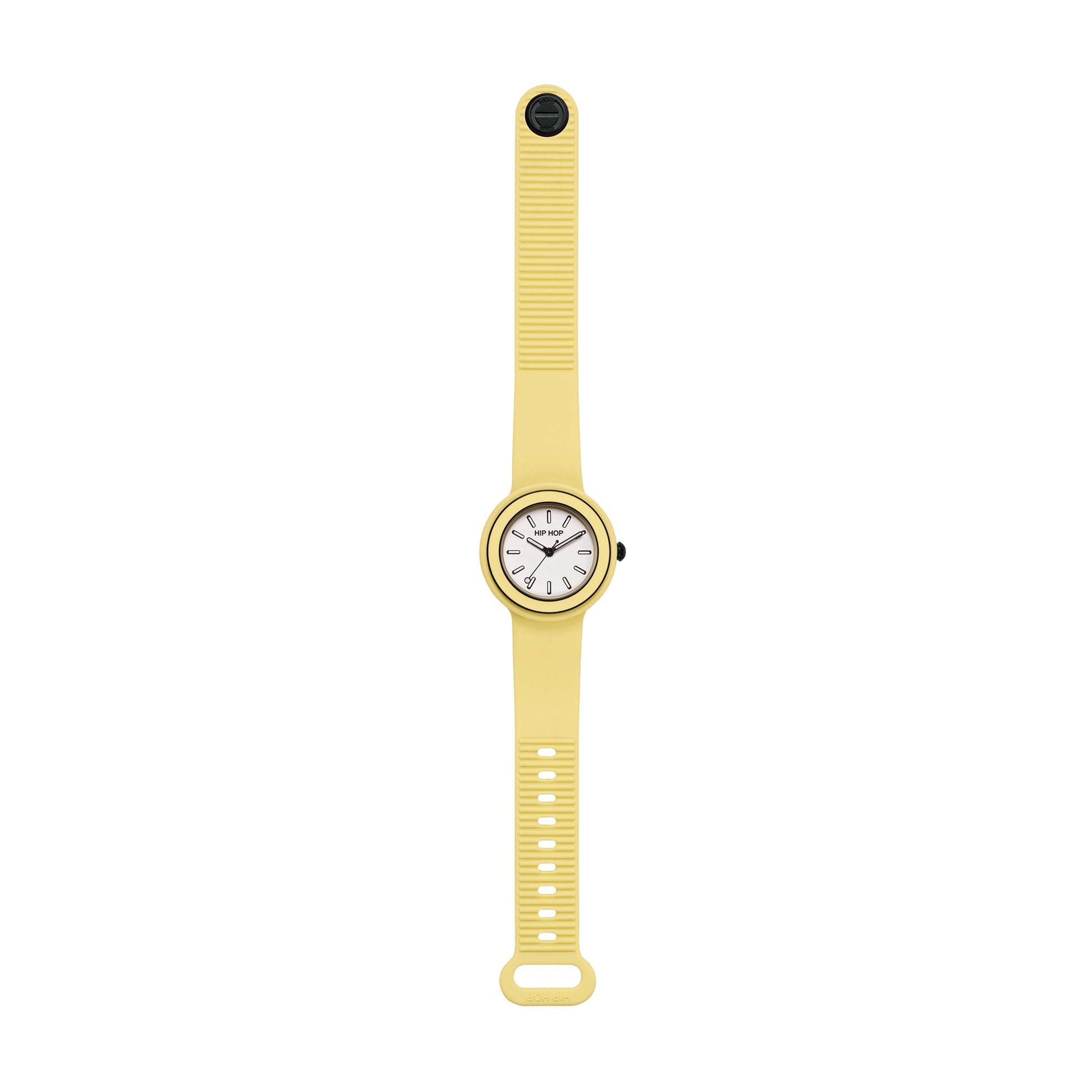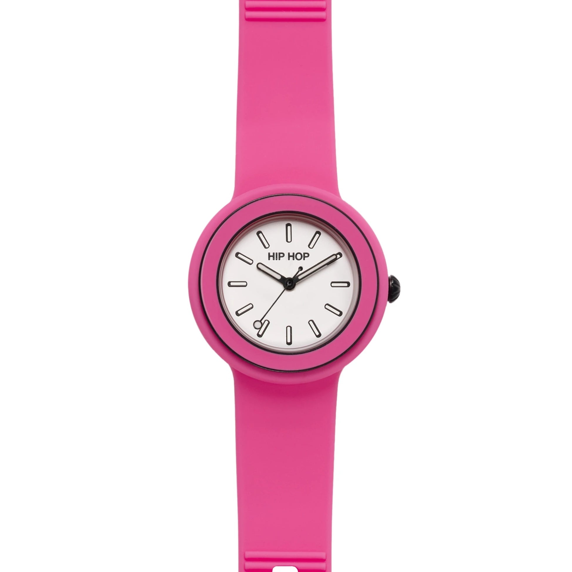 Orologio da donna di Hip Hop Hero.Dot Bezel. Cassa in plastica del diametro di 34 mm con lunetta in metallo con inserto in resina traslucida, quadrante bianco con indico bianchi e neri, sfere bianche e nere. Cinturino in silicone giallo, rosa o lilla, chiusura a bottone in metallo. Movimento solo tempo al quarzo, resistenza all'acqua 5 atm.
