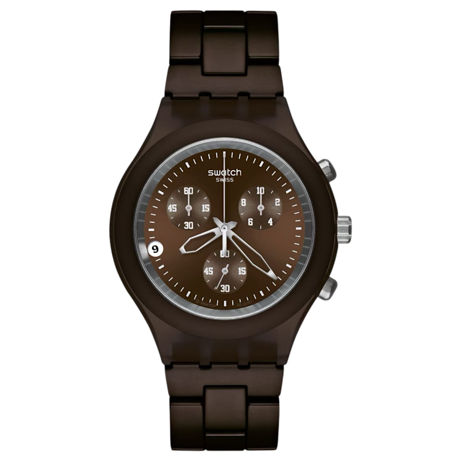 Orologio cronografo unisex di Swatch della collezione Irony Diaphane Full-Blooded Smoky Brown. Cassa in platica con ghiera in alluminio satinato marrone scuro del diametro di 43 mm, quadrante marrone scuro e indici bianchi, sfere silver, cinturino in alluminio marrone scuro, chiusura di sicurezza in alluminio. Resistenza all'acqua 3 bar. Movimento al quarzo Swiss Made.
